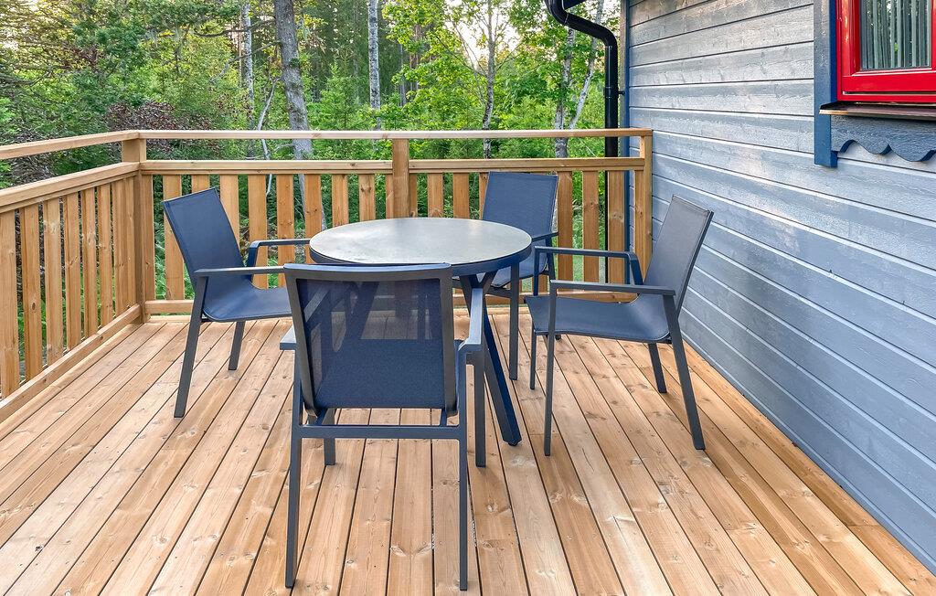 Nyd den indbydende atmosfære i dette charmerende træhus med overdækket veranda og hyggelig stue. Tilbring afslappende timer ved det runde spisebord, læs en god bog i lænestolen eller afslut dagen med et fælles måltid i komfortable omgivelser. Slap af omgivet af natur og ro, og brug huset som et behageligt tilflugtssted efter aktive dage i den friske luft.