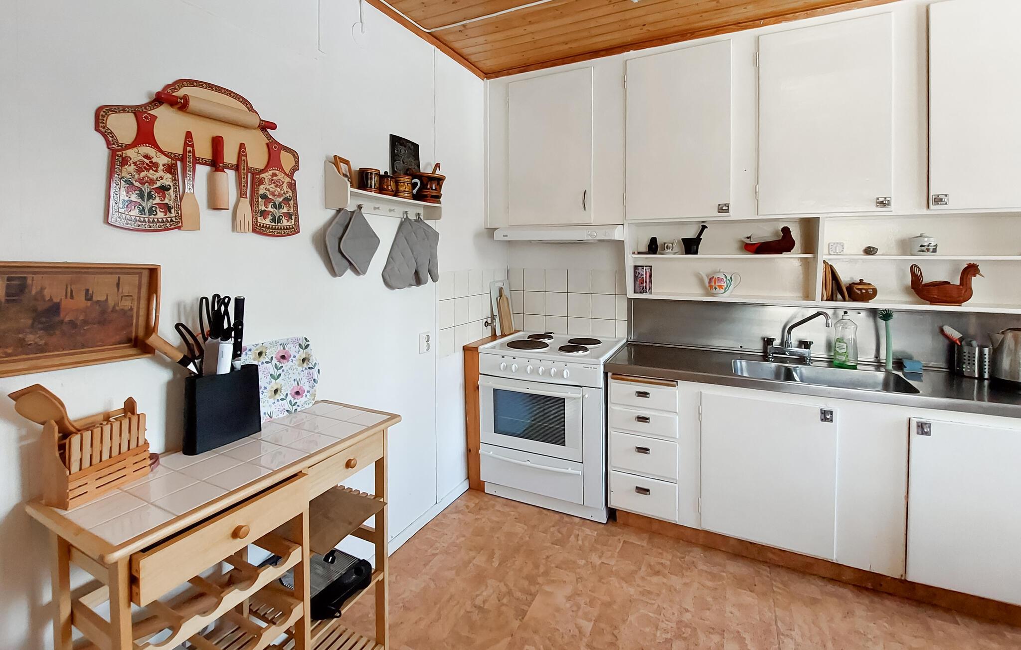 Dette charmerende feriehus i Vittsjö, omgivet af en stor have, byder på en smuk blanding af komfort og natur. Nyd jeres morgentimer i den lyse vinterhave, hvor komfortable siddepladser og et spisebord giver plads til afslappede måltider eller hyggelige læsetimer. Nyd de varme solstråler, der strømmer ind gennem de store vinduer og nyd udsigten til de grønne omgivelser. Den rummelige stue er også et sted at slappe af. Find jer godt til rette i den store sofa og nyd varmen fra pejsen, som skaber en hyggelig atmosfære på kølige aftener. En rustik lysekrone giver også rummet et elegant præg. I kan tilberede regionale specialiteter i det veludstyrede spisekøkken. Nyd jeres måltider i den integrerede spiseplads, som udstråler en charmerende skandinavisk karakter.