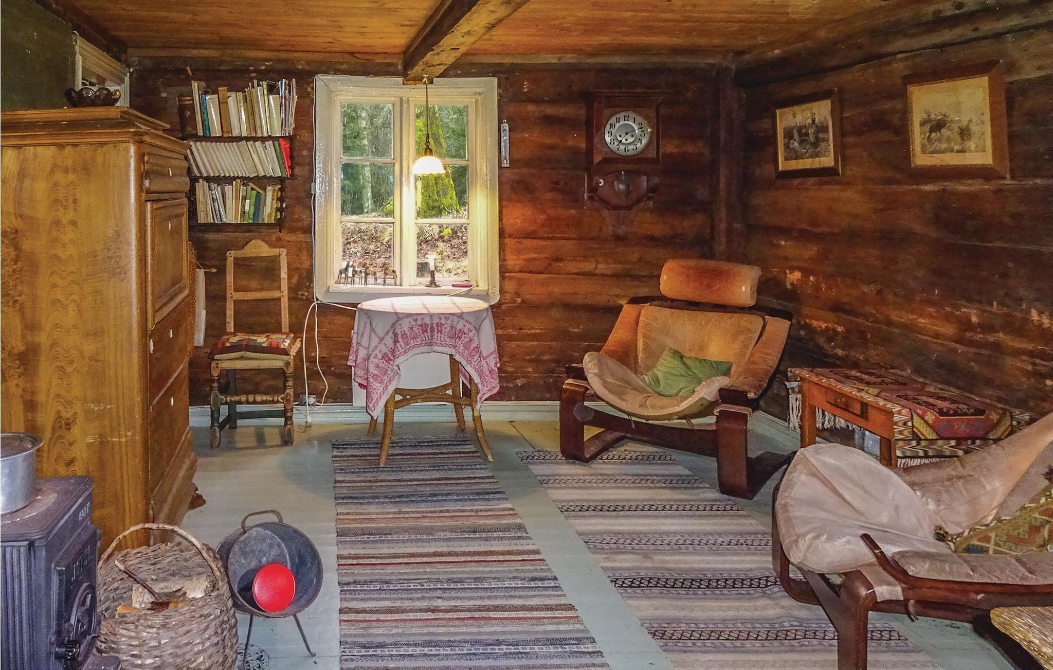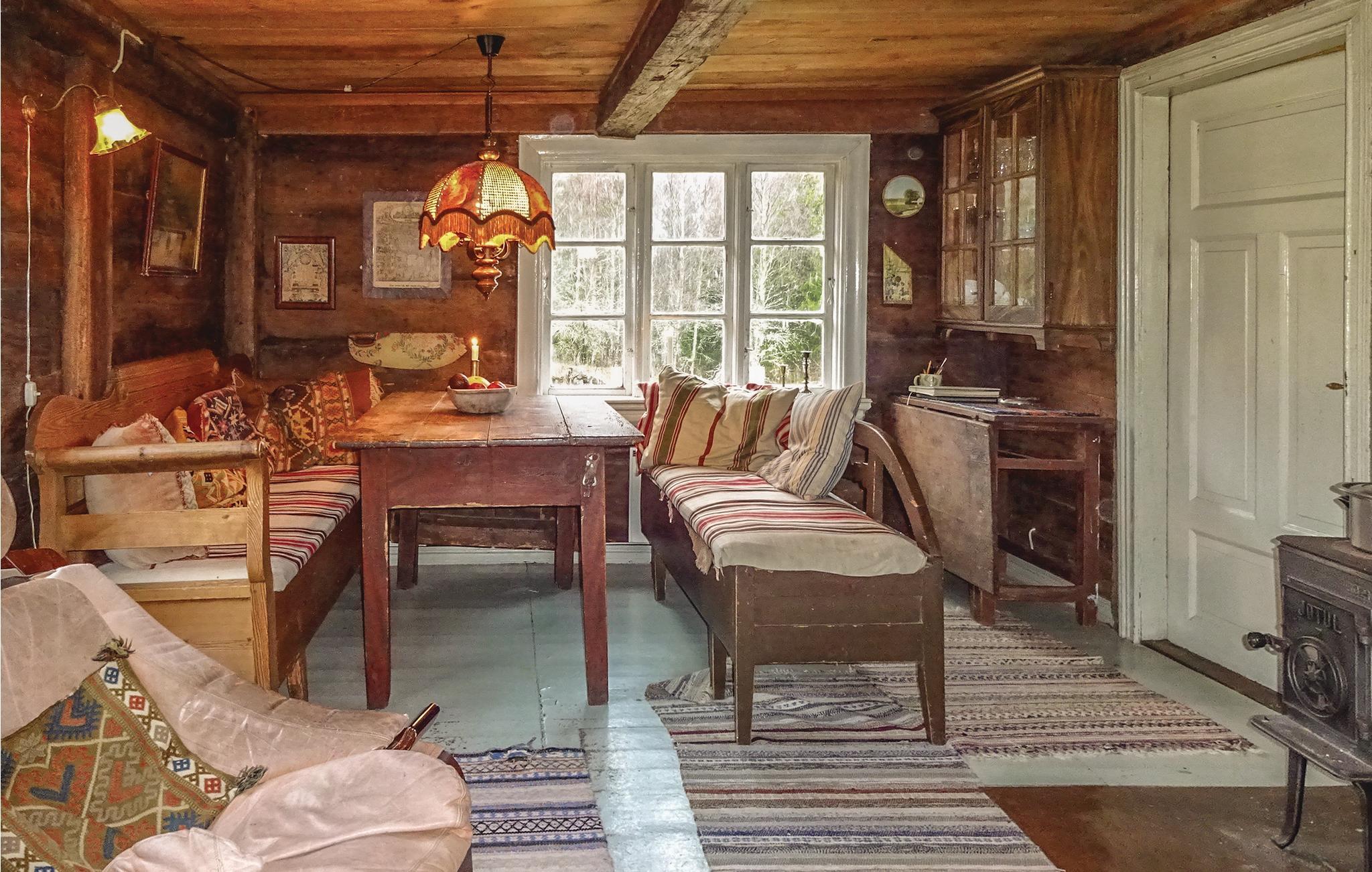 Dette feriehus ligger ugeneret på en stor skovarejendom og tilbyder jer en naturlig pause midt i den svenske natur. Glæd jer til det rustikke interiør med trævægge, historiske møbler og komfortable siddepladser. I stuen skaber brændeovnen og brændeovnen en hyggelig atmosfære, mens spisepladsen giver plads til fælles måltider. Køkkenet er enkelt udstyret, men funktionelt.