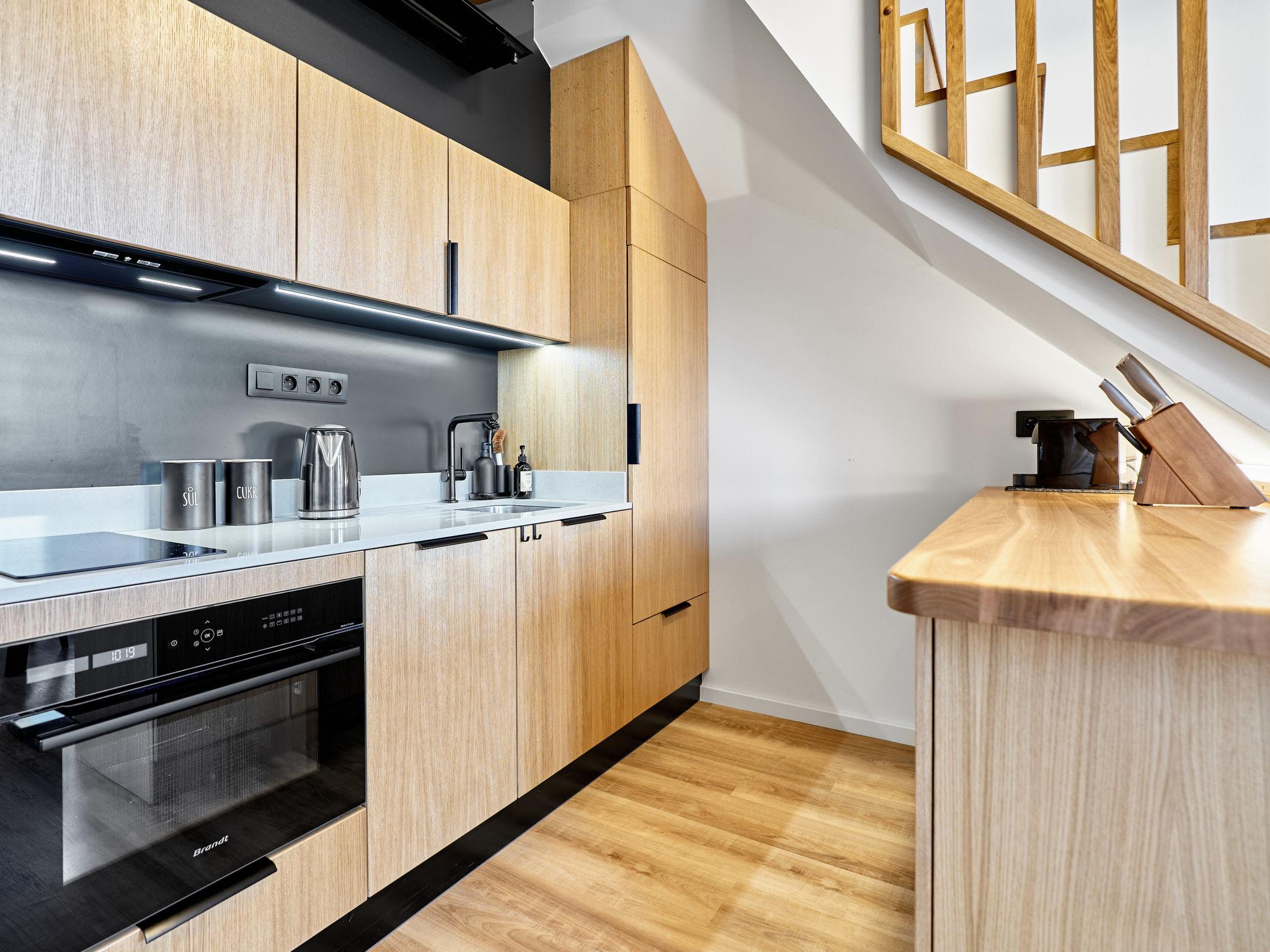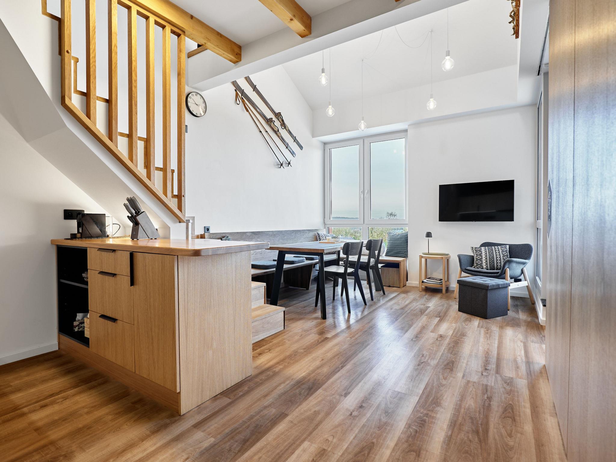 "Kozlík", 3-room maisonette 65 m2 on 2 levels on 4th floor. Bright, modern furnishings: entrance hall. 1 room with 1 double bed. Kitchen-/living room (oven, dishwasher, 4 ceramic glass hob hotplates, toaster, kettle, microwave) with dining table, TV and air conditioning. Upper floor: living room with TV. 1 room with 1 double bed. Shower/WC. Balcony. Balcony furniture. Facilities: hair dryer. Internet (WiFi, free). Parking. Please note: non-smokers only.