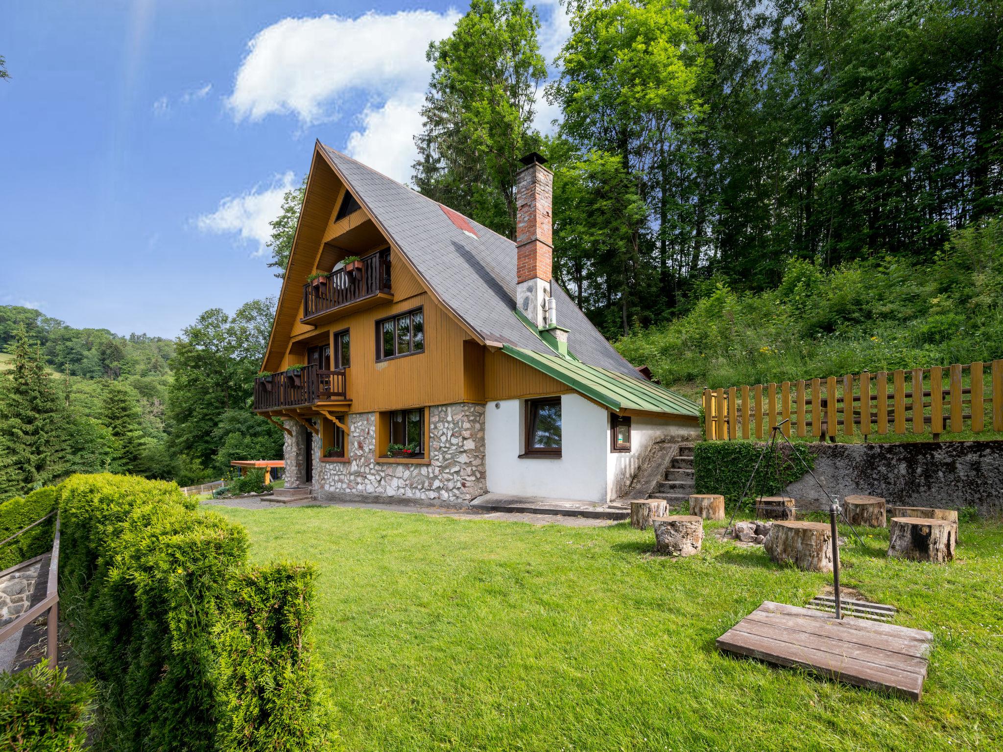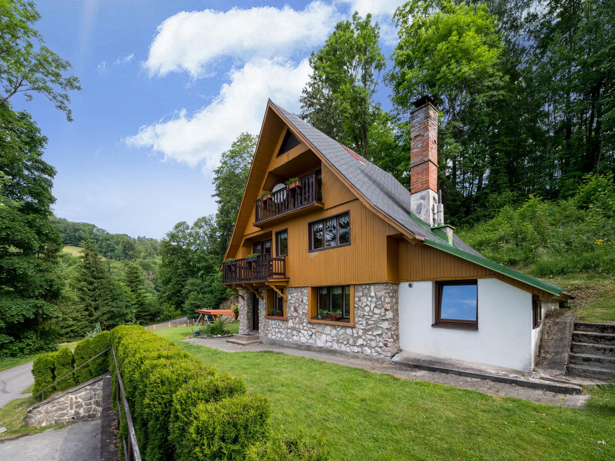 Mrklov 2 km from Benecko: Beautiful, cosy chalet "Mrklov", 3 storeys, detached, built in 1975, renovated in 2010. In a quiet, sunny, elevated position, 10 m from the edge of the forest, 800 m from the skiing area, in the countryside. Private: property 700 m2, garden with lawn. Pergola, garden furniture, barbecue, children's playground (swing, sandbox). In the house: trampoline, central heating system. Parking (for 2 cars) at the house. Shop 2 km, grocery 2 km, supermarket 4 km, restaurant 400 m, bus stop "Benecko-Štepanická Lhota/u lomu" 100 m, railway station "Hrabacov" 500 m, outdoor swimming pool 7 km, indoor swimming pool 4 km. Tennis 4 km, cycle lane 700 m, cable car 800 m, ski lift 200 m, chair lift, slopes 300 m, ski rental 800 m, ski school 1 km, children's ski school 1 km, cross country ski track 2 km, children's playground 2 km. Nearby attractions: rozhledna Sovinec 4 km, Jilemnice 6 km, Vrchlabí 9 km. Well-known ski regions can easily be reached: Benecko 2 km, Herlíkovice 11 km, Špindleruv Mlýn 19 km. Hiking paths: Bucharova cesta 1 km.