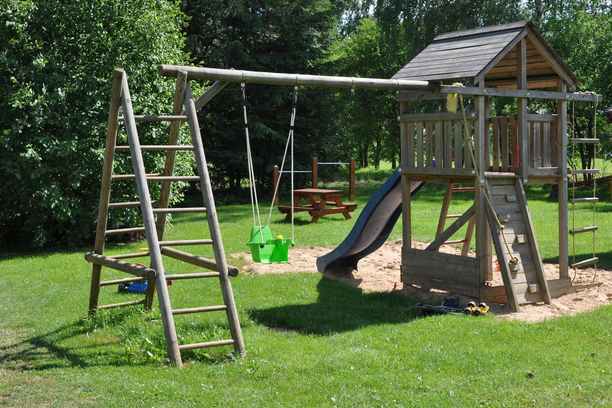 Parterre: (Wohnzimmer(TV(Flatscreen, Satellit, internationale TV-Kanäle), Esstisch(8 Personen), Herd(Holz), Sitzecke, DVD-Spieler, Gartentüren), offene Küche(Wasserkocher, Kochherd(4 Kochplatten, Ceranfeld), Dunstabzugshaube, Kaffeemaschine, Backofen, Mikrowelle, Spülmaschine, Kühl-/Gefrierkombination), Badezimmer(Dusche, Sauna, Waschbecken), Toilette) In der 1. Etage: (Schlafzimmer(Doppelbett(Doppelbettdecke)), Schlafzimmer(2x Einzelbett(Bettdecke)), Schlafzimmer(2x Einzelbett(Bettdecke), Etagenbett), Badezimmer(Badewanne, Dusche, Waschbecken, Toilette)) Freizeitraum(Tischtennisplatte(Gemeinschaftliche Nutzung mit anderen Gästen), Tischfußball(Gemeinschaftliche Nutzung mit anderen Gästen), Billard), Terrasse(alleinige Nutzung), Garten(alleinige Nutzung), Gartenmöbel, Grill, Parkplatz, Trampolin, Pool(Gemeinschaftliche Nutzung mit anderen Gästen, beheizbar, 8 x 4 m.), Sandkasten(Gemeinschaftliche Nutzung mit anderen Gästen), Spielgeräte(Gemeinschaftliche Nutzung mit anderen Gästen), Rutsche(Gemeinschaftliche Nutzung mit anderen Gästen), Fußballtor(Gemeinschaftliche Nutzung mit anderen Gästen), Hochstuhl