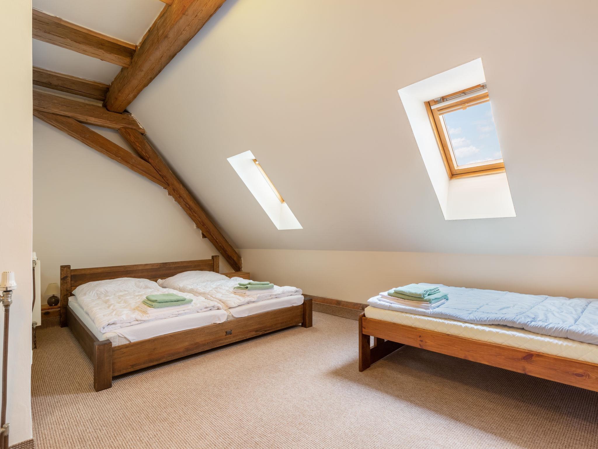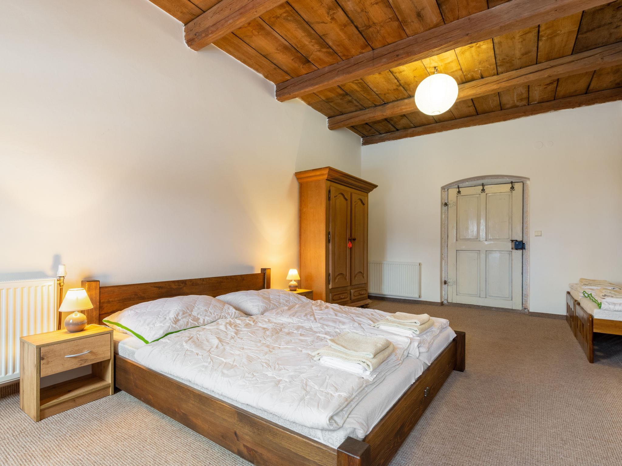 Martínkovice 5 km from Broumov: Large, comfortable farm estate "Statek Martínkovice", 2 storeys, detached, built in 1877. Private: property 1'000 m2 (fenced), courtyard, swimming pool (10 x 5 m, depth 150 cm, seasonal availability: 01.Jun. - 30.Sep.). Arbour, garden furniture, barbecue. In the house: central heating system. Shop, restaurant 200 m, bus stop "Martínkovice, rozc." 550 m. Nearby attractions: CHKO Broumovsko, Broumovské steny 5 km, Kaple Panny Marie Snežné (Hvezda) 15 km, Police nad Metují 18 km, Adšpašsko-Teplické skály 25 km, Góry Stolowe, Kladsko (PL) 30 km. Well-known ski regions can easily be reached: Janovicky 12 km. Please note: suitable for families. The owner does not accept any youth groups. Extra bed available on request (extra).