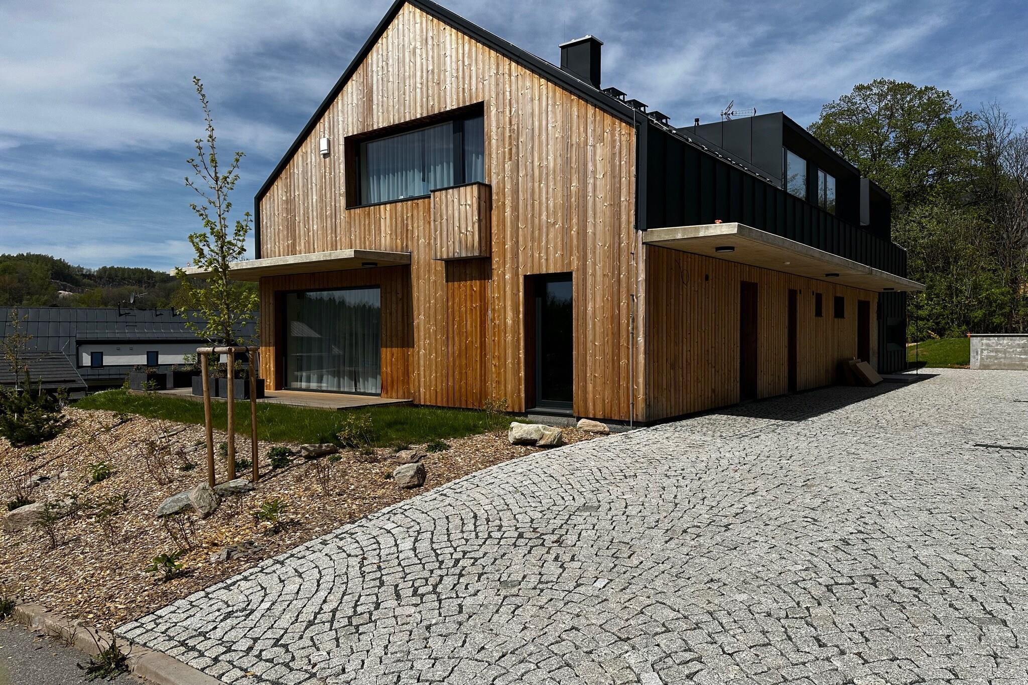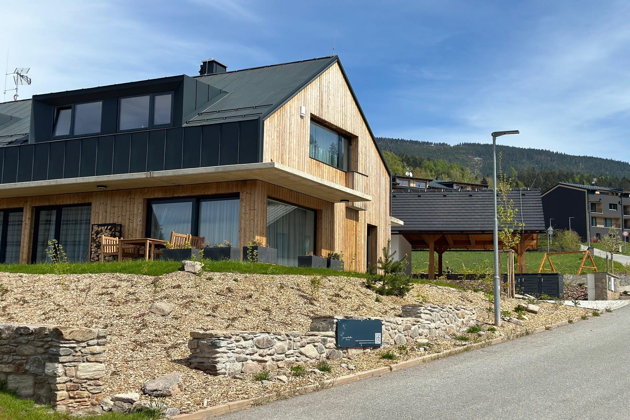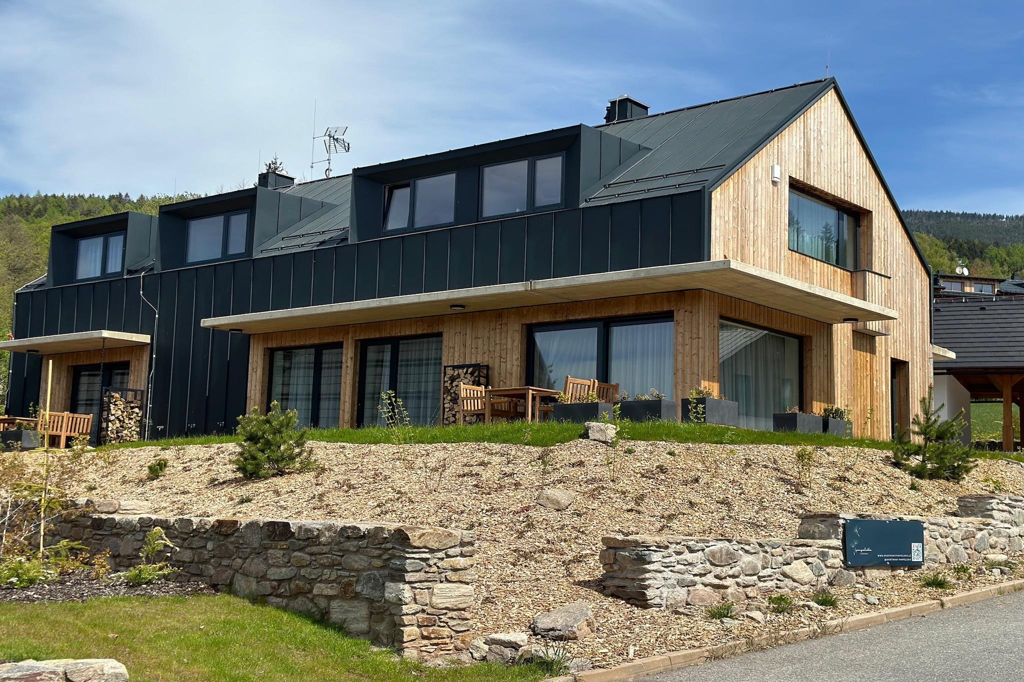 Beliggende i det betagende landskab i Cerny Dul, lover denne luksuriøse lejlighed et uforglemmeligt ophold for op til fire gæster. Et perfekt tilflugtssted for familier, venner eller par, lejligheden tilbyder en unik blanding af komfort og naturlig skønhed i hjertet af Giant Mountains. Uanset om du flygter for en weekend eller planlægger en længere ferie, er dette tilflugtssted det ideelle sted for dem, der søger både luksus og eventyr i de tjekkiske bjerge. En del af et nybygget kompleks med to bygninger, lejligheden deler plads med seks moderne, rummelige enheder - fire designet til seks personer og to til fire personer. Hvis du rejser med en større gruppe, kan du endda leje en hel bygning, hvilket gør den til det perfekte valg til gruppeferier. Hver lejlighed er unikt designet til at harmonere med sine fantastiske omgivelser, hvilket sikrer en hyggelig, men elegant atmosfære. Maisonettelejligheden til fire personer ligger i stueetagen og har en dejlig terrasse, hvor du kan slappe af og nyde den friske bjergluft. Opholdsstuen i åbent plan omfatter et tekøkken, et badeværelse og et komfortabelt opholdsrum. Ovenpå venter et soveværelse med dobbeltseng, komplet med eget badeværelse og bruser. Med Ski-Resort Cerná Hora kun en kort afstand væk, er dette en skiløbers drømmeplacering om vinteren, og i de varmere måneder forvandles det til et naturelskers paradis med naturskønne vandre- og mountainbikestier.