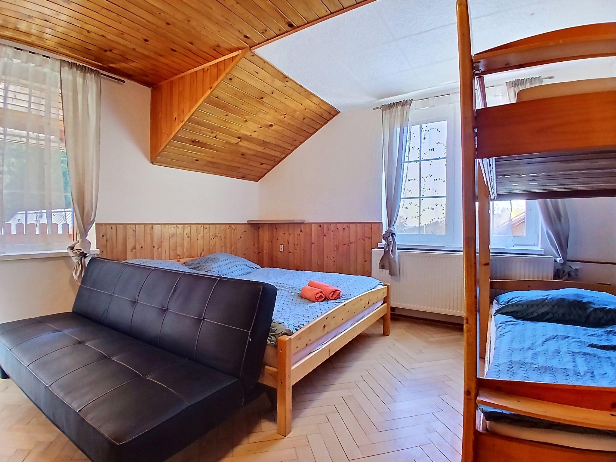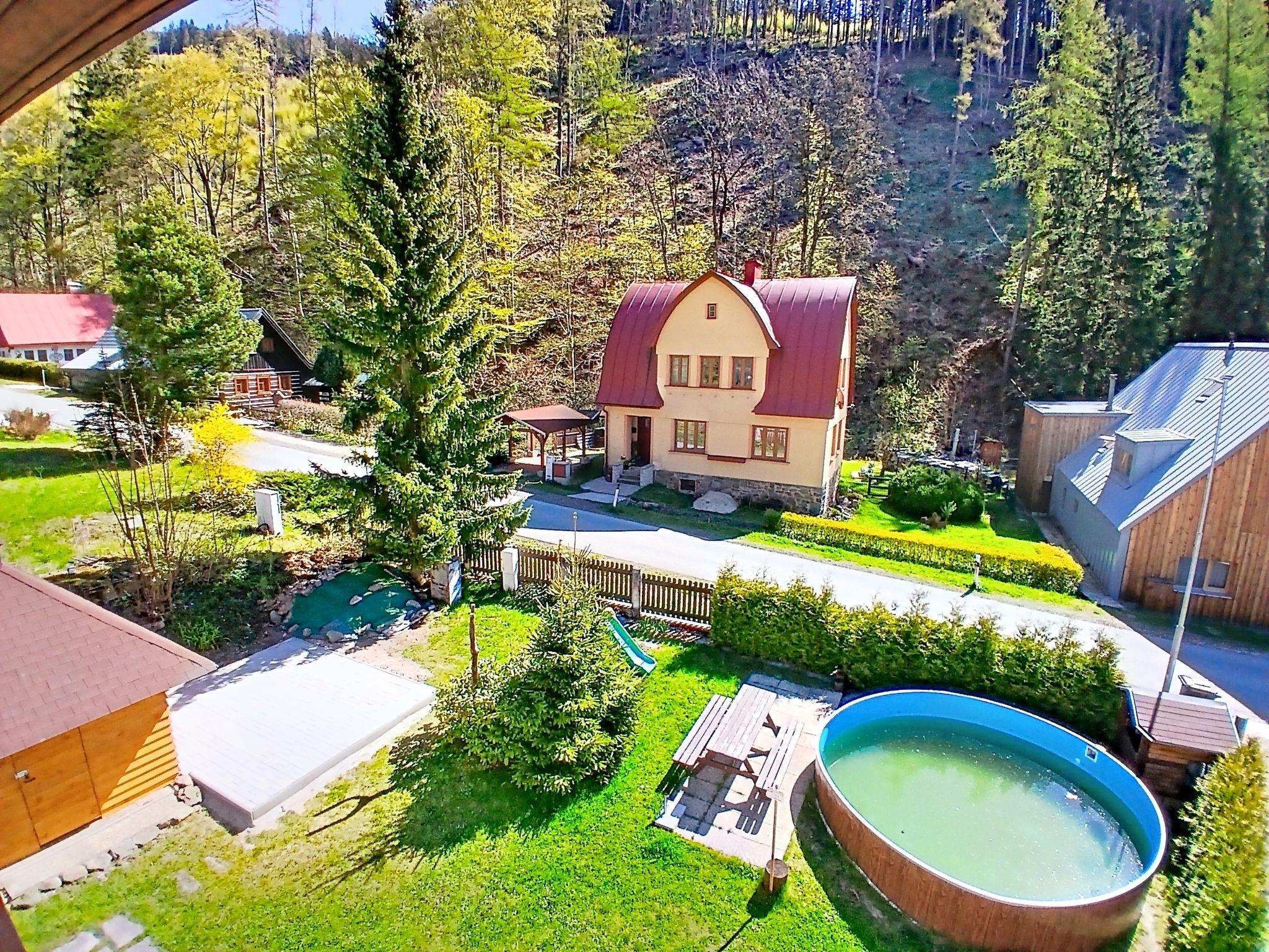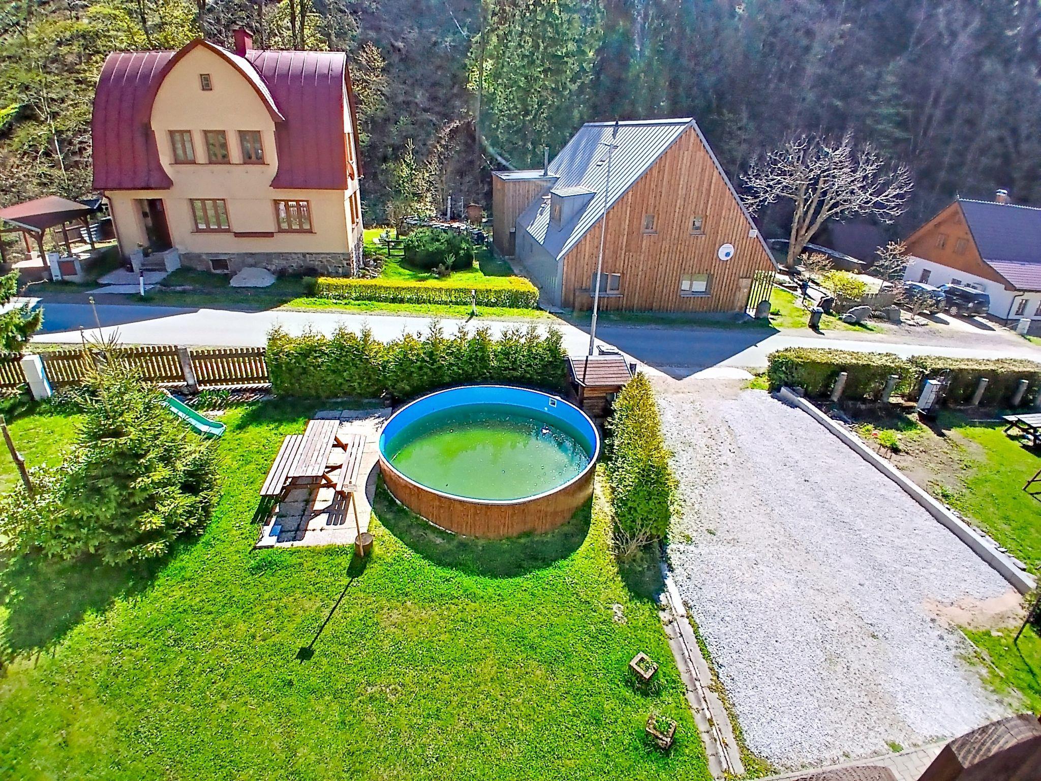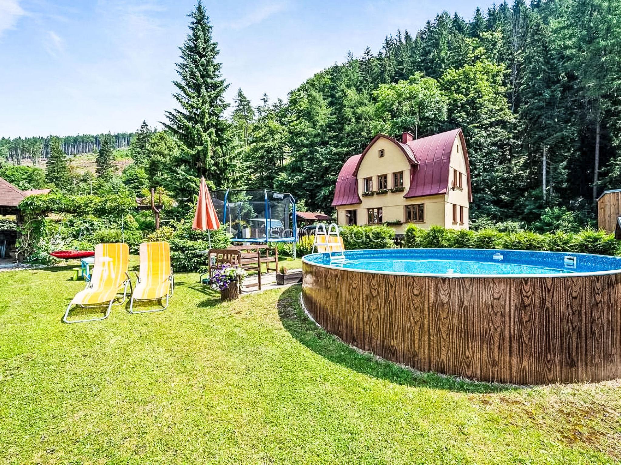 Cerný Dul: Child friendly, cosy house, 3 storeys, detached, surrounded by trees. Private: natural state property, well-kept garden, swimming pool (seasonal availability: 23.Jun. - 05.Sep.). Fireplace, children's playground (slide, swing, sandbox). In the house: lounge with TV, storage room for bicycles, storage room for skis. Parking at the house. Shop 500 m, shopping centre 10 km, restaurant 500 m, bus stop "Cerný Dul námestí" 500 m, railway station "Vrchlabí" 10 km. Slopes 1 km. Nearby attractions: Stezka korunami stromu 6 km, Vrchlabí 10 km, Aquacentrum Janské Lázne 6 km, Aquapark Trutnov 28 km, Zoo Safari Dvur Králové 32 km. Well-known ski regions can easily be reached: Cerný Dul 1 km, Jánské Lázne - Cerná Hora 6 km, Hoffmanky Express 4.4 km. Hiking paths: Snežka 28 km. Please note: suitable for families, baby equipment (included). The owner lives in the same residence.
