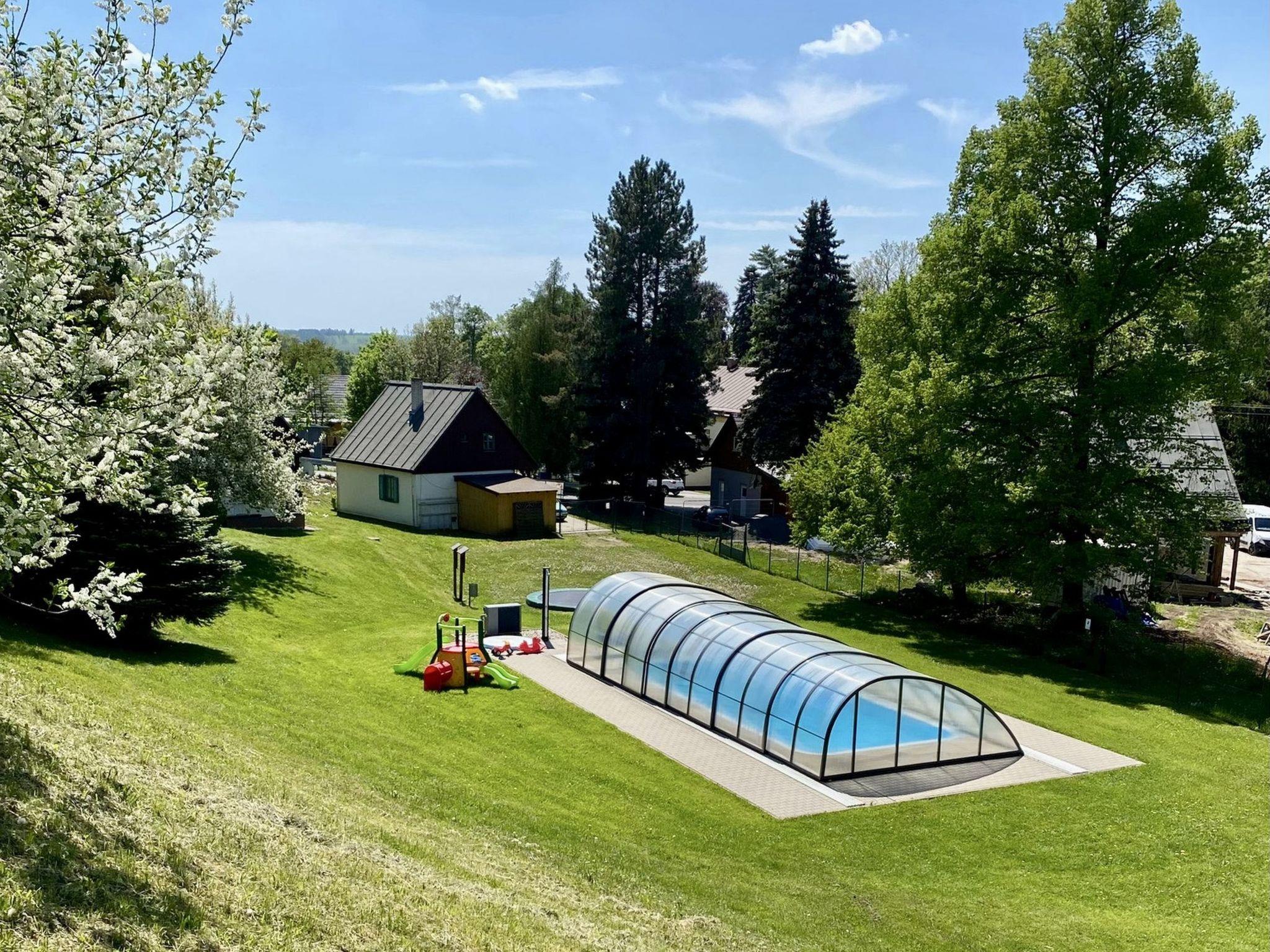 Cistá v Krkonoších 2 km from Cerný Dul: Child friendly, beautiful, comfortable holiday village "Holiday Hill 32", 500 m a.s.l., surrounded by trees and meadows. 43 houses in the resort. On the outskirts, in a secluded, quiet, sunny position, 1.5 km from the lake, 3 km from the skiing area, in the countryside. For shared use: property 6 ha, meadow, swimming pool heated (9 x 4 m, depth 120 cm, seasonal availability: 15.May. - 30.Sep. pool opening hours: 09:00-20:00). Shower/WC in the pool area, table tennis, children's playground (swing, sandbox). In the complex: reception, central heating system. Parking (for 2 cars) at the house. Shop 2.5 km, grocery 2.5 km, supermarket 7.5 km, restaurant 1.6 km, pub garden 400 m, bus stop "Cerný Dul, Cistá-pošta" 400 m, grass beach 1.5 km (small), indoor swimming pool 19 km. Golf course (18 hole) 14 km, tennis 2.5 km, sports centre 2.5 km, walking paths from the house 100 m, cycle lane, ski lift 3 km, chair lift 3 km, slopes 3 km, ski school 3 km, children's ski school 3 km, sled run 7 km, cross country ski track 100 m. Nearby attractions: Janské Lázne Spa 9 km, Vrchlabí 10 km, Aquapark Trutnov 25 km, Zoo Safari Dvur Králové 29 km, Bozkovské jeskyne 37 km, Adršpašské skály 44 km. Well-known ski regions can easily be reached: Cerný Dul 3 km, Herlíkovice 15 km, Pec pod Snežkou 22 km. Well-known lakes can easily be reached: Cistá 1.5 km, Vrchlabí 9 km. Hiking paths: Snežka 25 km.