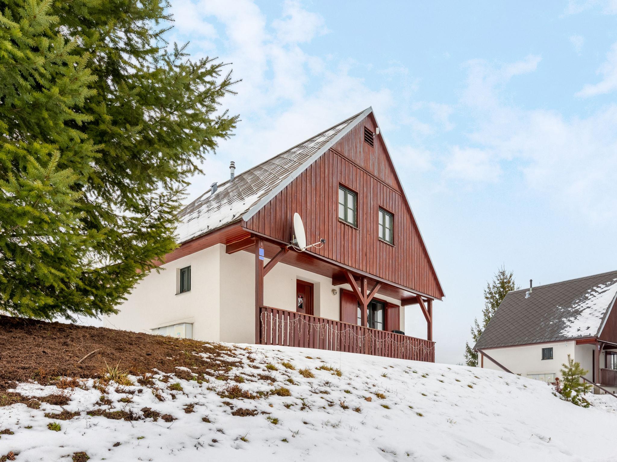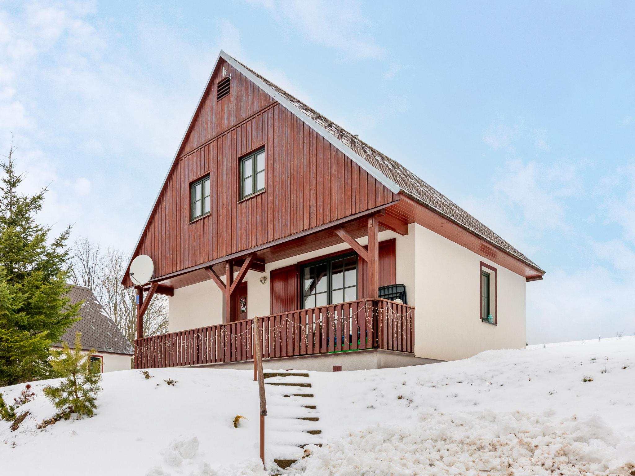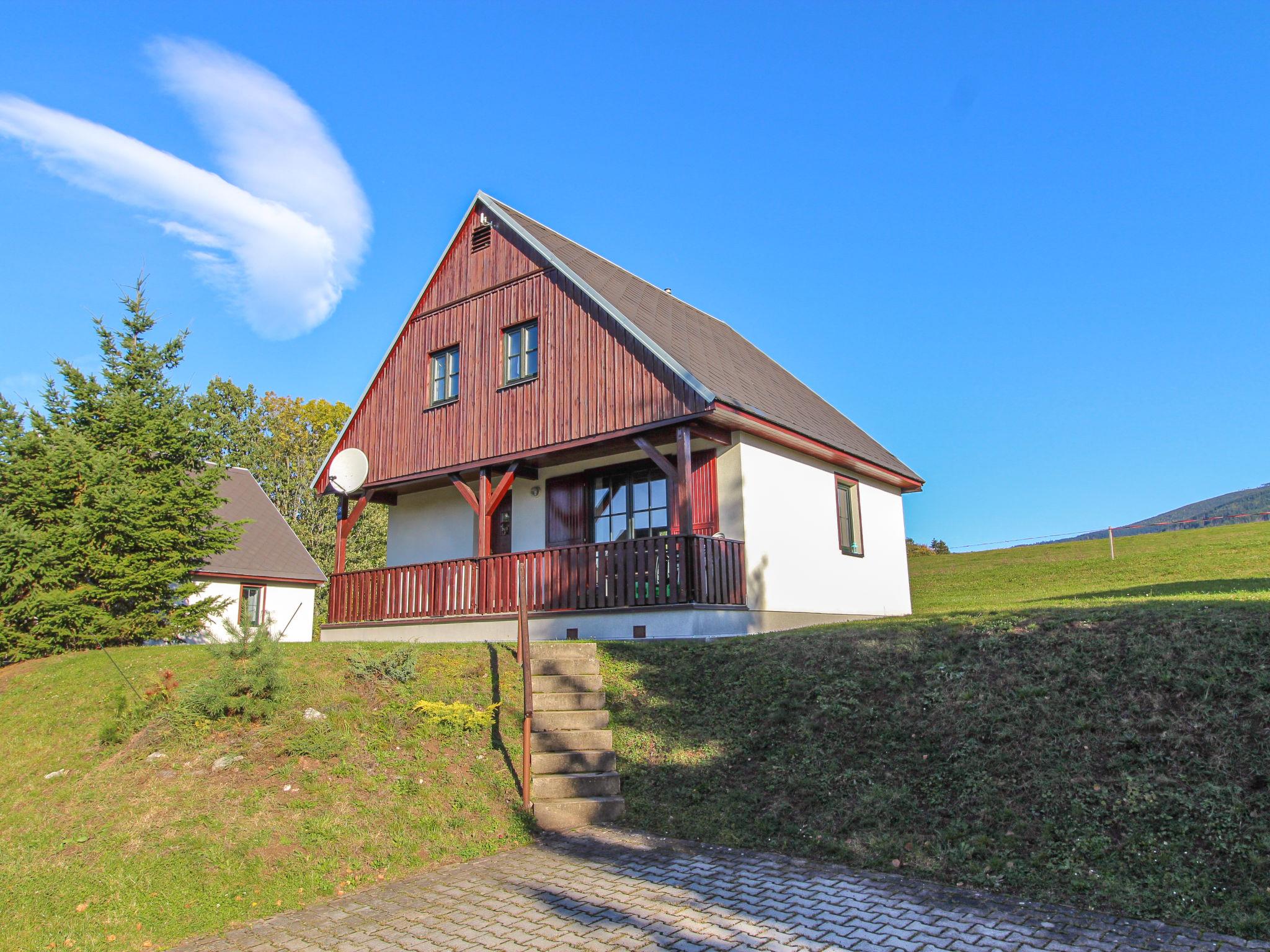 Cistá v Krkonoších 2 km from Cerný Dul: Child friendly, beautiful, comfortable holiday village "Holiday Hill 64", 500 m a.s.l., surrounded by trees and meadows. 43 houses in the resort. On the outskirts, in a secluded, quiet, sunny position, 1.5 km from the lake, 3 km from the skiing area, in the countryside. For shared use: property 6 ha, meadow, swimming pool heated (9 x 4 m, depth 120 cm, seasonal availability: 15.May. - 30.Sep. pool opening hours: 09:00-20:00). Shower/WC in the pool area, table tennis, children's playground (swing, sandbox). In the complex: reception, central heating system. Parking (for 2 cars) at the house. Shop 2.5 km, grocery 2.5 km, supermarket 7.5 km, restaurant 1.6 km, pub garden 400 m, bus stop "Cerný Dul, Cistá-pošta" 400 m, grass beach 1.5 km (small), indoor swimming pool 19 km. Golf course (18 hole) 14 km, tennis 2.5 km, sports centre 2.5 km, walking paths from the house, cycle lane 100 m, ski lift 3 km, chair lift 3 km, slopes 3 km, ski school 3 km, children's ski school 3 km, sled run 7 km, cross country ski track 100 m. Nearby attractions: Janské Lázne Spa 9 km, Vrchlabí 10 km, Aquapark Trutnov 25 km, Zoo Safari Dvur Králové 29 km, Bozkovské jeskyne 37 km, Adršpašské skály 44 km. Well-known ski regions can easily be reached: Cerný Dul 3 km, Herlíkovice 15 km, Pec pod Snežkou 22 km. Well-known lakes can easily be reached: Cistá 1.5 km, Vrchlabí 9 km. Hiking paths: Snežka 25 km.