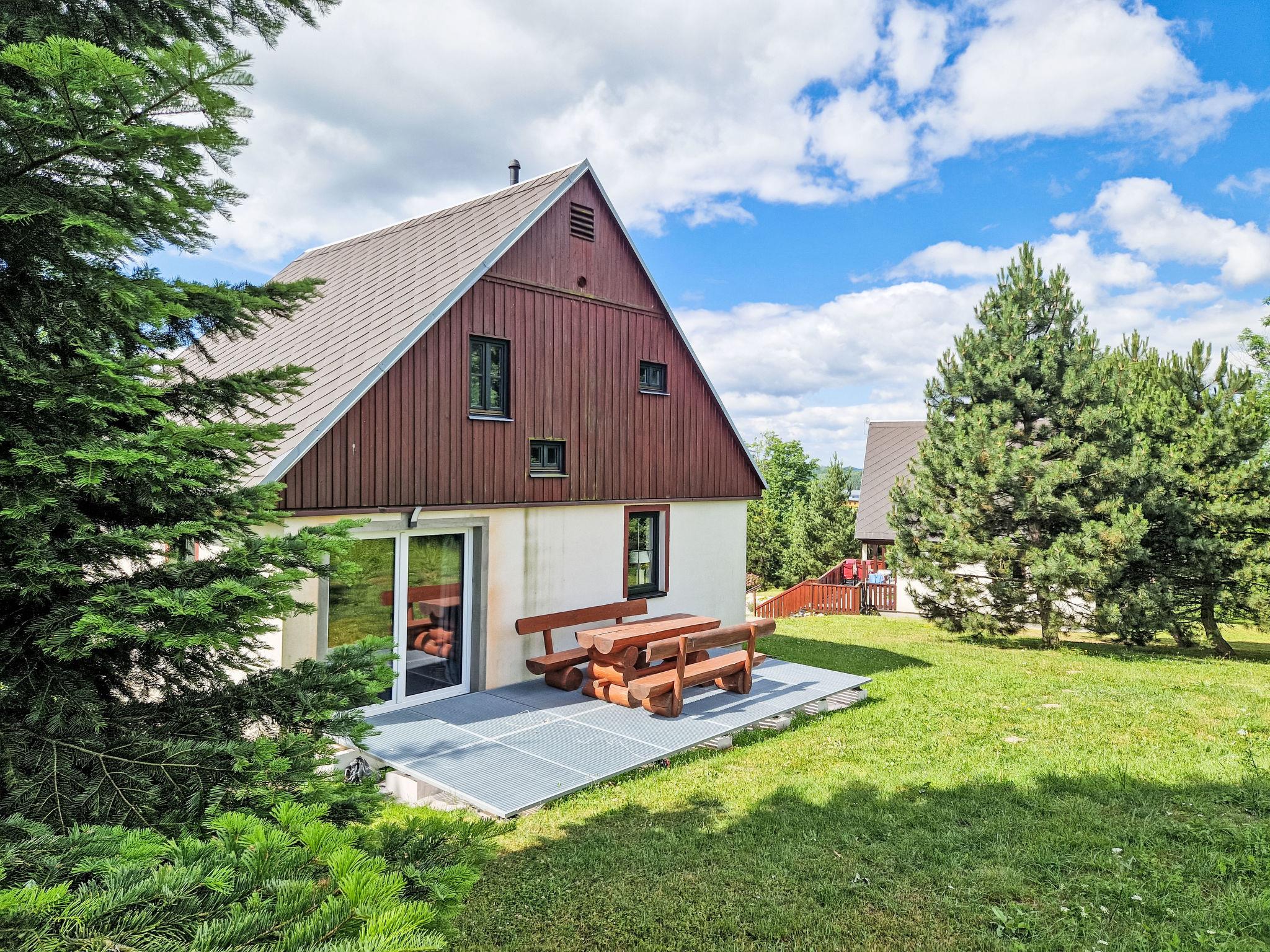 Cistá v Krkonoších 2 km from Cerný Dul: Child friendly, beautiful, comfortable holiday village "Holiday Hill 65", 500 m a.s.l., surrounded by trees and meadows. 43 houses in the resort. On the outskirts, in a secluded, quiet, sunny position, 1.5 km from the lake, 3 km from the skiing area, in the countryside. For shared use: property 6 ha, meadow, swimming pool heated (9 x 4 m, depth 120 cm, seasonal availability: 15.May. - 30.Sep. pool opening hours: 09:00-20:00). Shower/WC in the pool area, table tennis, children's playground (swing, sandbox). In the complex: reception, central heating system. Parking (for 2 cars) at the house. Shop 2.5 km, grocery 2.5 km, supermarket 7.5 km, restaurant 1.6 km, pub garden 400 m, bus stop "Cerný Dul, Cistá-pošta" 400 m, grass beach 1.5 km (small), indoor swimming pool 19 km. Golf course (18 hole) 14 km, tennis 2.5 km, sports centre 2.5 km, walking paths from the house 100 m, cycle lane, ski lift 3 km, chair lift 3 km, slopes 3 km, ski school 3 km, children's ski school 3 km, sled run 7 km, cross country ski track 100 m. Nearby attractions: Janské Lázne Spa 9 km, Vrchlabí 10 km, Aquapark Trutnov 25 km, Zoo Safari Dvur Králové 29 km, Bozkovské jeskyne 37 km, Adršpašské skály 44 km. Well-known ski regions can easily be reached: Cerný Dul 3 km, Herlíkovice 15 km, Pec pod Snežkou 22 km. Well-known lakes can easily be reached: Cistá 1.5 km, Vrchlabí 9 km. Hiking paths: Snežka 25 km.
