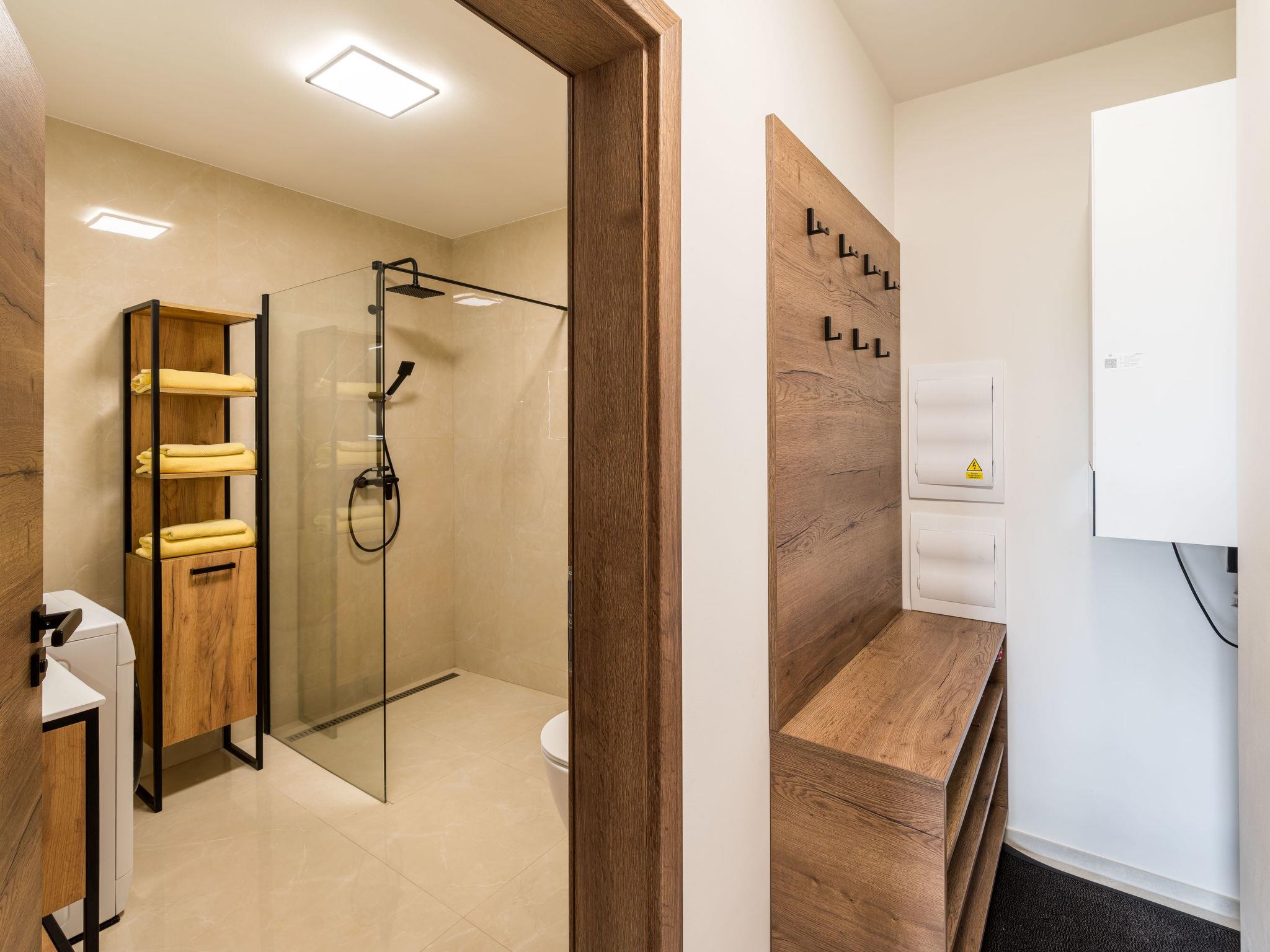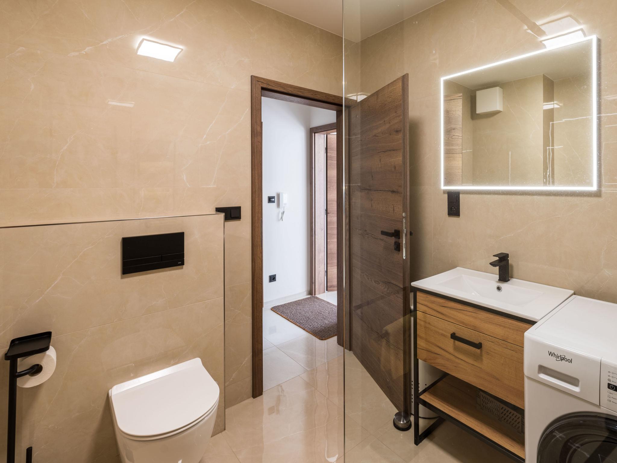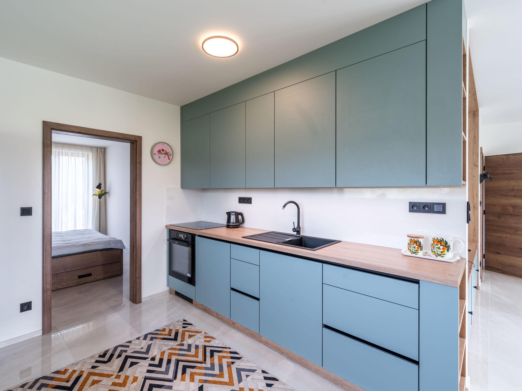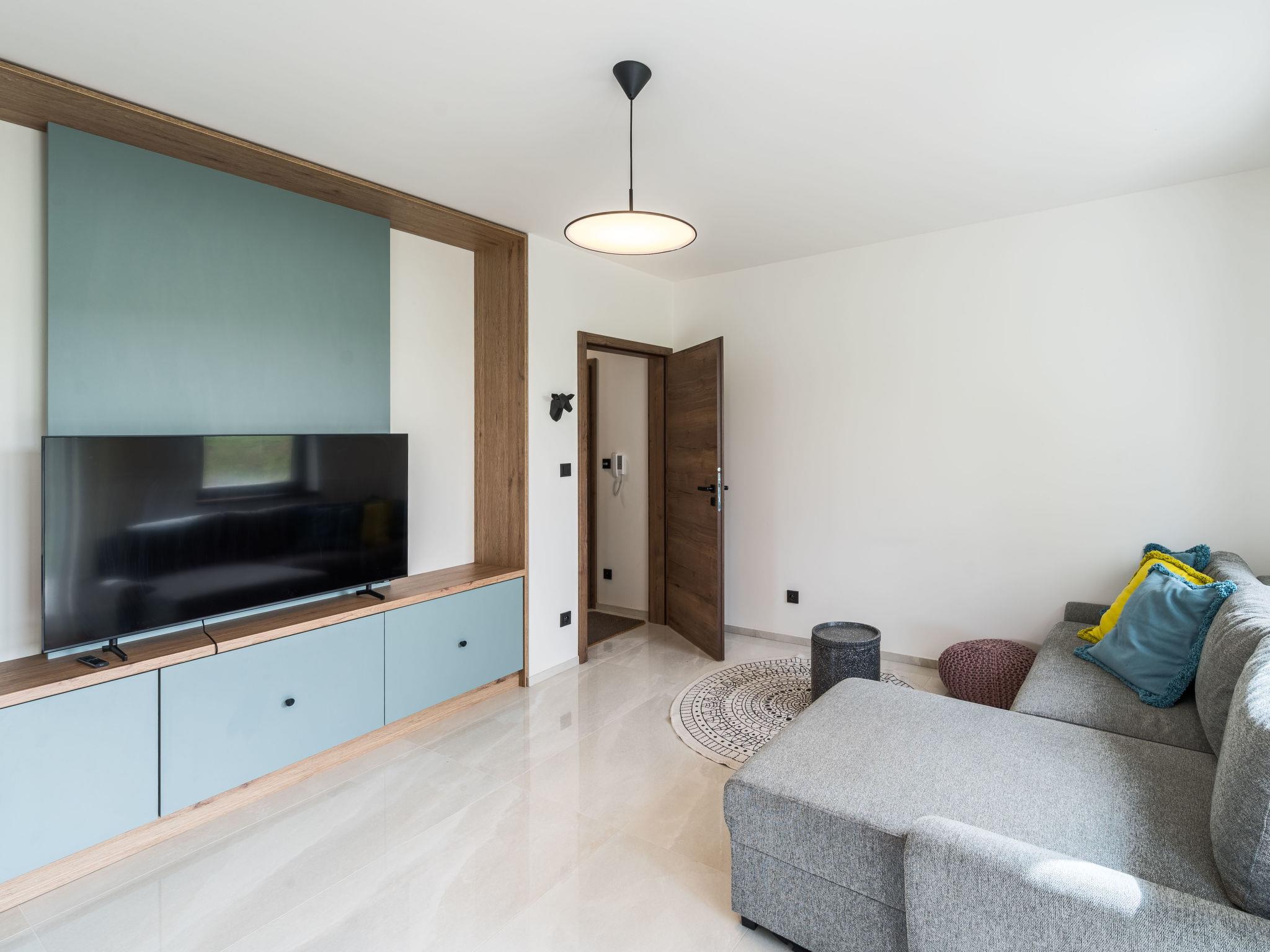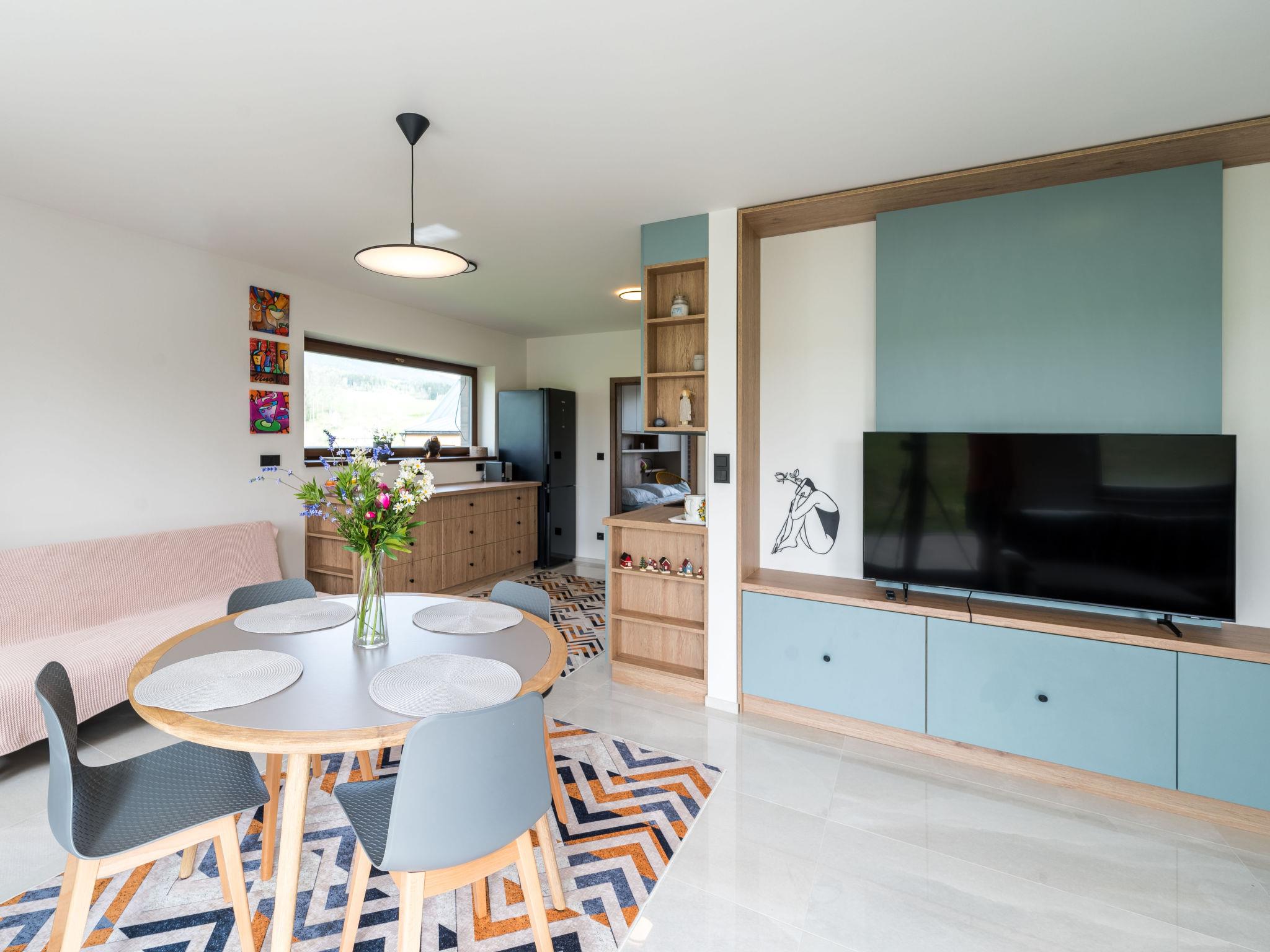"Happy", 2-room apartment 50 m2, on the ground floor. Comfortable and beautiful furnishings: living/dining room with 1 sofabed and TV. 1 room with 1 double bed and 2 pull-out beds. Kitchenette (oven, dishwasher, 4 ceramic glass hob hotplates, kettle, freezer, electric coffee machine) with dining table. Shower/WC. Terrace. Terrace furniture. Beautiful view of the mountains. Facilities: washing machine, dryer, hair dryer. Internet (WiFi, free). Please note: suitable for families. Non-smoking house.