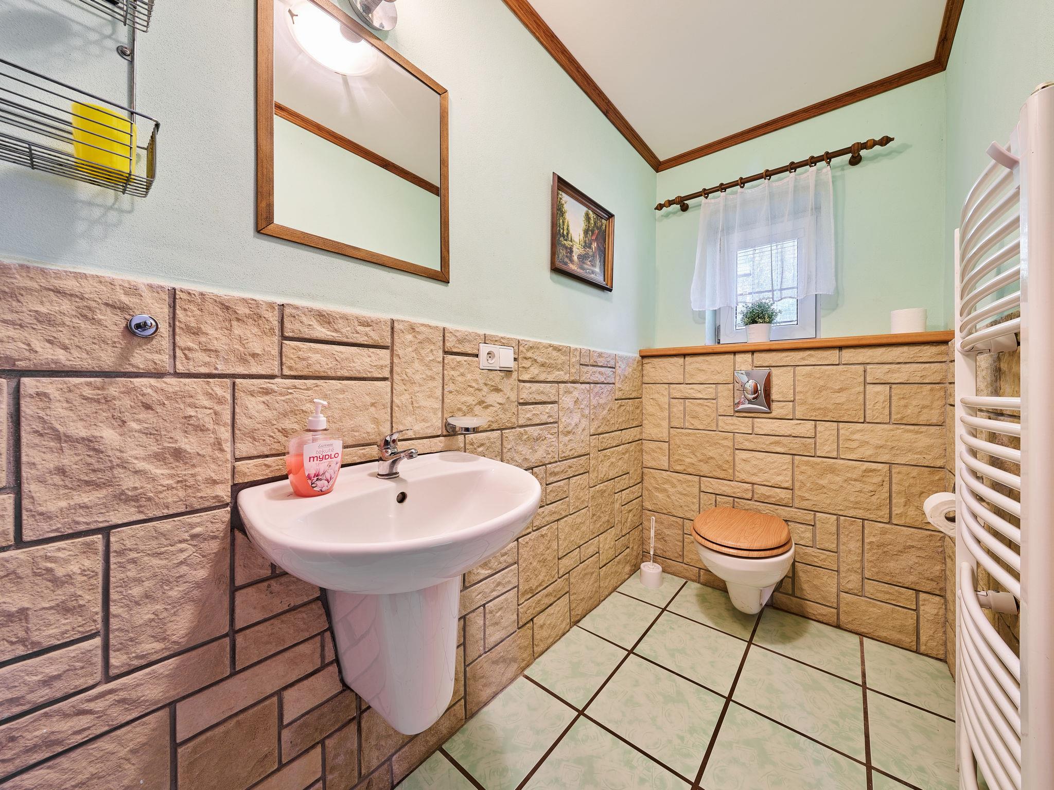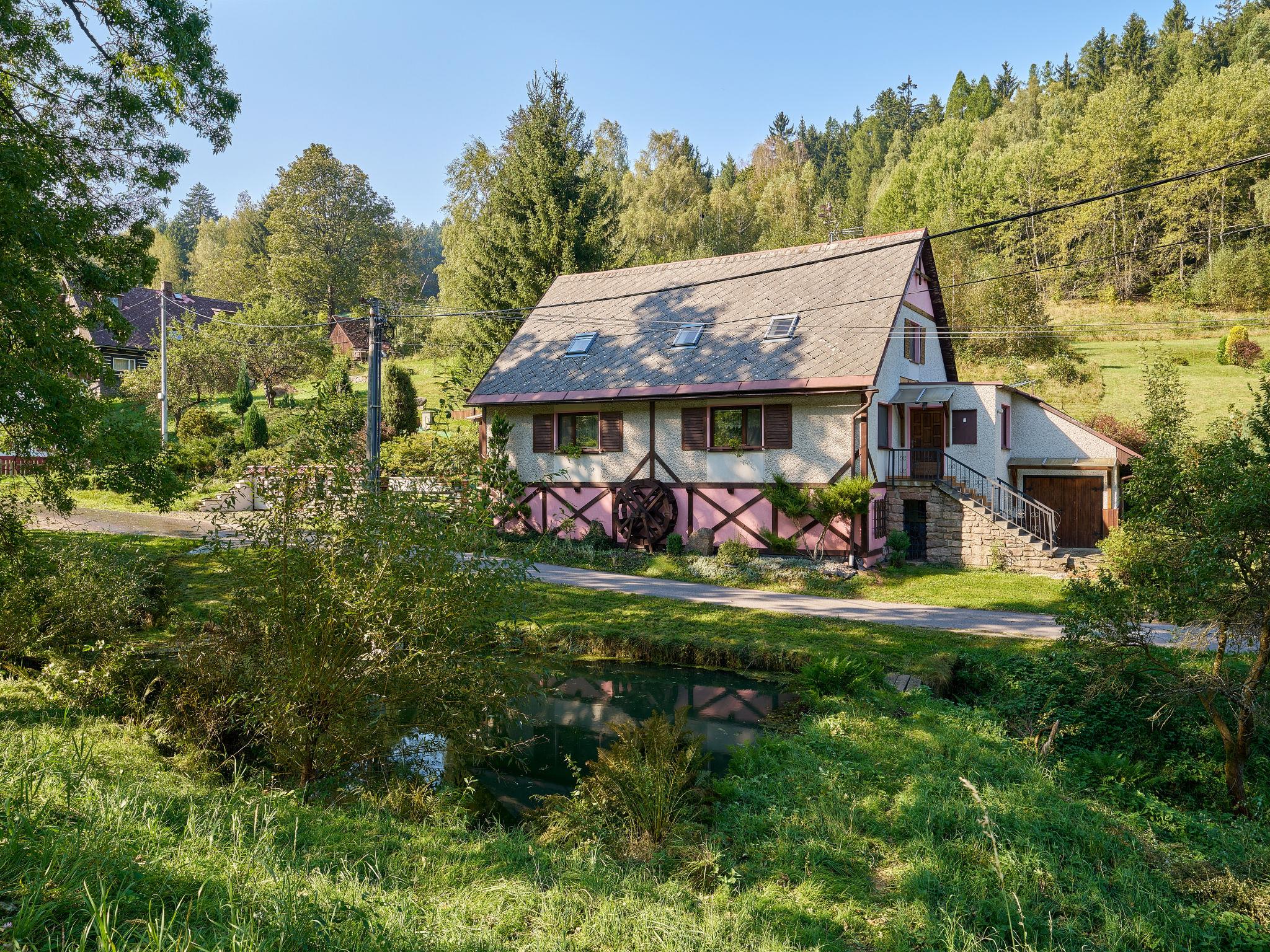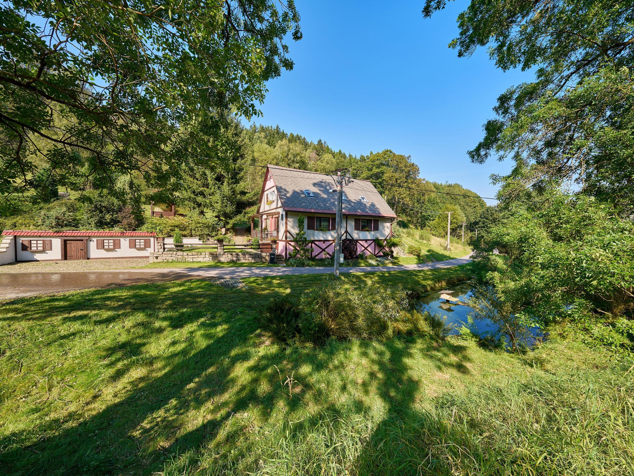 Chlívce 8 km from Hronov: Cosy country house "Chlívce u Hronova", 2 storeys, detached. Outside the resort, in a quiet, elevated position. For shared use: property 1'000 m2, swimming pool round (4,60 m diameter, seasonal availability: 01.Jul. - 31.Aug.). Arbour, garden furniture, barbecue, fireplace, barbecue house, children's playground, parking at the house. Shop 3.5 km, shopping centre 8 km, restaurant 250 m, bus stop "Chlívce" 500 m, railway station "Hronov, Cervený Kostelec" 8 km, outdoor swimming pool 9 km, indoor swimming pool 35 km, natural swimming pond 4 km. Ski lift, slopes 200 m, cross country ski track 10 m. Nearby attractions: Muzeum Aloise Jiráska/Hronov 8 km, Adršpašsko-teplické skály 17 km, Broumovské steny, Náchod 17 km, Ratiborice a Babiccino údolí 20 km, Broumov 28 km, Relaxpark Pec pod Snežkou 50 km. Well-known ski regions can easily be reached: Radvanice 10 km, Petrikovice 16 km, Mladé Buky 34 km, Janské Lázne 40 km. Well-known lakes can easily be reached: vodní nádrž Rozkoš 25 m. Children's house in the garden. It is possible to arrange meals in a private club, which is at a distance of 250 m (on request). This cottage can be rented as a whole house or separately as 4 fully equipped apartments in the low season.