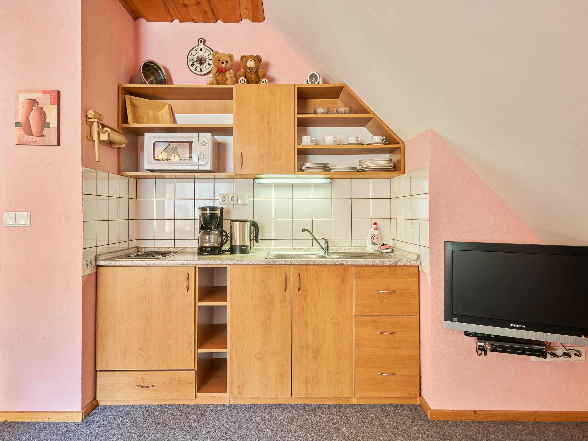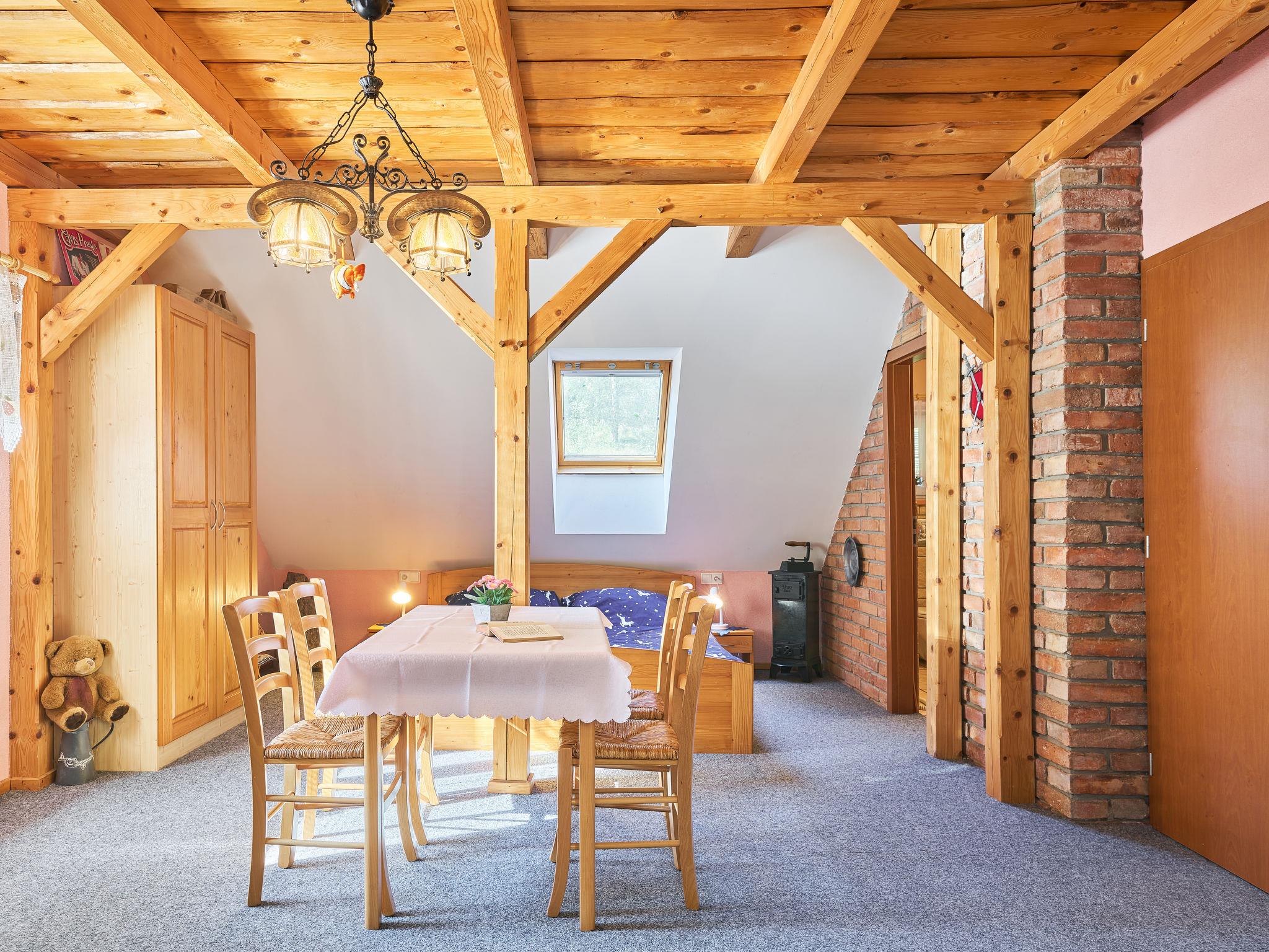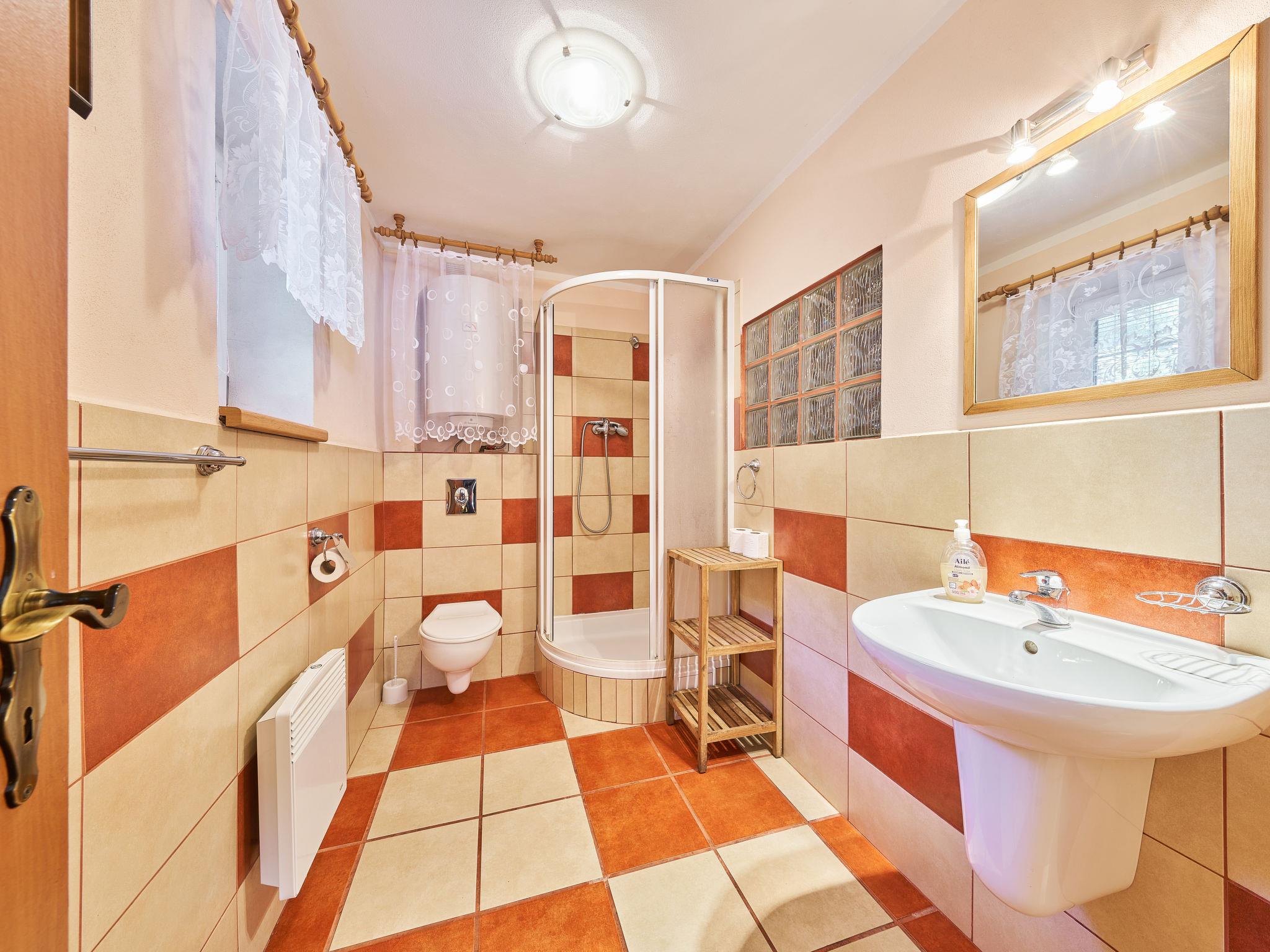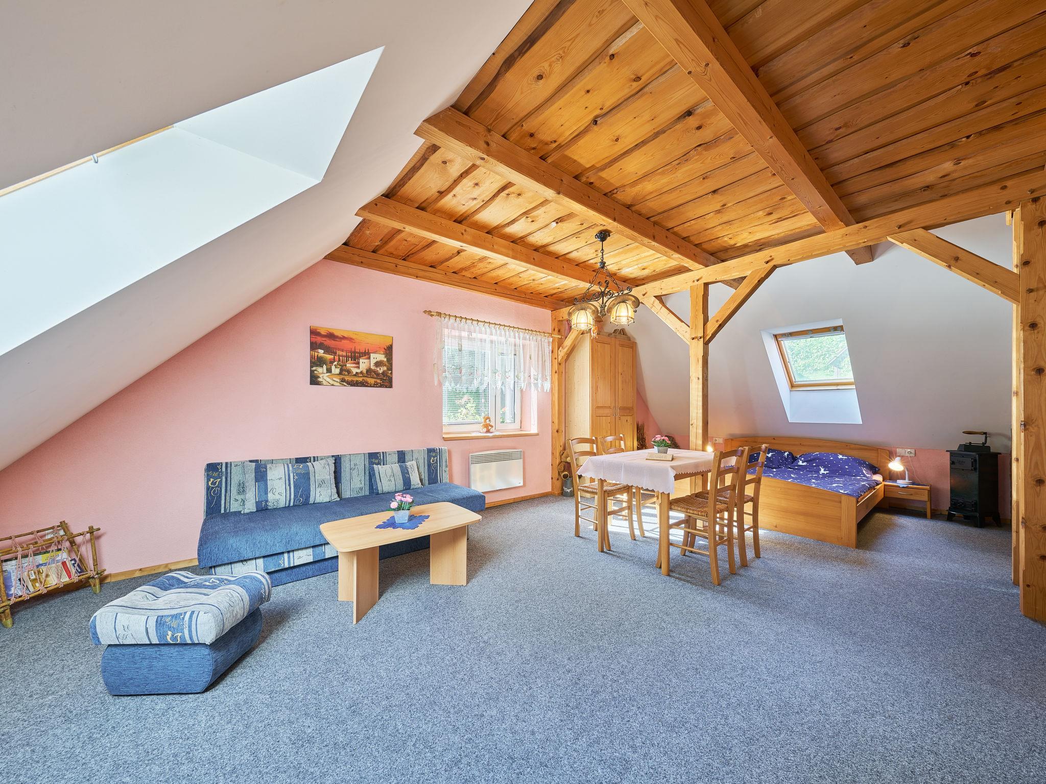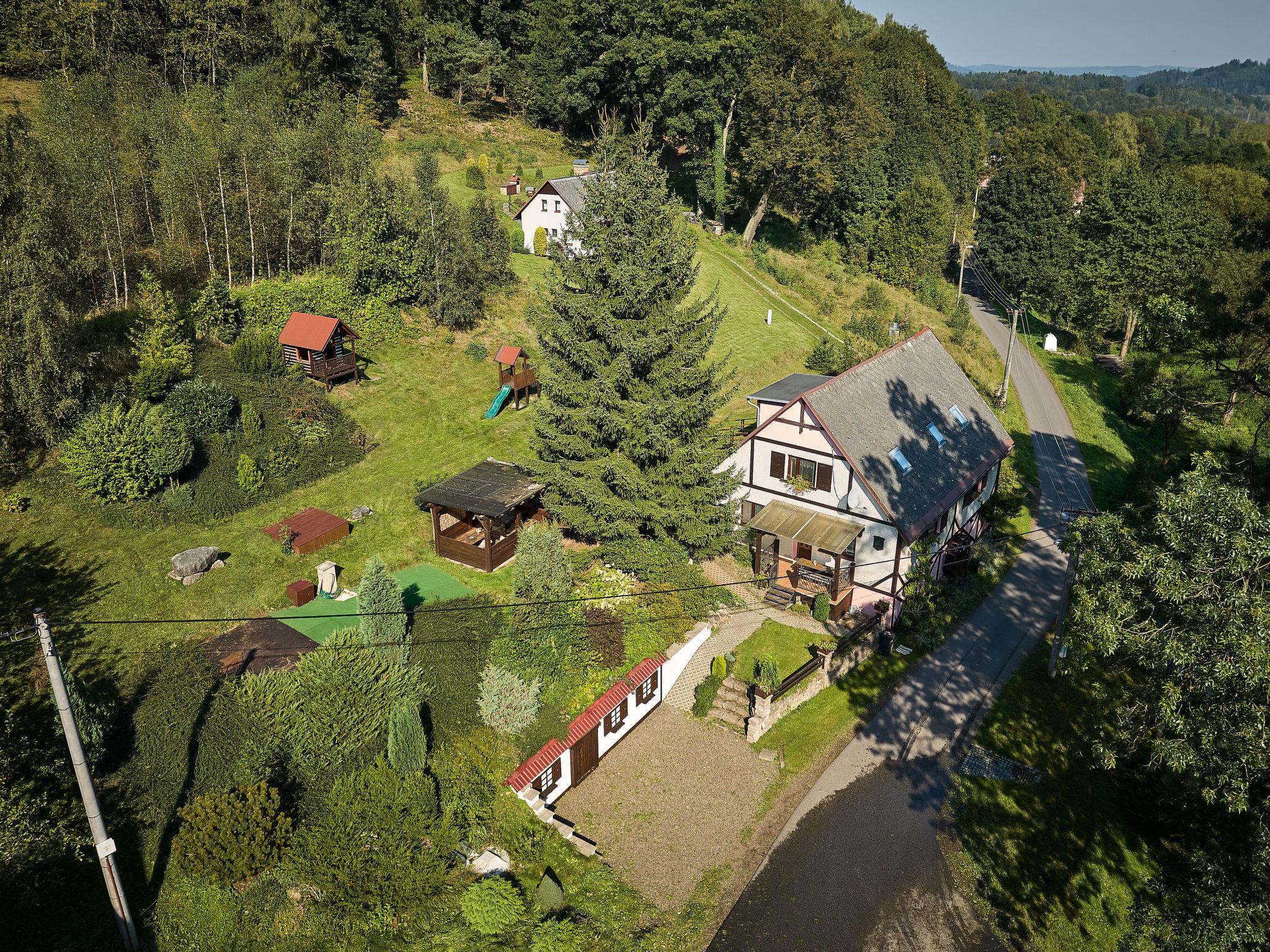 Chlívce 8 km from Hronov: Cosy country house "Chlívce u Hronova", 2 storeys, detached. Outside the resort, in a quiet, elevated position. For shared use: property 1'000 m2, swimming pool round (4,60 m diameter, seasonal availability: 01.Jul. - 31.Aug.). Arbour, garden furniture, barbecue, fireplace, barbecue house, children's playground, parking at the house. Shop 3.5 km, shopping centre 8 km, restaurant 250 m, bus stop "Chlívce" 500 m, railway station "Hronov, Cervený Kostelec" 8 km, outdoor swimming pool 9 km, indoor swimming pool 35 km, natural swimming pond 4 km. Ski lift, slopes 200 m, cross country ski track 10 m. Nearby attractions: Muzeum Aloise Jiráska/Hronov 8 km, Adršpašsko-teplické skály 17 km, Broumovské steny, Náchod 17 km, Ratiborice a Babiccino údolí 20 km, Broumov 28 km, Relaxpark Pec pod Snežkou 50 km. Well-known ski regions can easily be reached: Radvanice 10 km, Petrikovice 16 km, Mladé Buky 34 km, Janské Lázne 40 km. Well-known lakes can easily be reached: vodní nádrž Rozkoš 25 m. Children's house in the garden. It is possible to arrange meals in a private club, which is at a distance of 250 m (on request). This cottage can be rented as a whole house or separately as 4 fully equipped apartments in the low season.