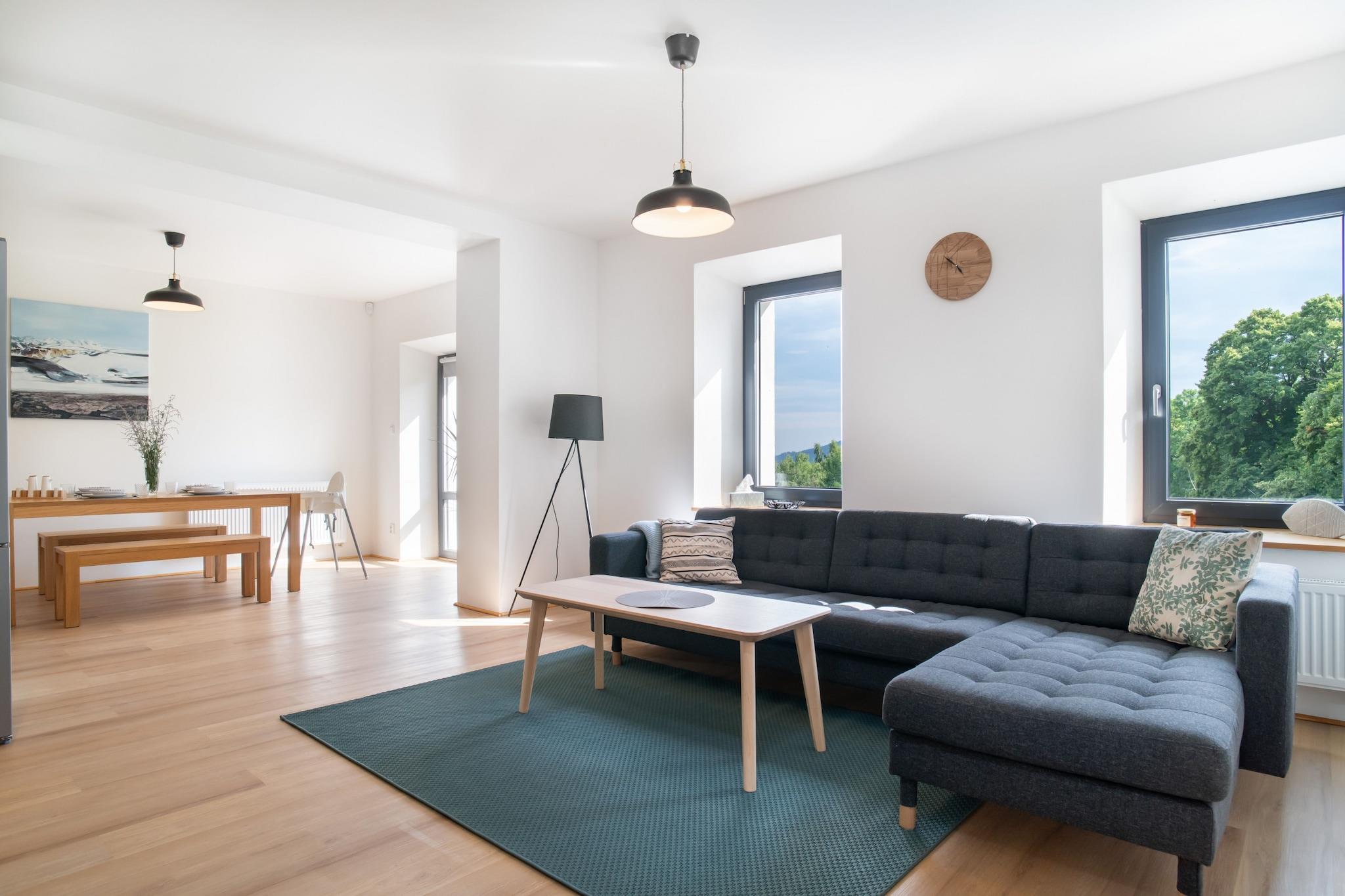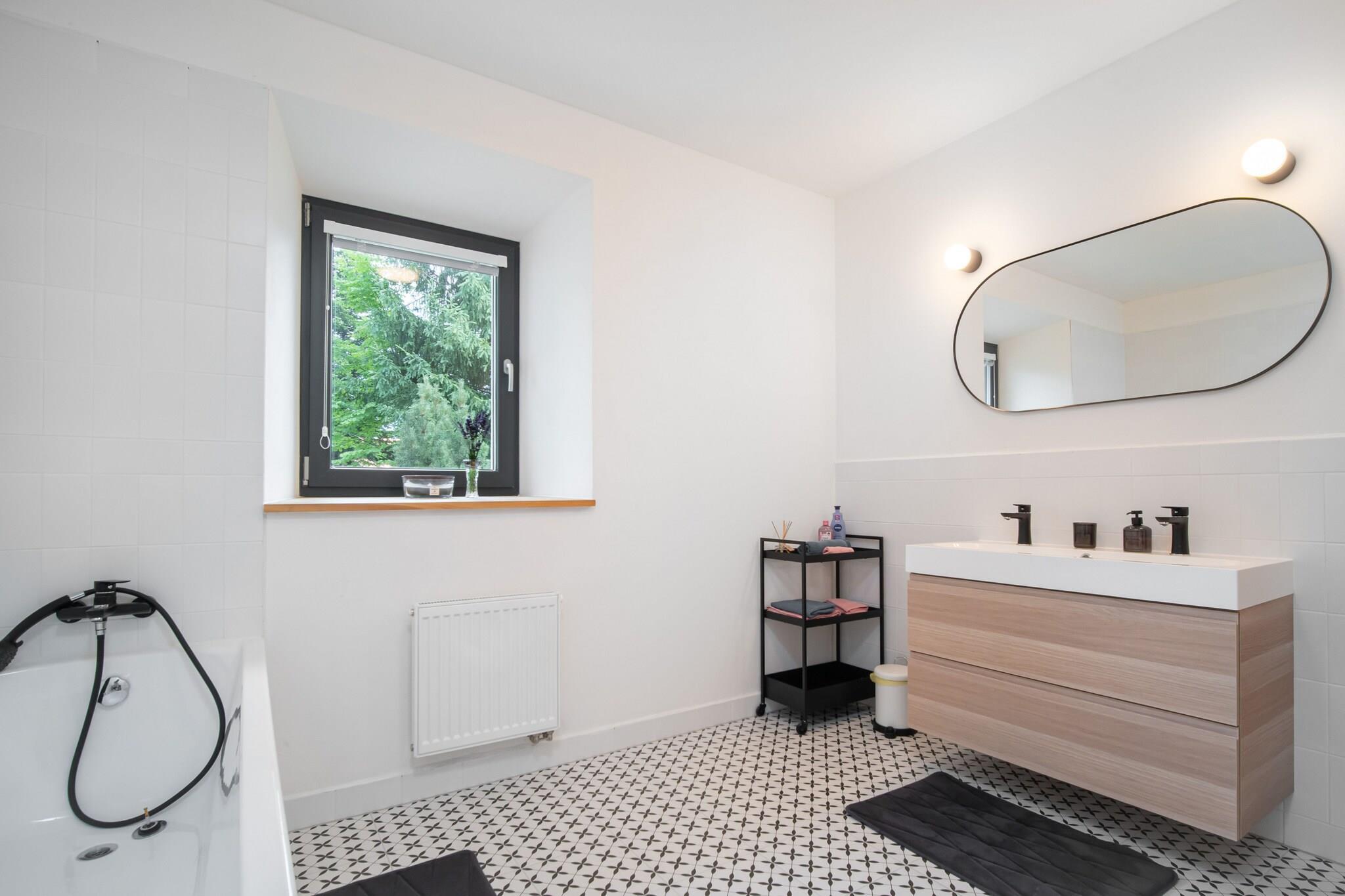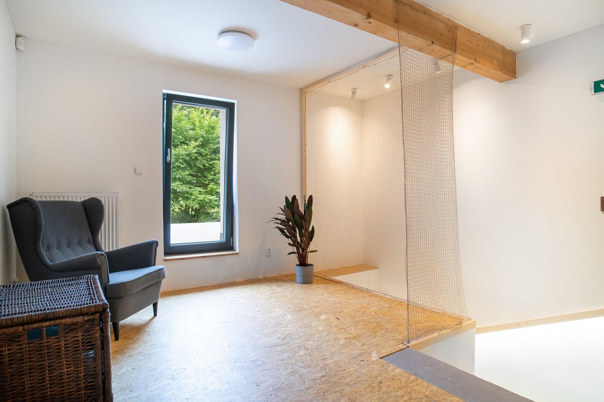 Denne rummelige villa, beliggende i de maleriske tjekkiske Jizera-bjerge, er perfekt til store grupper, og tilbyder indkvartering for op til 24 personer. Nyrenoveret villa er beliggende i Desná, omgivet af smuk natur, med vandrestier og skove i kort afstand. Huset består af 5 fuldt udstyrede lejligheder, hver med eget badeværelse og køkken, hvilket sikrer komfort og privatliv for alle gæster. Der er et fællesområde med tekøkken og pejs, hvilket gør det nemt at samles og nyde hyggelige stunder sammen. Villaen er et paradis for børn og kæledyr med en stor have med gynge, rutsjebane og legeredskaber. Om aftenen kan gæsterne slappe af på terrassen, fyre op i grillen eller nyde et bål. Til underholdning er der et legerum med bordtennis, billard, bordfodbold og PlayStation-spil. Efter en aktiv dag kan du slappe af i wellness-området med sauna og jacuzzi, eller nyde en selvtappet tjekkisk øl fra ølhanen (tilgængelig mod et gebyr). Beliggenheden byder på rig mulighed for udendørs aktiviteter året rundt. Nærliggende attraktioner omfatter udsigtstårnene i Rozhledna Svetly vrch og Vyhlidka Spicka samt naturlige pools og søer til svømning. Vintersportsentusiaster kan udforske flere skisportssteder inden for 10 km, herunder Desná, Detoa og Harrachov. Til langrend løber en privat sti lige under feriehuset. Villaens nærhed til Tanvald, Harrachov og Liberec gør den til en ideel base for at udforske regionen.