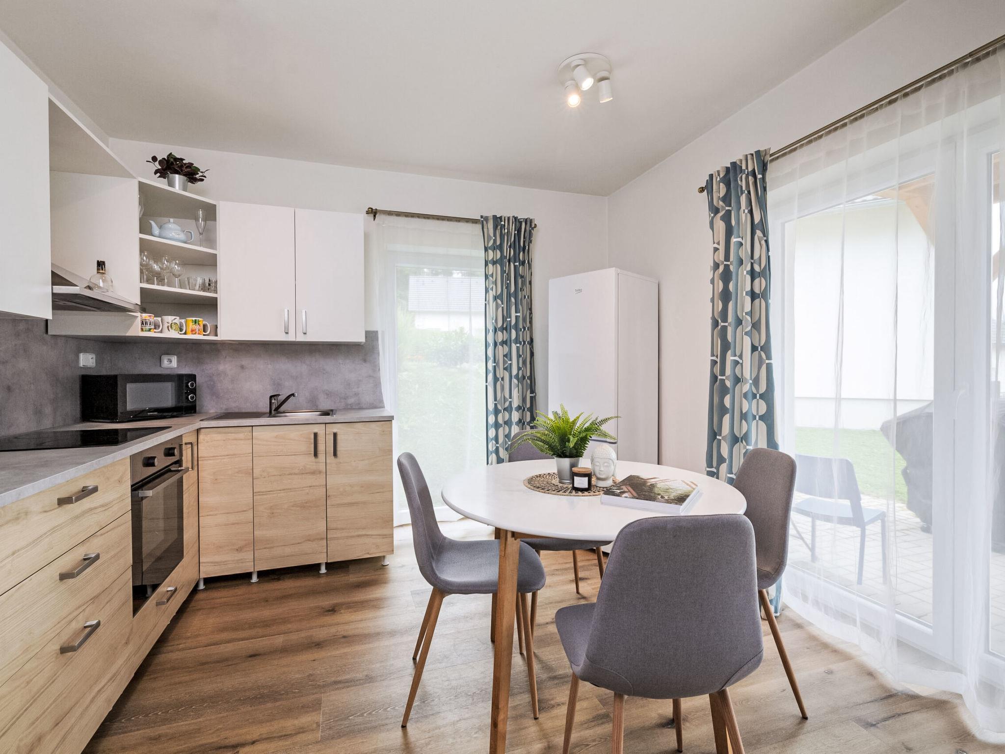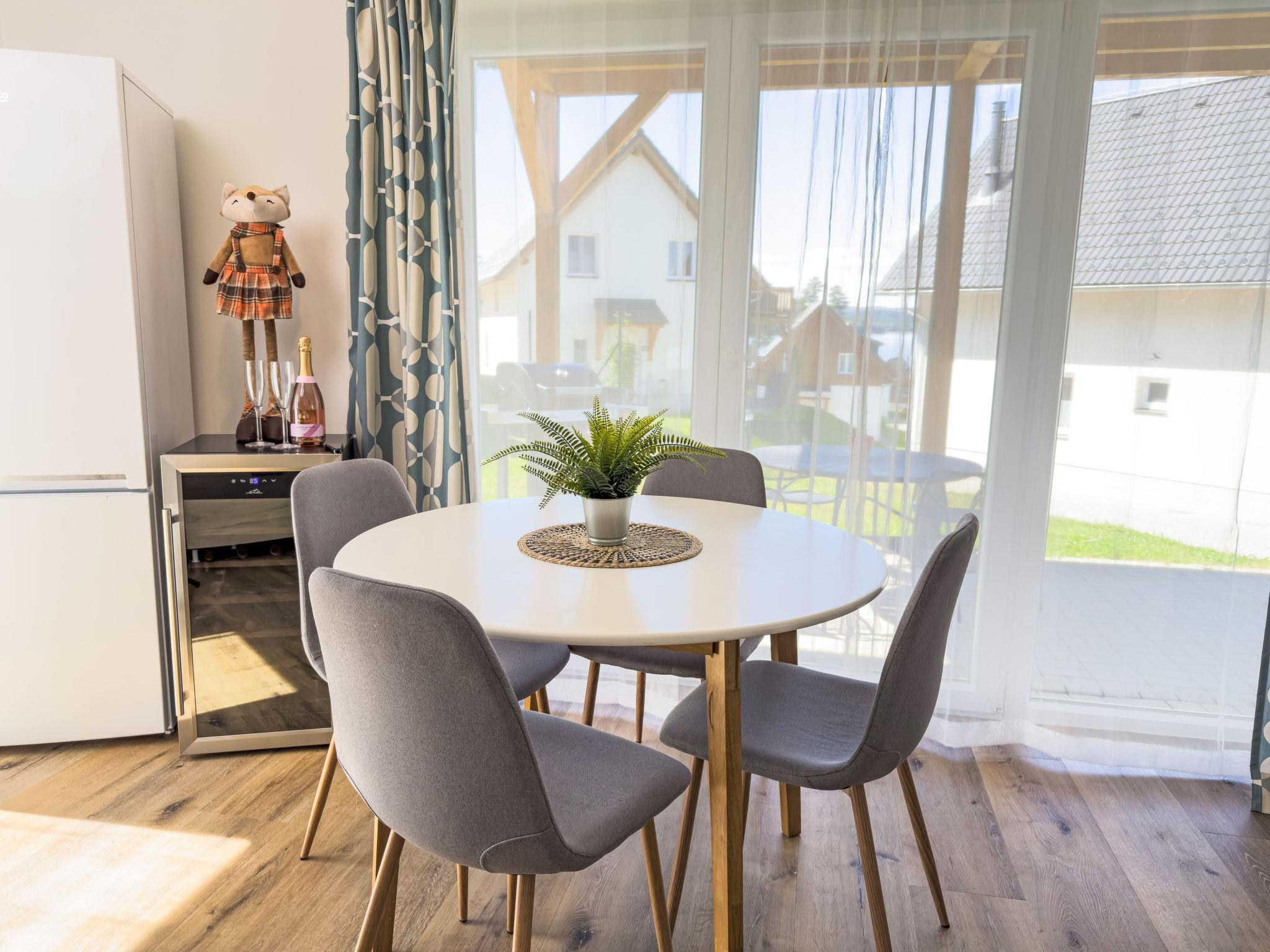 "Lakeside Village 39", 4-room house 72 m2 on 2 levels. Object suitable for 4 adults + 2 children. Comfortable and cosy furnishings: living room with 1 sofabed, Scandinavian wood stove and TV. 1 room with 1 folding bed. Kitchenette (4 hot plates, oven, dishwasher, toaster, kettle, microwave, electric coffee machine) with dining table. Exit to the terrace. Sep. WC. Electric heating, wood heating, floor heating. Upper floor: 1 room with 1 double bed. 1 room with 2 beds. Shower/WC. Terrace. Terrace furniture, barbecue. Partial view of the lake. Facilities: Internet (WiFi, free). Suitable for families. Dog (extra) on request.