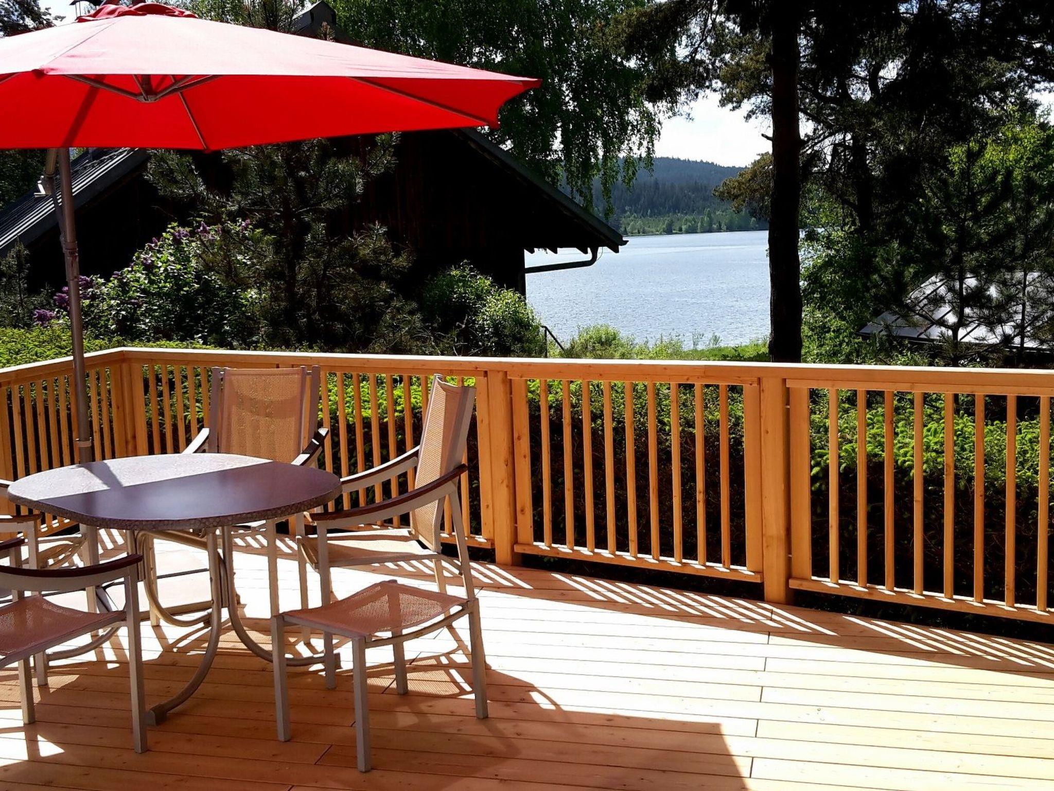 in 2018, a 22 m² wooden terrace with railings was added on the lake side, which offers you a great view of the lake and brings you even closer to it. An eight-piece garden set (four armchairs, 1x 2-seater bench, stool, table & swing umbrella), as well as a five-piece mosaic seating group consisting of two armchairs with cushions and a table, are placed on this area. The remaining space would also allow additional sun loungers to be placed there, which are also provided for your use. There is also a wooden settee outside, consisting of two benches with cushions, a table and parasol. At the back of the house there is an open fireplace with a barbecue grill. Rustic tree trunks serve as seating. And to explore the lake from the water, or to extend the range of leisure and fun activities, the house also has a rowing boat and a kayak that is easy for children to use. You are responsible for the safe and proper use of the boat. Please also note that lighting a fire on the lakeshore is prohibited.