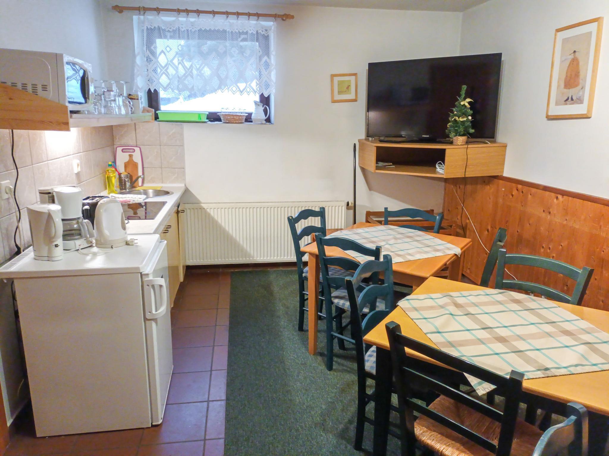 "Spacious Mountain Base", 5-room apartment on the ground floor. 2 rooms, each room with 2 beds and shower/WC. 1 room with 1 bed, 1 double bed and shower/WC. 1 room with 1 bed and 1 double bed. 1 room with 1 double bed and shower/WC. Small kitchen (4 ceramic glass hob hotplates, toaster, kettle, microwave, electric coffee machine) with dining table. Gas heating. Facilities: Internet (WiFi, free). Suitable for families. Maximum 1 pet/ dog allowed.