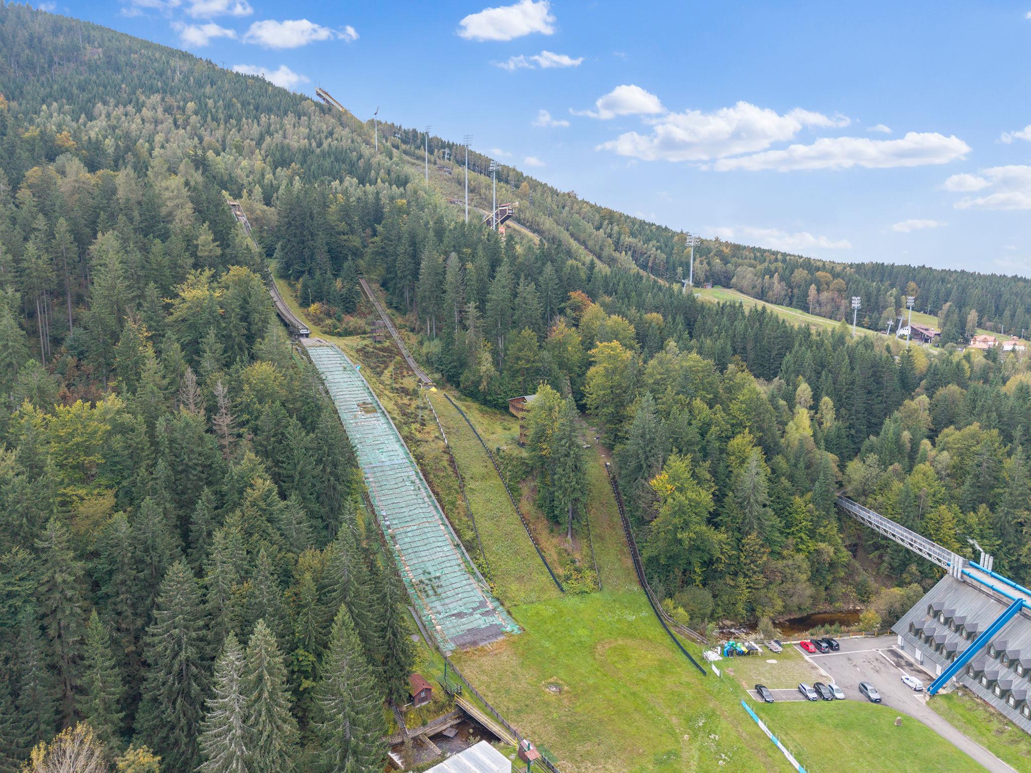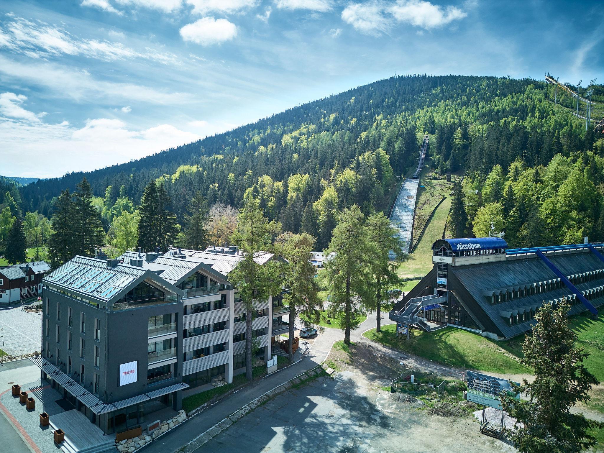 Modern residence. 500 m from the centre of Harrachov, in a quiet, sunny position, 600 m from the edge of the forest, 600 m from the skiing area. In the house: lift. Grocery, restaurant 70 m, bus stop "Harrachov, aut. Nádr." 300 m, railway station "Harrachov" 3.5 km, outdoor swimming pool 2 km, thermal baths "Thermy Cieplickie PL" 30 km. Golf course (9 hole) 4.5 km, tennis 2 km, indoor tennis centre 2 km, minigolf, chair lift, slopes, ski rental, ski school, children's ski school 600 m, cross country ski track 100 m. Nearby attractions: Expozice Šindelka 400 m, Hornické muzeum 1 km, Mumlavský vodopád, Bobová dráha 1.7 km, Korenov 8 km, Jizerka 15 km, Jablonec nad Nisou 29 km, Termy Cieplickie (PL) 30 km, Liberec 35 km, Ješted 40 km. Well-known ski regions can easily be reached: Harrachov 600 m, Zákoutí 2 km, Rýžovište 3 km, Príchovice 10 km, Rokytnice nad Jizerou 15 km. Hiking paths: Western City Karpacz(Pl) 40 km, Park miniatury Kowary44km,Karpacz (Pl) 39 km, Giganteria Piechowice(Pl) 23 km.