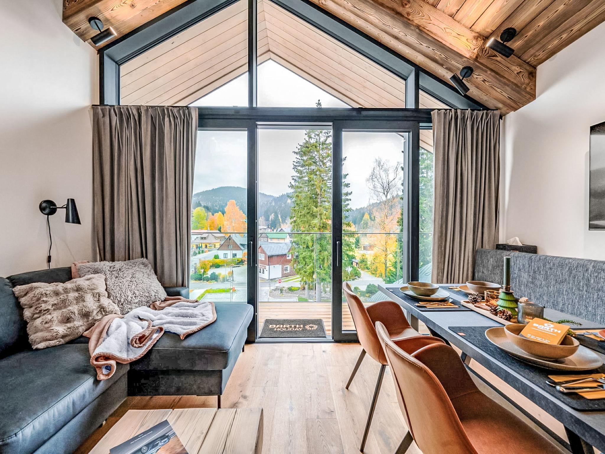"Corso", 3-room apartment on 4th floor. Very comfortable and beautiful furnishings: large living/dining room with panoramic window with 1 sofabed, open-hearth fireplace, TV and electric heating. Exit to the terrace. 1 room with 1 x 1 bunk beds. 1 room with 1 double bed. Exit to the terrace. Open kitchen (oven, dishwasher, 4 ceramic glass hob hotplates, toaster, kettle, microwave, freezer, electric coffee machine) with dining table. Shower/WC. Terrace furniture, box-room. Very beautiful view of the mountains, the ski run and the forest. Facilities: sauna, hair dryer. Internet (WiFi, free). Garage. E-charging station. Please note: non-smokers only.