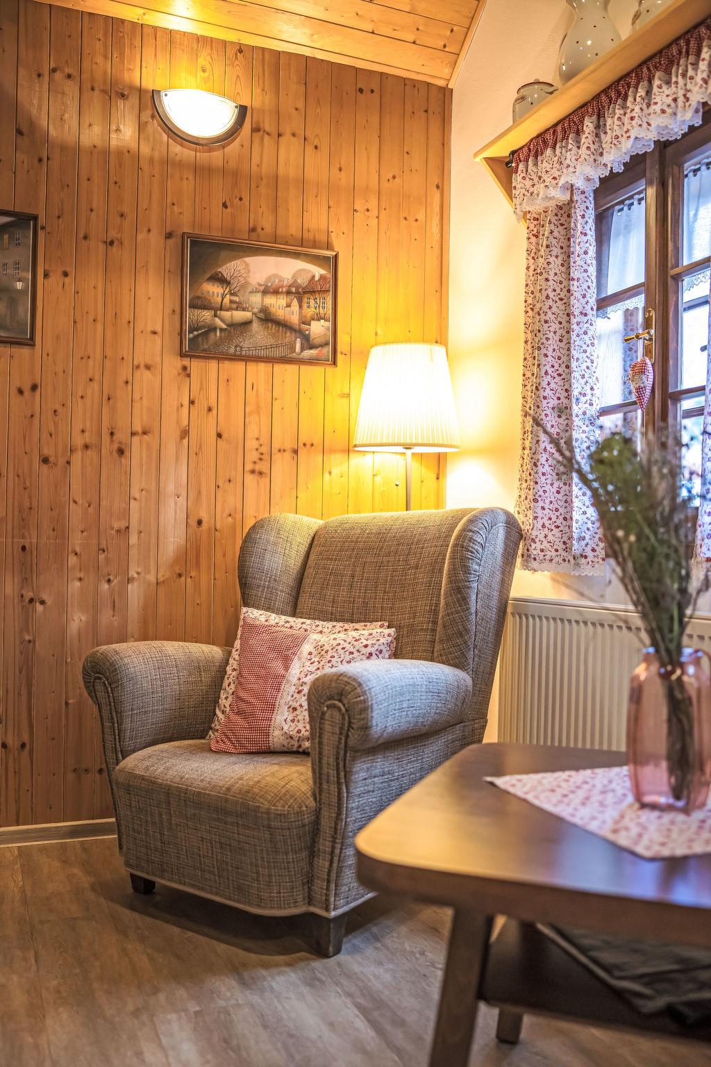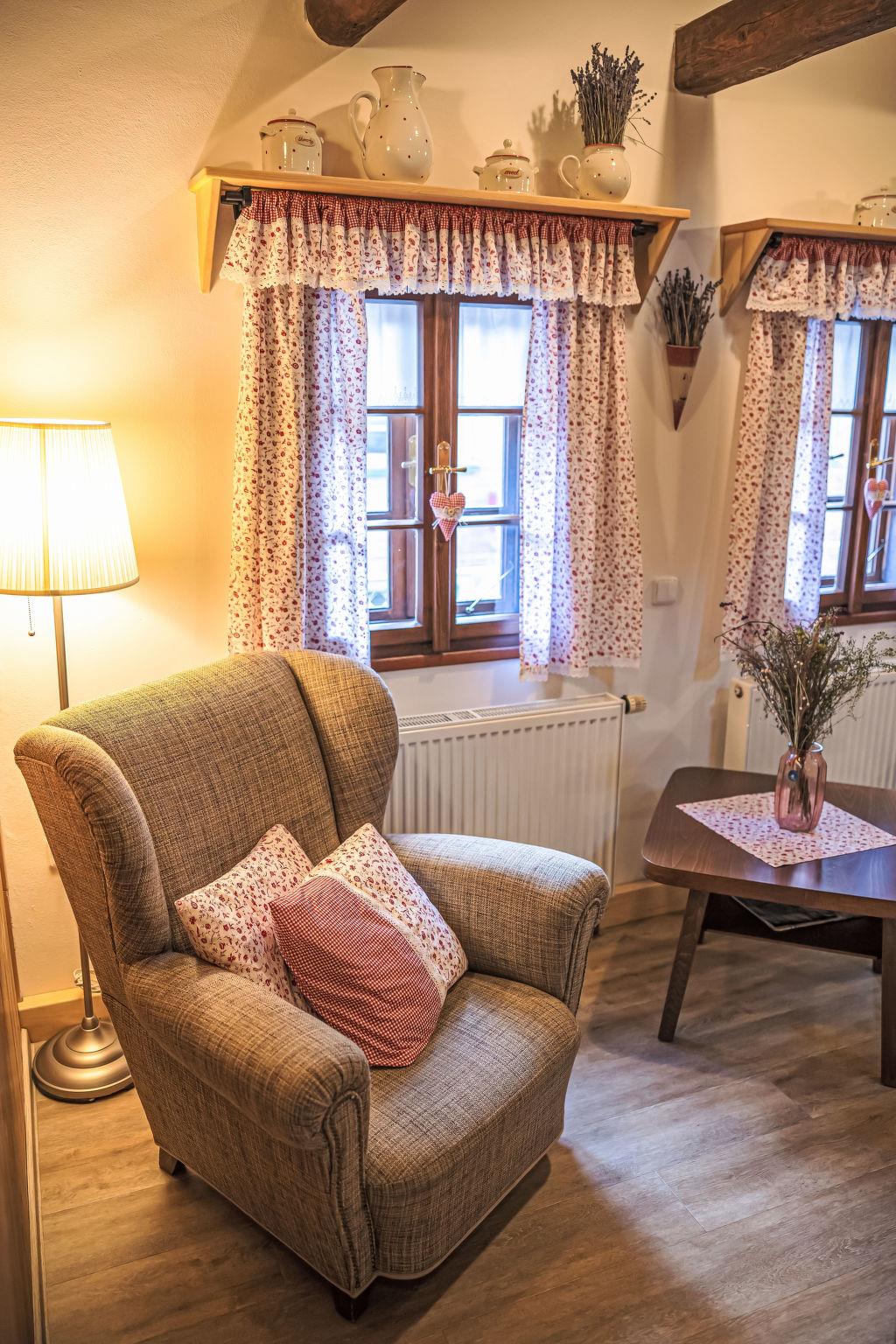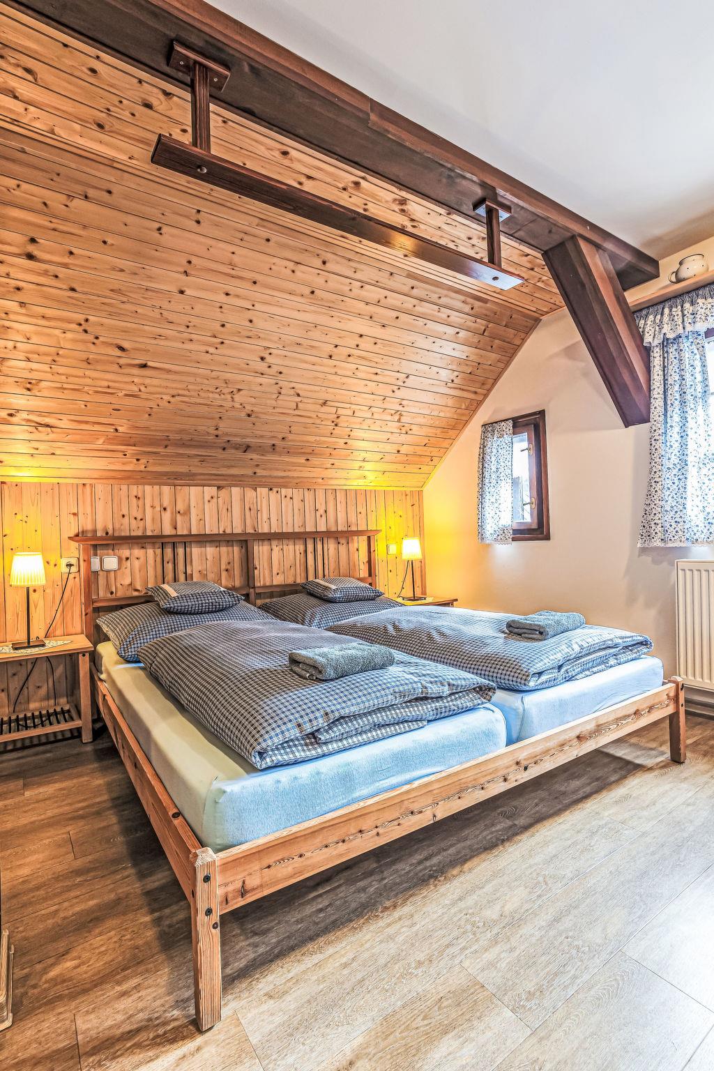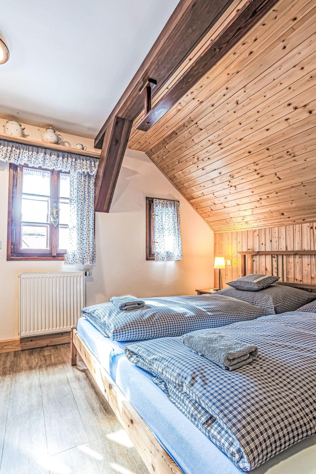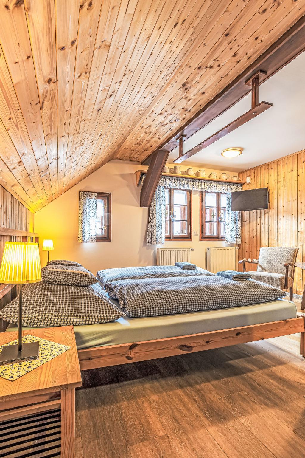 "Maršovka", 8-room house on 3 levels. Very stylish and cosy furnishings: large lounge. Kitchen (oven, dishwasher, 4 ceramic glass hob hotplates, kettle, microwave, electric coffee machine) with dining table. Bathroom, sep. WC. Electric heating. Upper floor: (steep stair), 1 room with sloping ceilings with 1 double bed. 1 room with sloping ceilings with 1 double bed. 1 room with sloping ceilings with 1 bed and 1 double bed. 1 room with sloping ceilings with 1 double sofabed (length 170 cm), 1 double bed. Shower/WC. 2nd upper floor: (steep stair), 1 room with sloping ceilings with 2 beds. 1 room with sloping ceilings with 2 beds and 1 sofabed. Wooden floors. Facilities: Internet (WiFi, free). Please note: suitable for families. Non-smoking house. 1 small pet/ dog allowed. Smoke alarm, fire extinguisher, no lift.