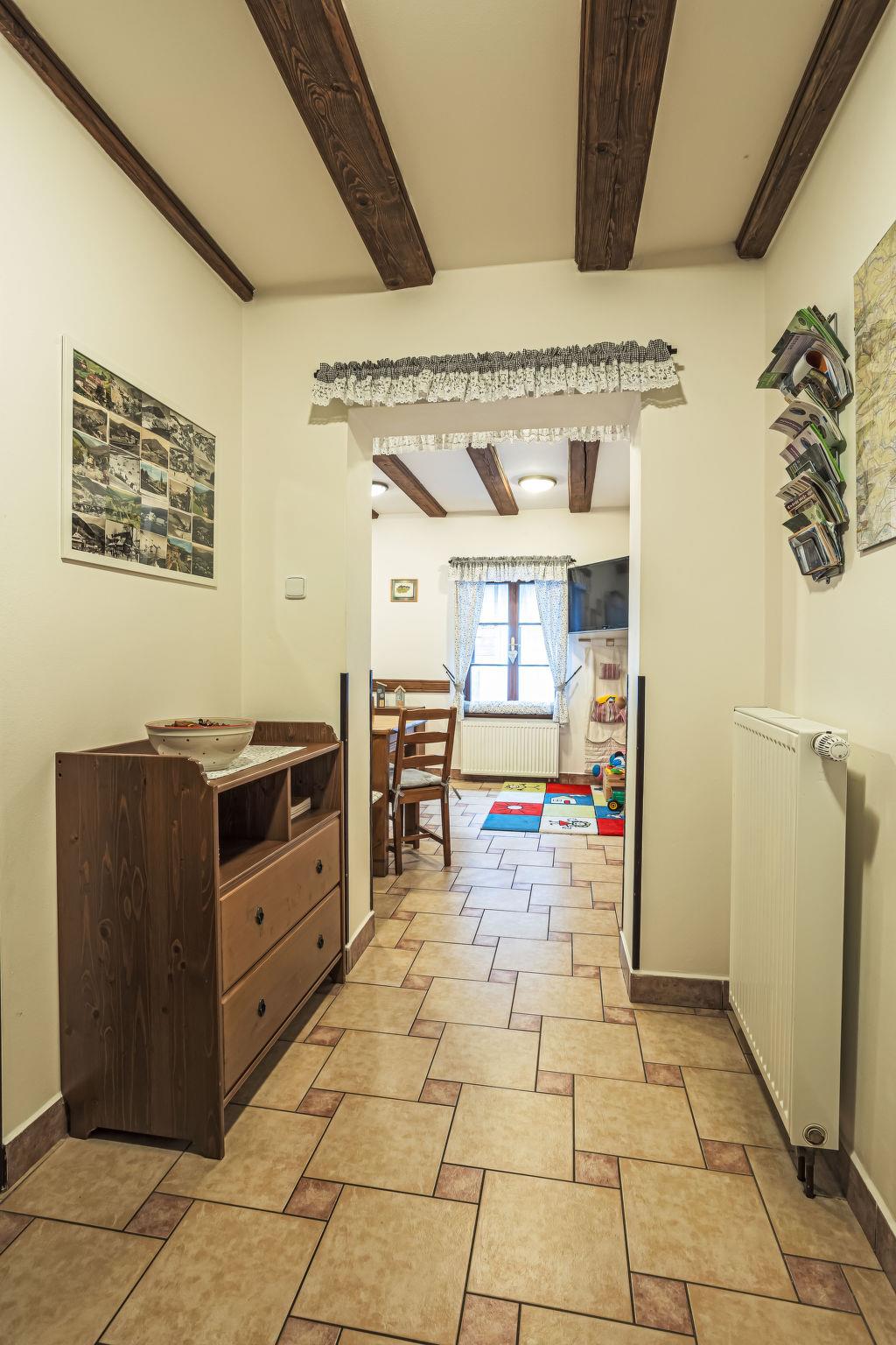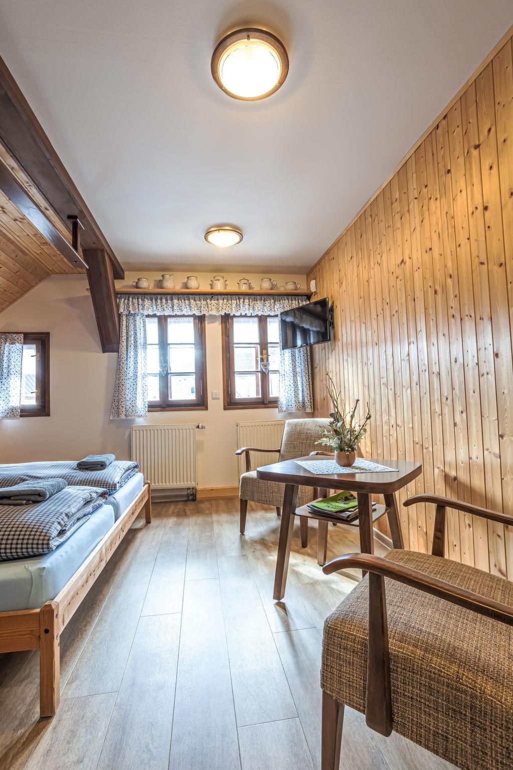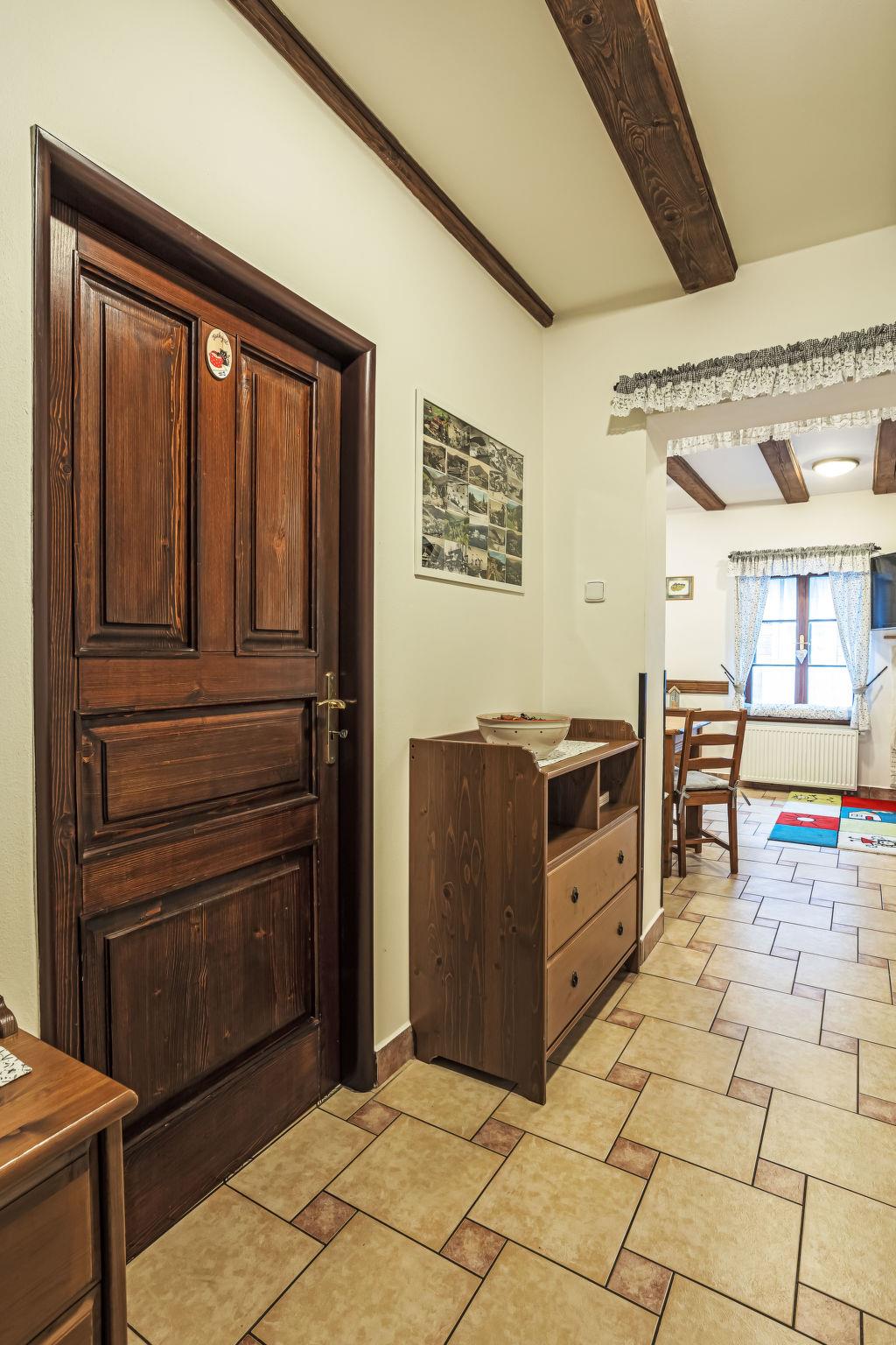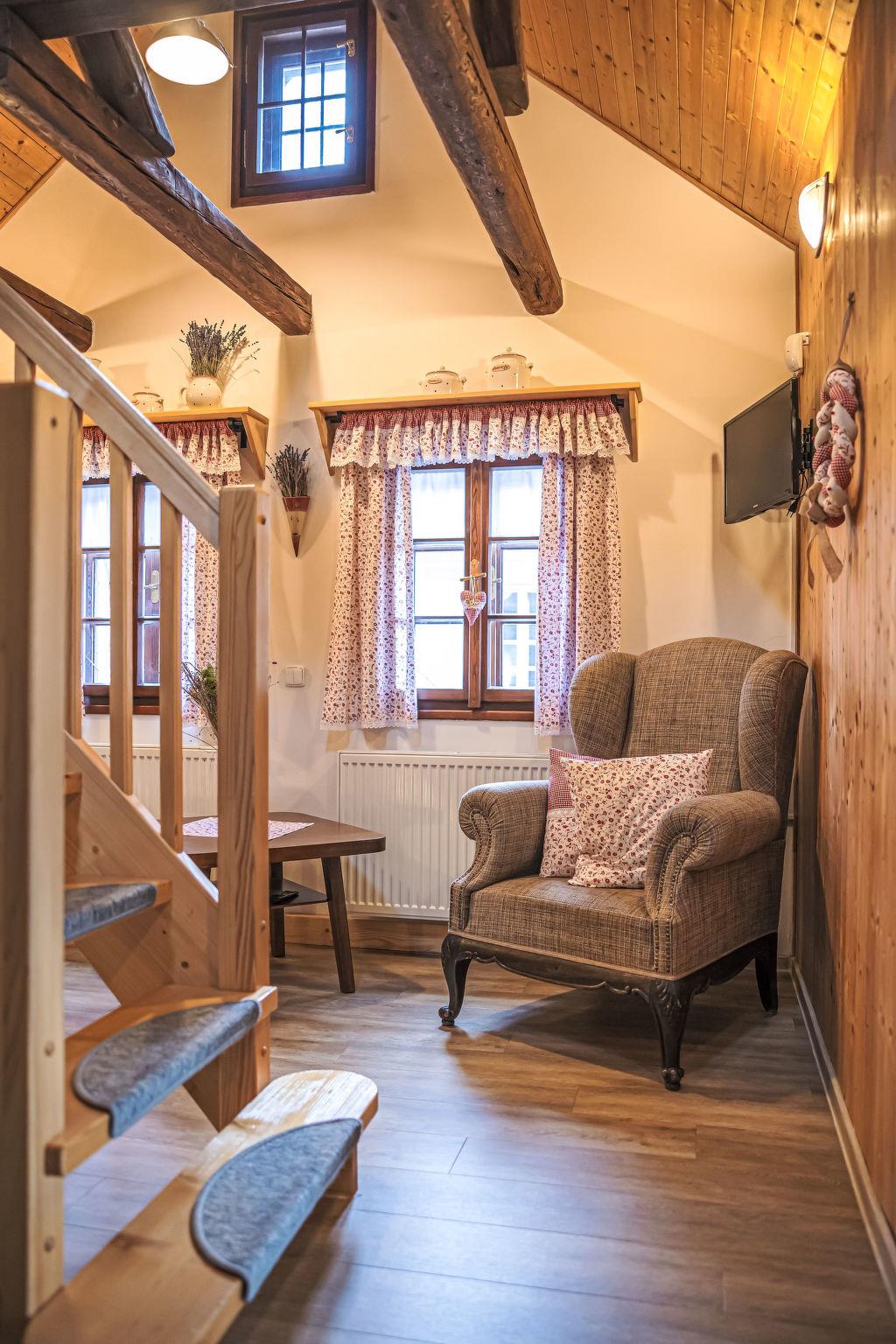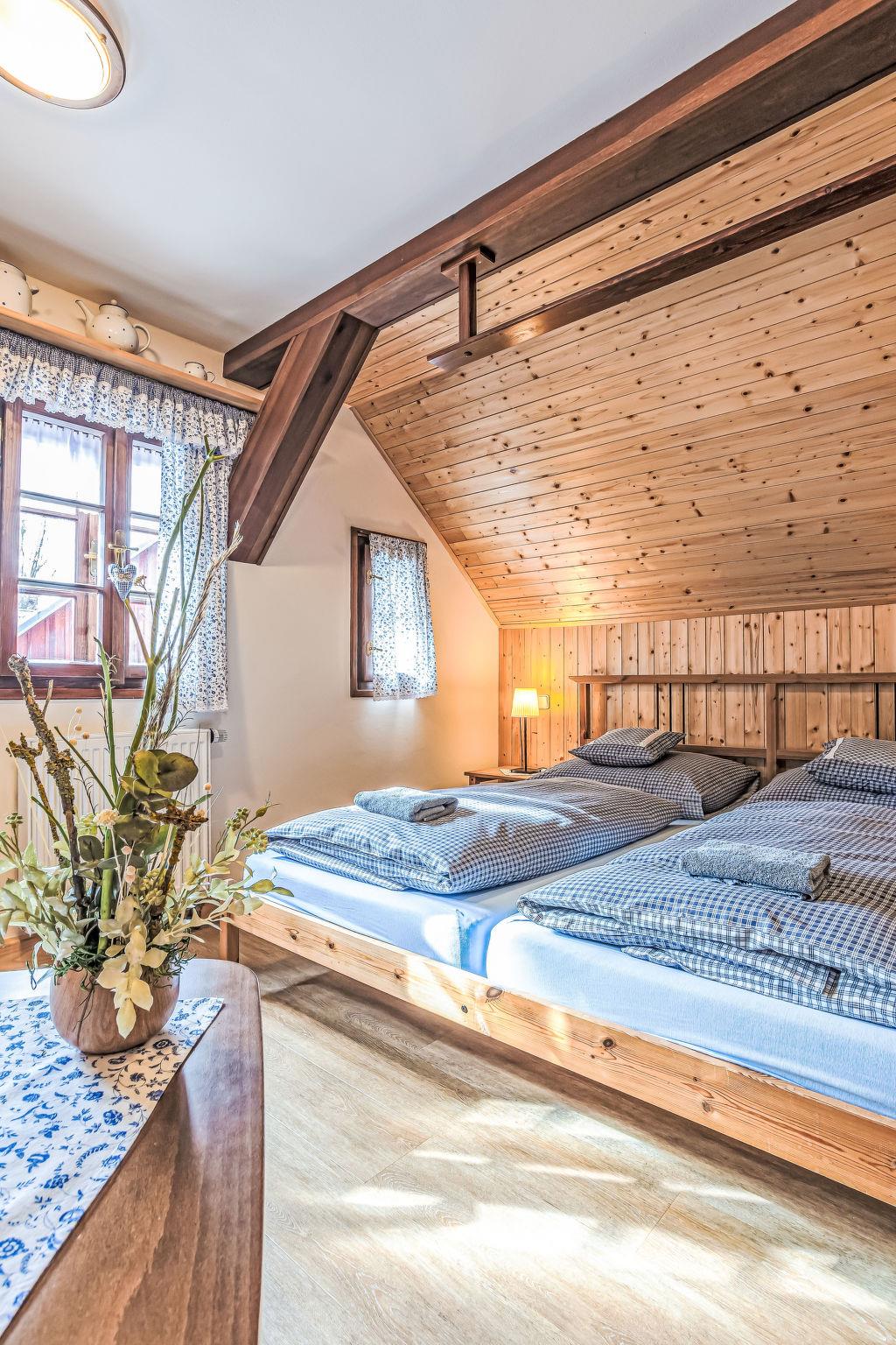 "Maršovka", 8-room house on 3 levels. Very stylish and cosy furnishings: large lounge. Kitchen (oven, dishwasher, 4 ceramic glass hob hotplates, kettle, microwave, electric coffee machine) with dining table. Bathroom, sep. WC. Electric heating. Upper floor: (steep stair), 1 room with sloping ceilings with 1 double bed. 1 room with sloping ceilings with 1 double bed. 1 room with sloping ceilings with 1 bed and 1 double bed. 1 room with sloping ceilings with 1 double sofabed (length 170 cm), 1 double bed. Shower/WC. 2nd upper floor: (steep stair), 1 room with sloping ceilings with 2 beds. 1 room with sloping ceilings with 2 beds and 1 sofabed. Wooden floors. Facilities: Internet (WiFi, free). Please note: suitable for families. Non-smoking house. 1 small pet/ dog allowed. Smoke alarm, fire extinguisher, no lift.