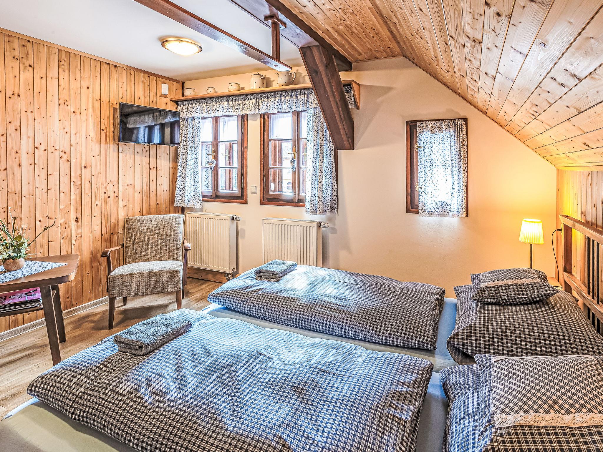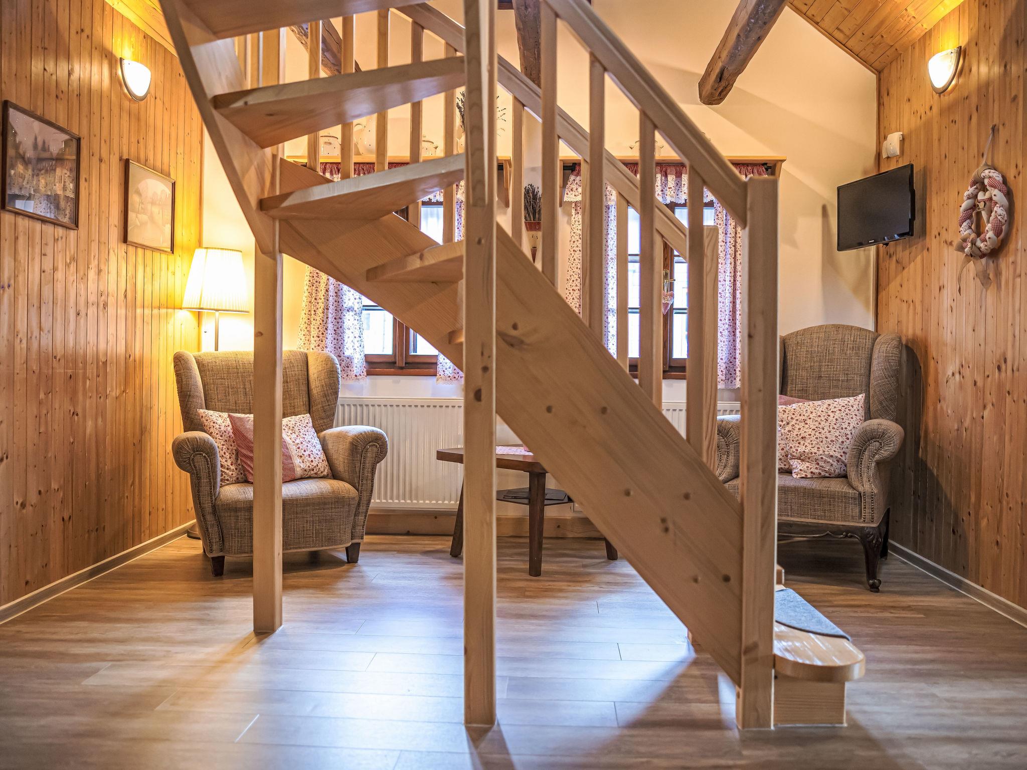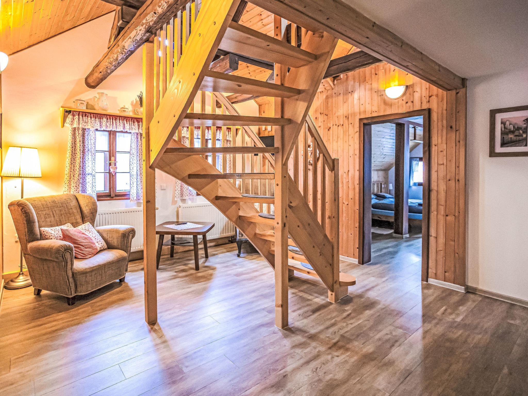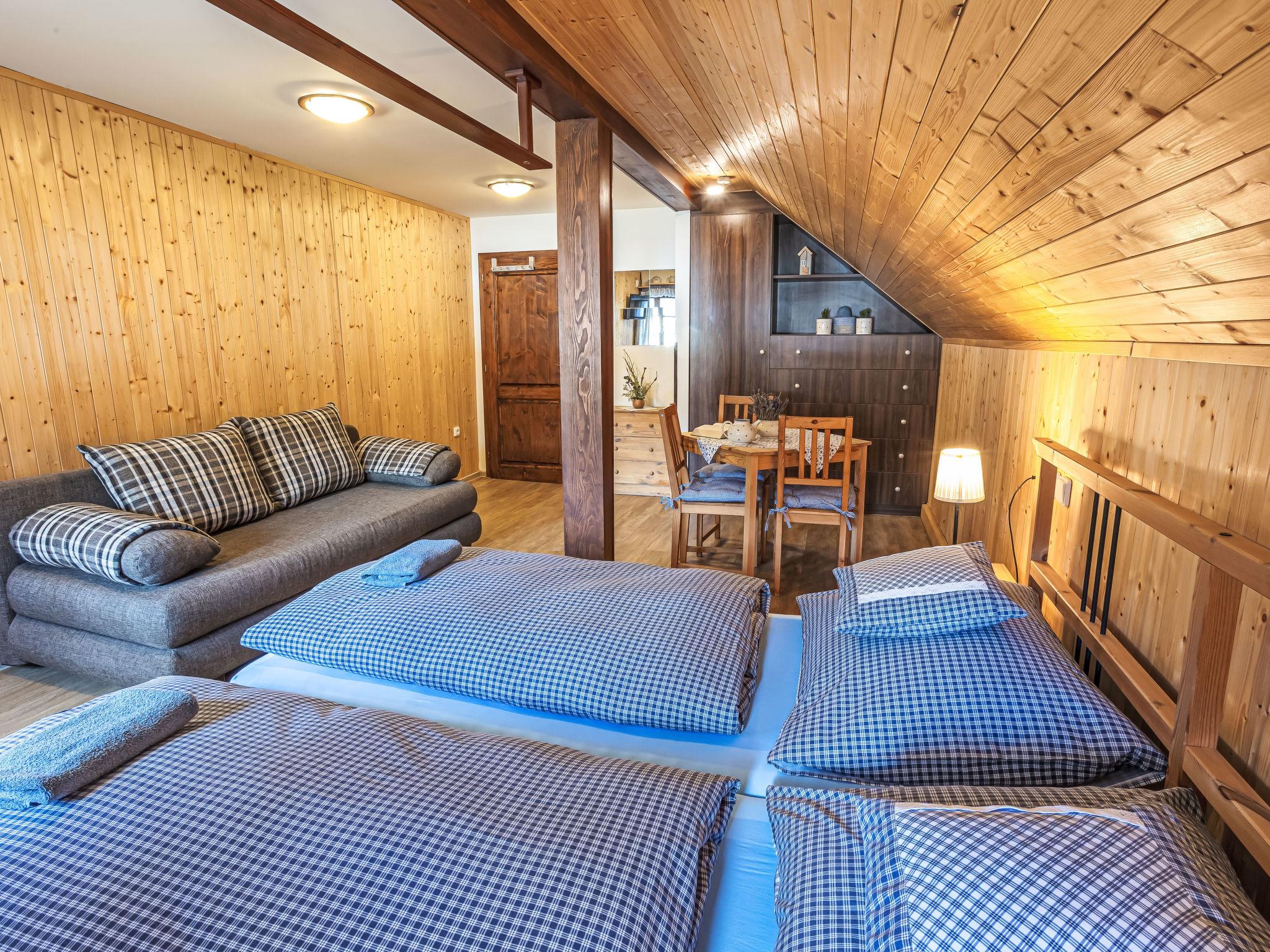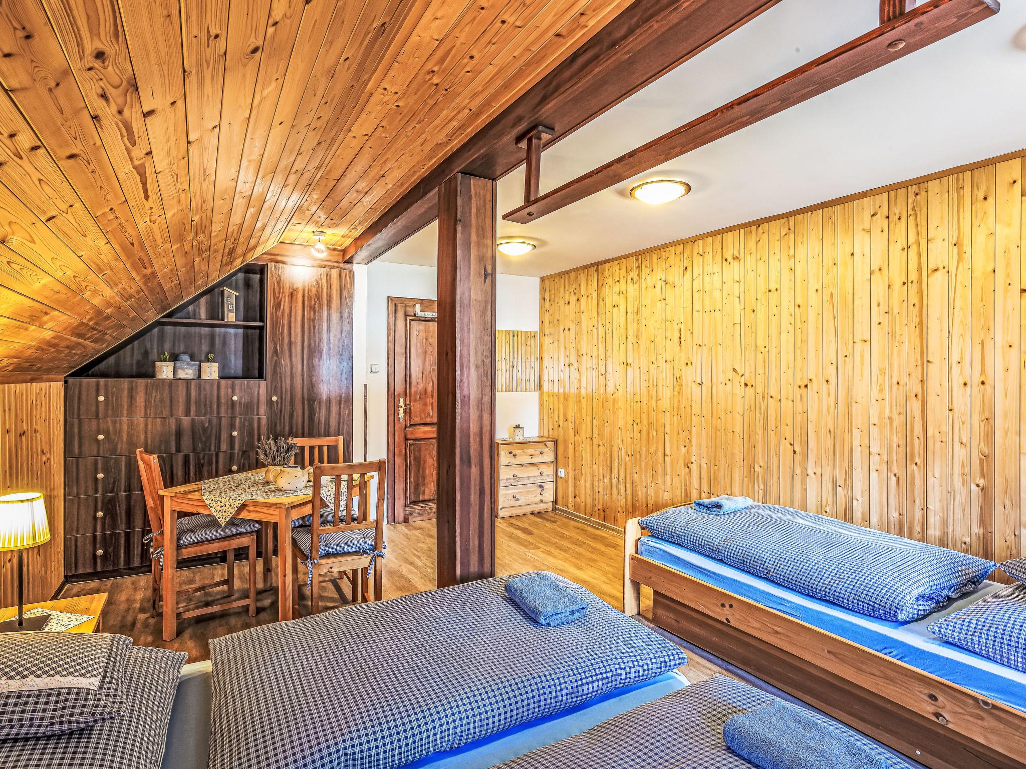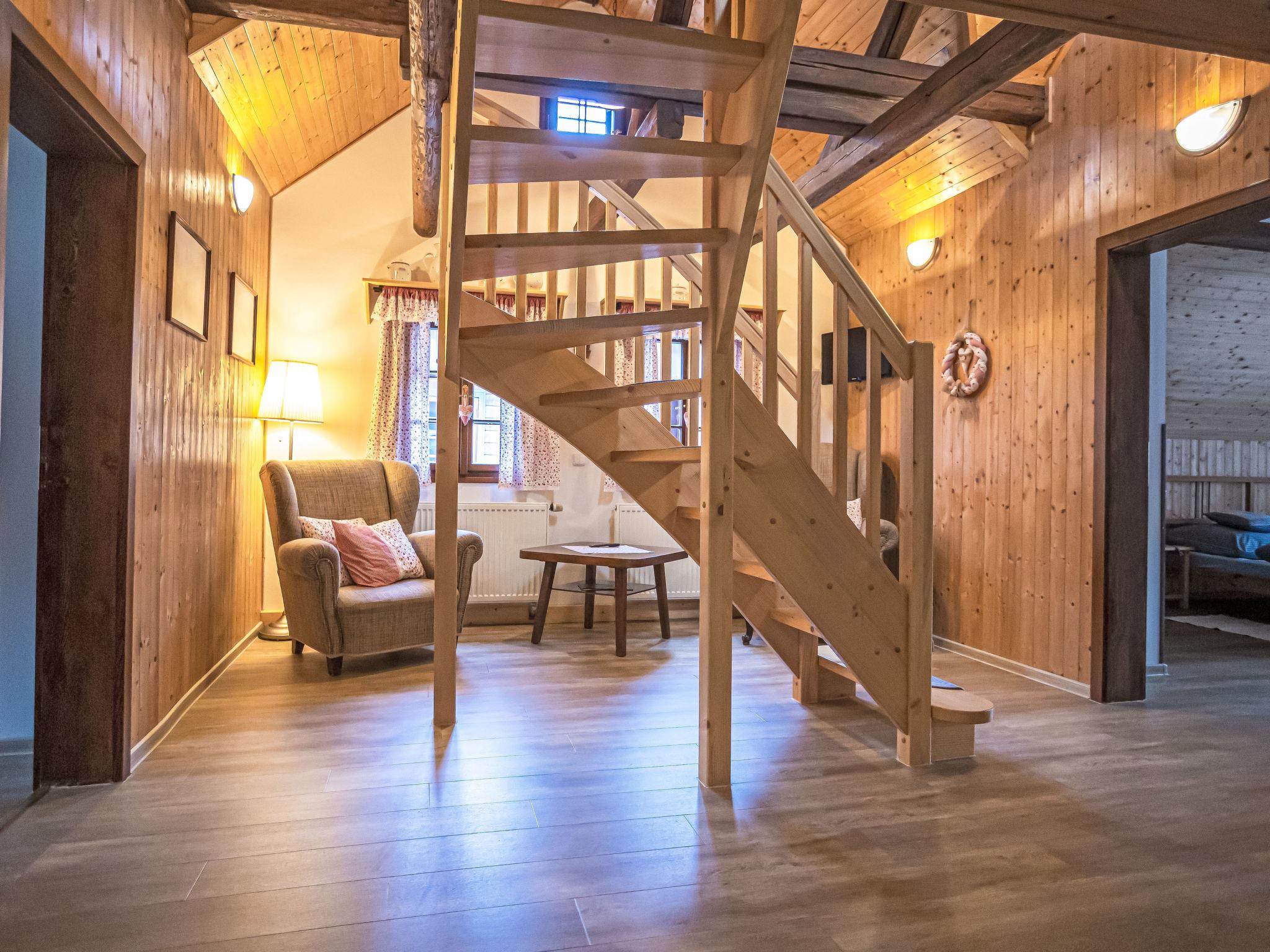 "Maršovka", 8-room house on 3 levels. Very stylish and cosy furnishings: large lounge. Kitchen (oven, dishwasher, 4 ceramic glass hob hotplates, kettle, microwave, electric coffee machine) with dining table. Bathroom, sep. WC. Electric heating. Upper floor: (steep stair), 1 room with sloping ceilings with 1 double bed. 1 room with sloping ceilings with 1 double bed. 1 room with sloping ceilings with 1 bed and 1 double bed. 1 room with sloping ceilings with 1 double sofabed (length 170 cm), 1 double bed. Shower/WC. 2nd upper floor: (steep stair), 1 room with sloping ceilings with 2 beds. 1 room with sloping ceilings with 2 beds and 1 sofabed. Wooden floors. Facilities: Internet (WiFi, free). Please note: suitable for families. Non-smoking house. 1 small pet/ dog allowed. Smoke alarm, fire extinguisher, no lift.