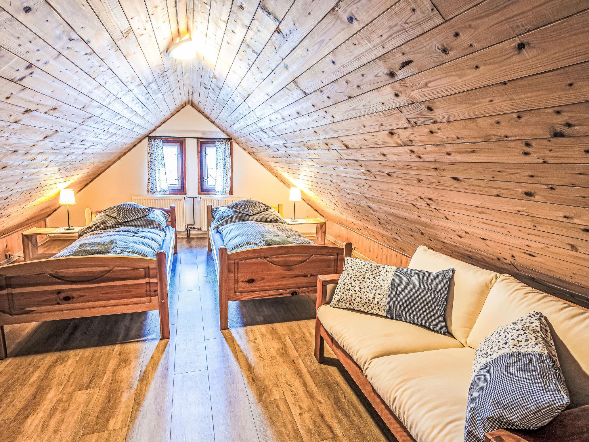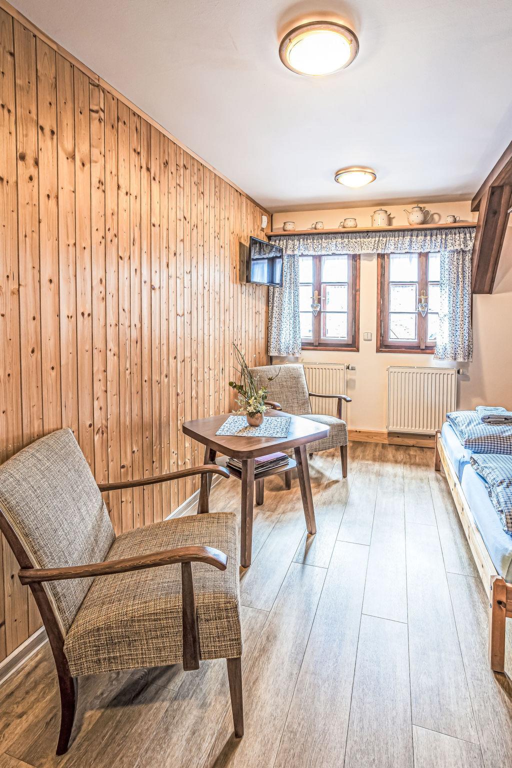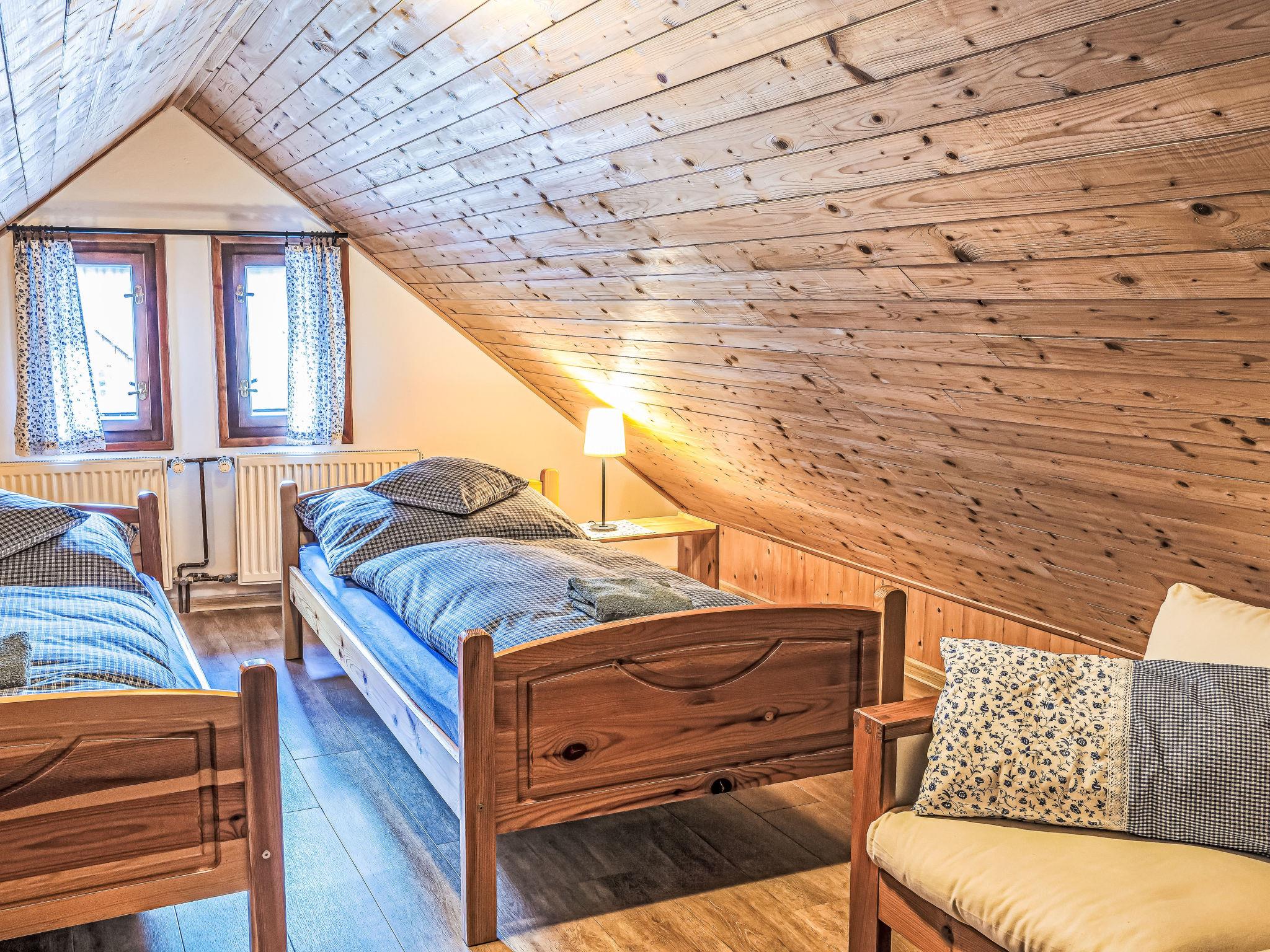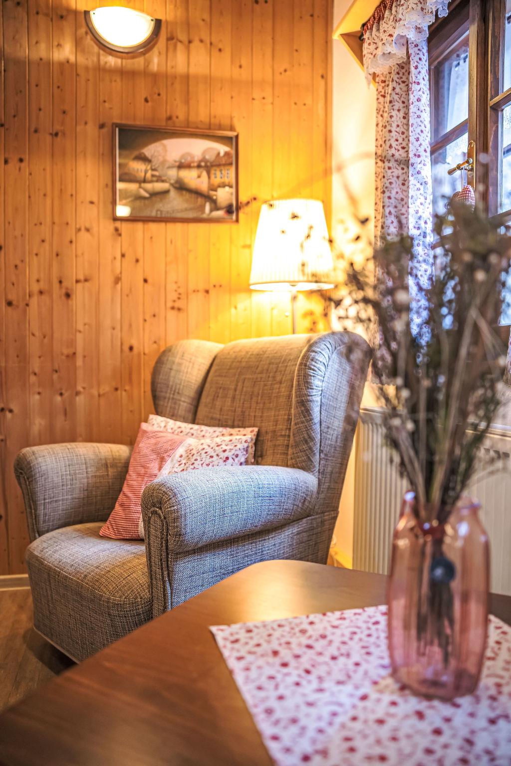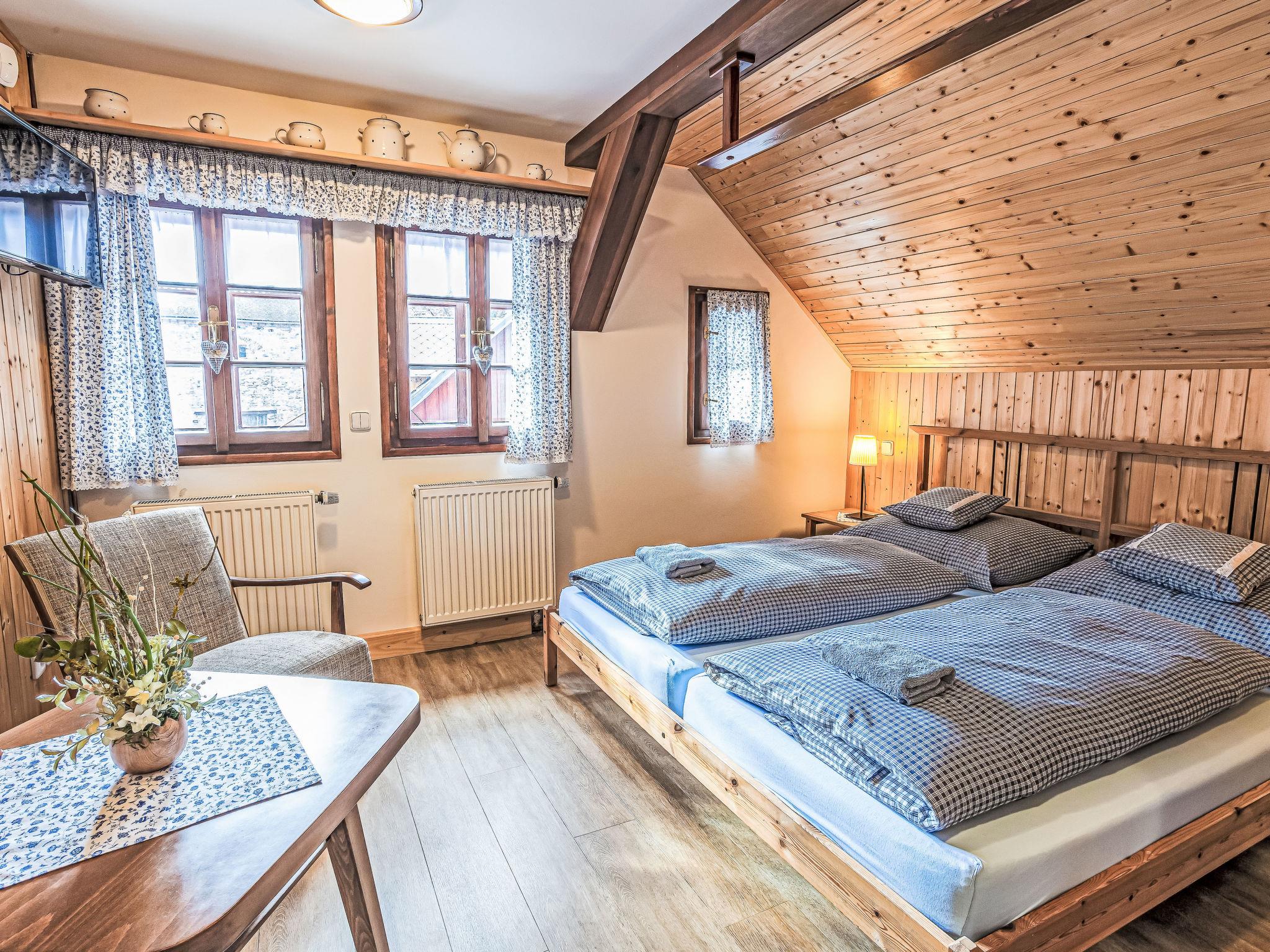 "Maršovka", 8-room house on 3 levels. Very stylish and cosy furnishings: large lounge. Kitchen (oven, dishwasher, 4 ceramic glass hob hotplates, kettle, microwave, electric coffee machine) with dining table. Bathroom, sep. WC. Electric heating. Upper floor: (steep stair), 1 room with sloping ceilings with 1 double bed. 1 room with sloping ceilings with 1 double bed. 1 room with sloping ceilings with 1 bed and 1 double bed. 1 room with sloping ceilings with 1 double sofabed (length 170 cm), 1 double bed. Shower/WC. 2nd upper floor: (steep stair), 1 room with sloping ceilings with 2 beds. 1 room with sloping ceilings with 2 beds and 1 sofabed. Wooden floors. Facilities: Internet (WiFi, free). Please note: suitable for families. Non-smoking house. 1 small pet/ dog allowed. Smoke alarm, fire extinguisher, no lift.
