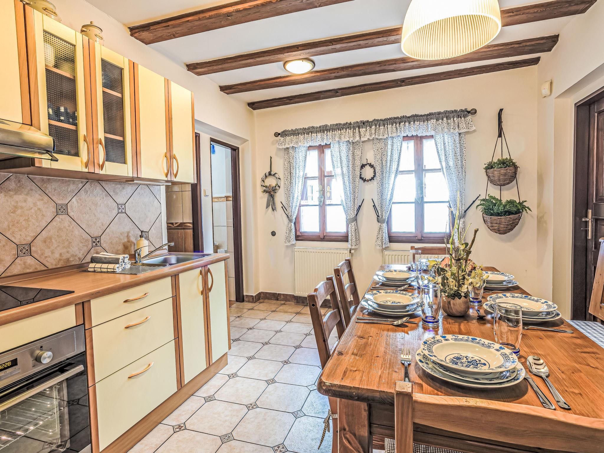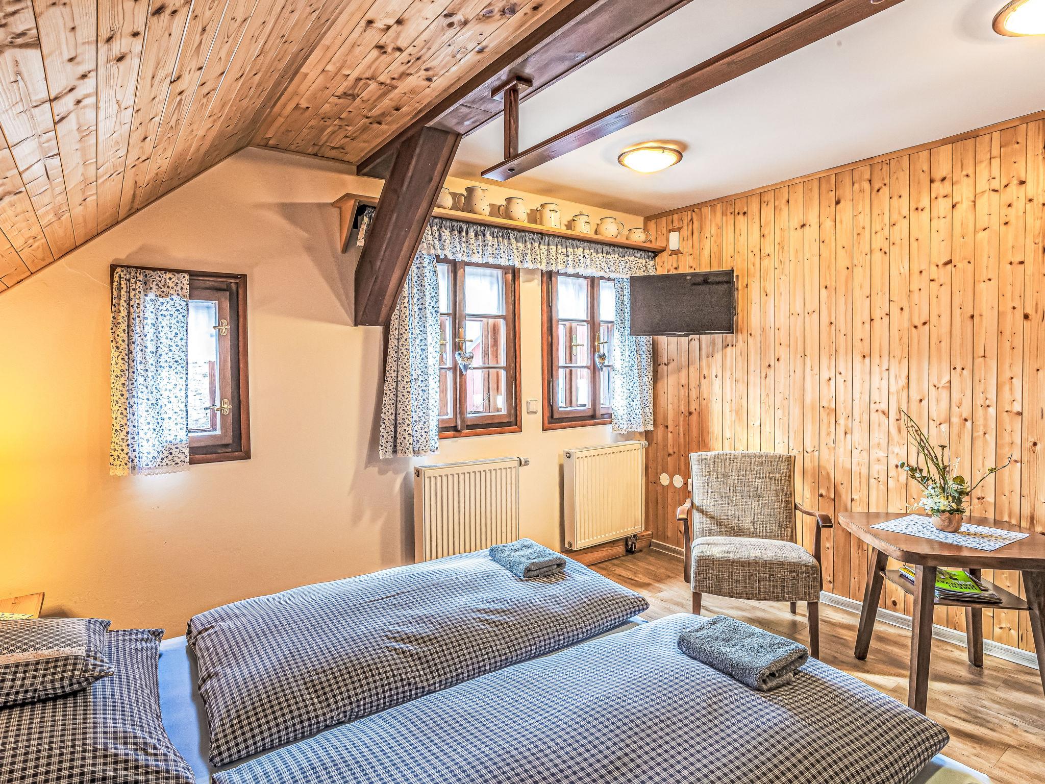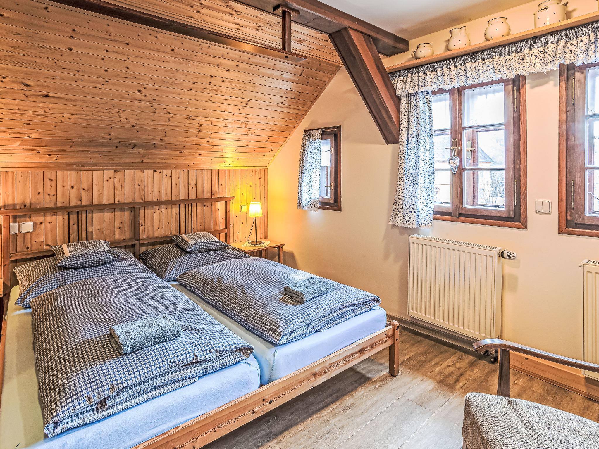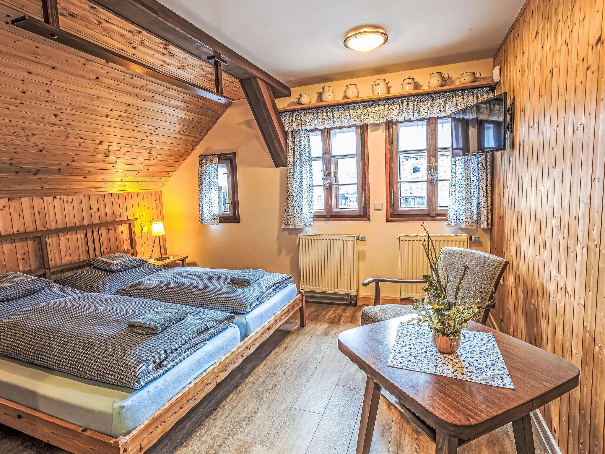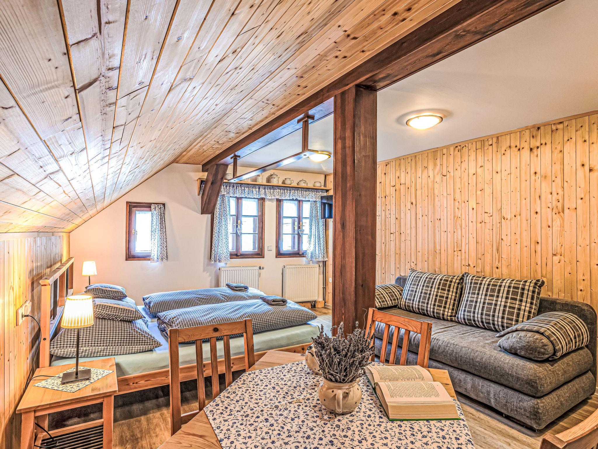 "Maršovka", 8-room house on 3 levels. Very stylish and cosy furnishings: large lounge. Kitchen (oven, dishwasher, 4 ceramic glass hob hotplates, kettle, microwave, electric coffee machine) with dining table. Bathroom, sep. WC. Electric heating. Upper floor: (steep stair), 1 room with sloping ceilings with 1 double bed. 1 room with sloping ceilings with 1 double bed. 1 room with sloping ceilings with 1 bed and 1 double bed. 1 room with sloping ceilings with 1 double sofabed (length 170 cm), 1 double bed. Shower/WC. 2nd upper floor: (steep stair), 1 room with sloping ceilings with 2 beds. 1 room with sloping ceilings with 2 beds and 1 sofabed. Wooden floors. Facilities: Internet (WiFi, free). Please note: suitable for families. Non-smoking house. 1 small pet/ dog allowed. Smoke alarm, fire extinguisher, no lift.