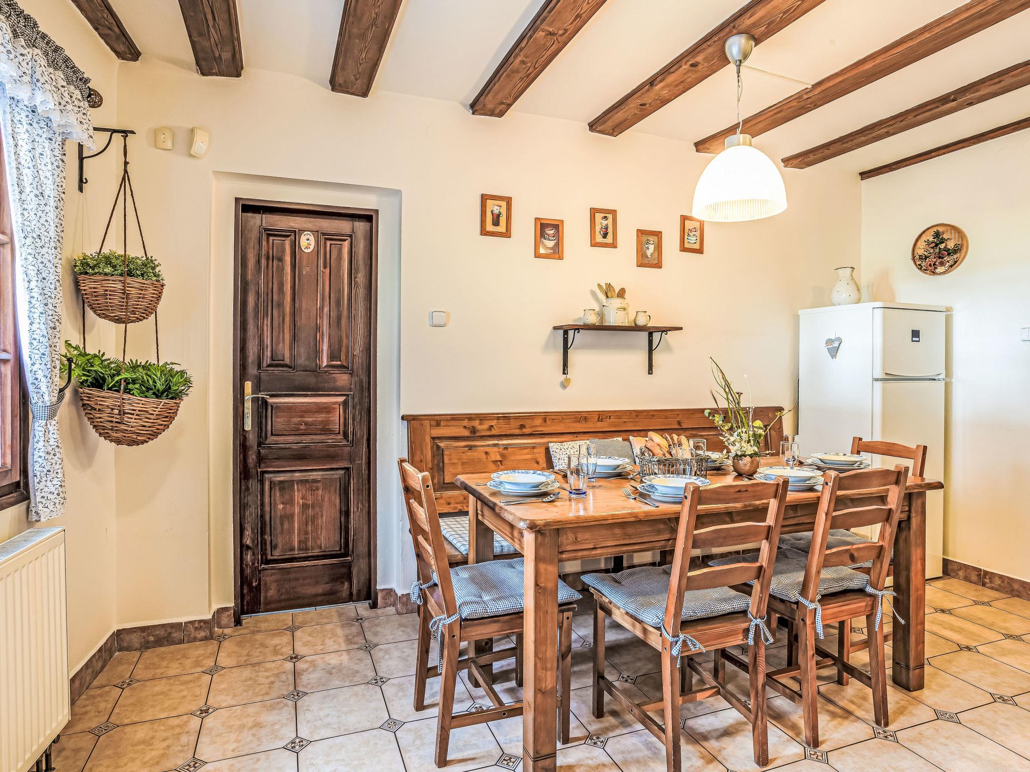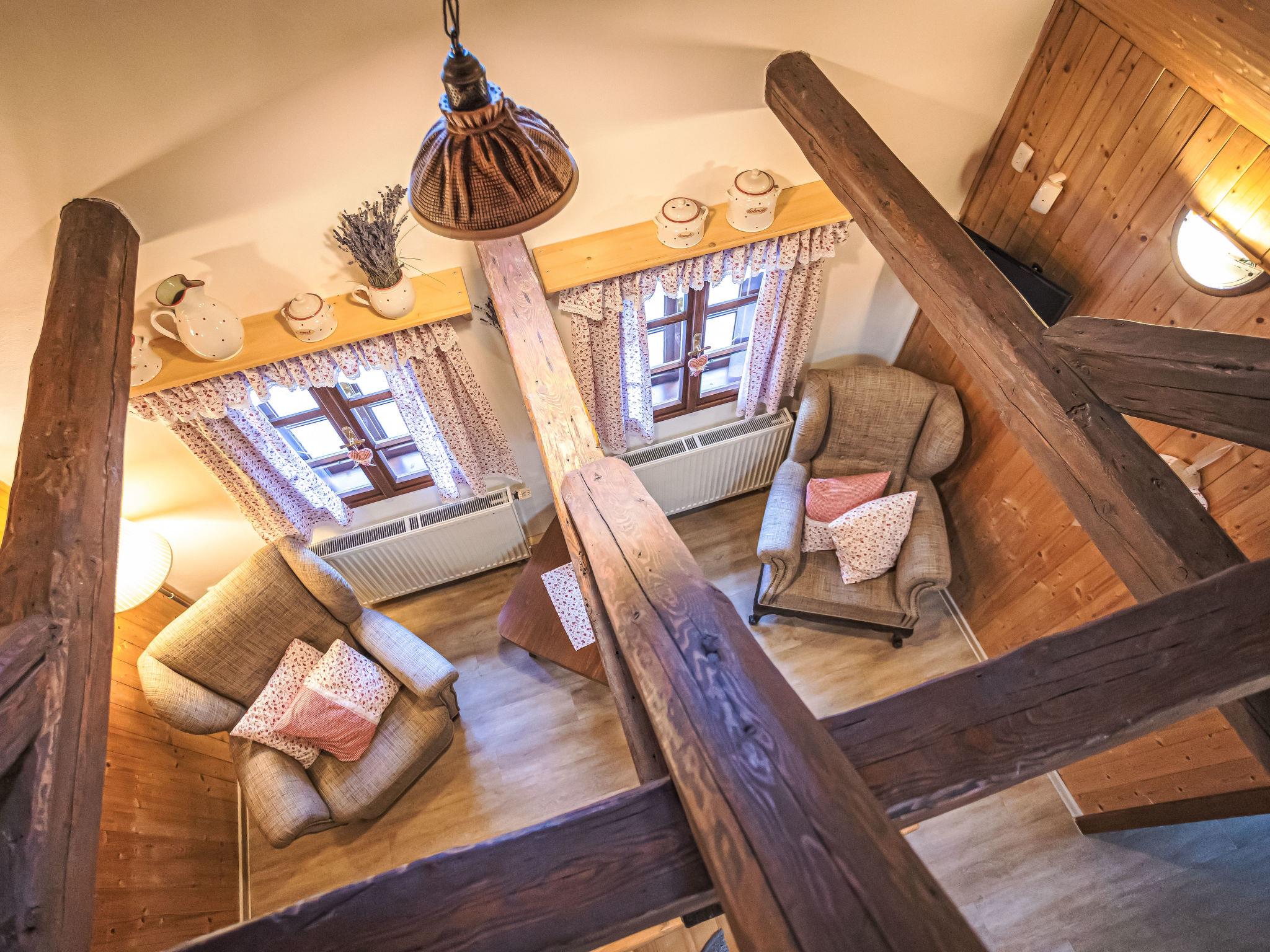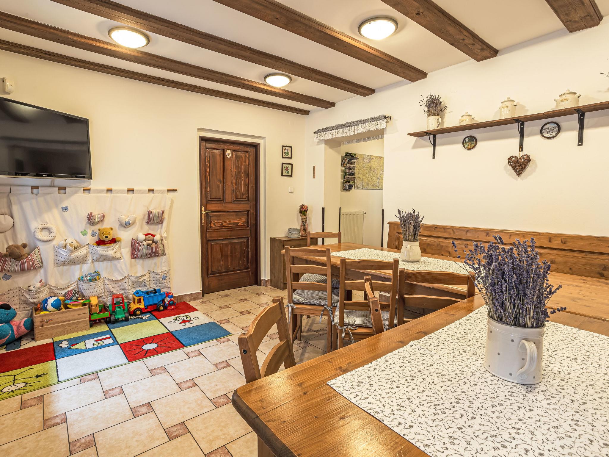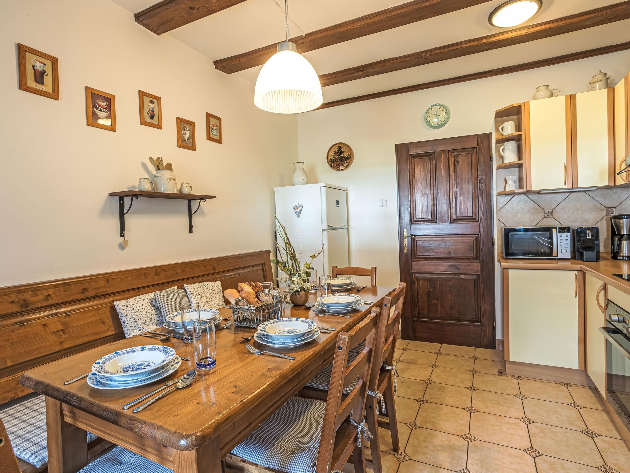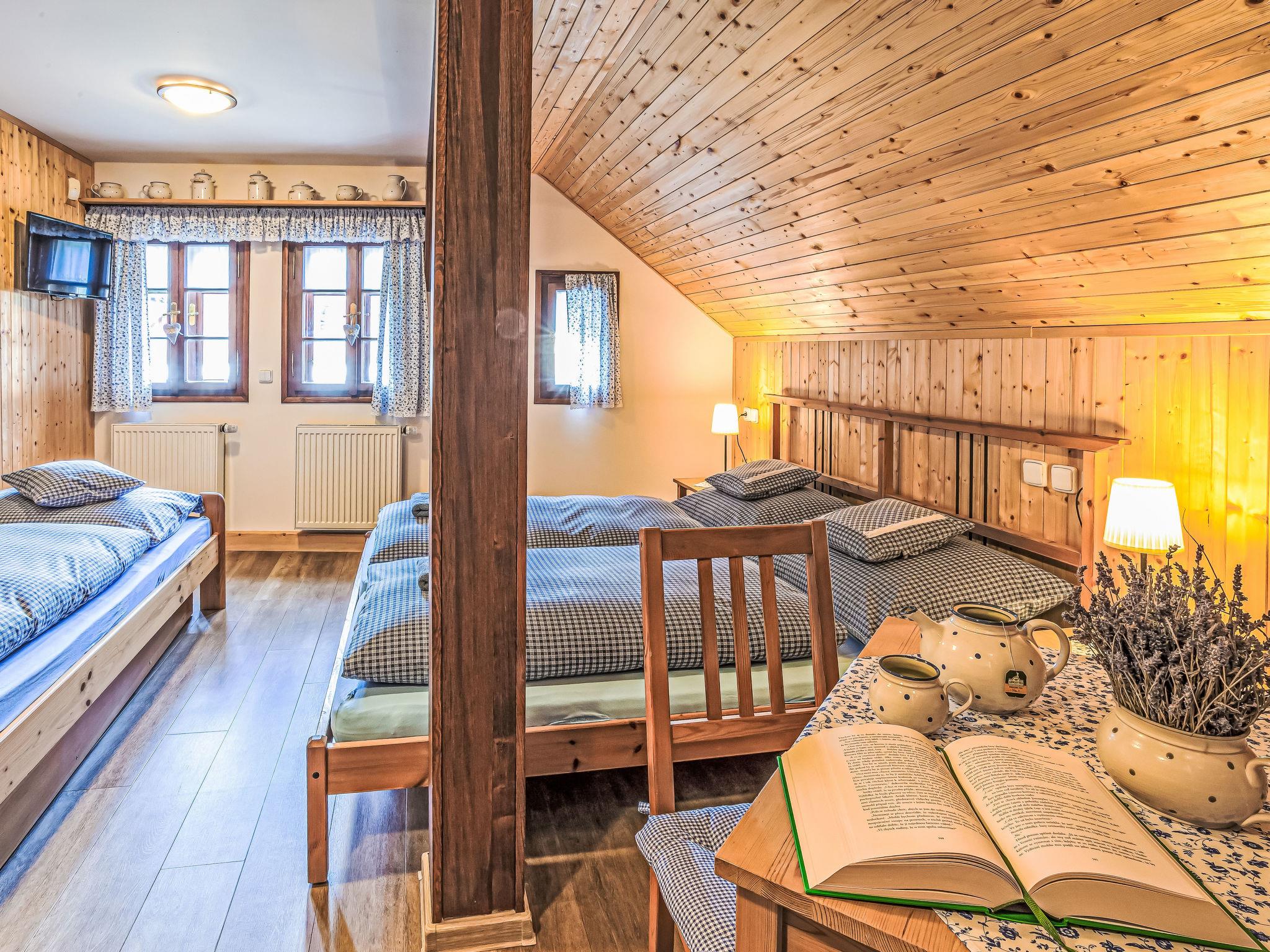 "Maršovka", 8-room house on 3 levels. Very stylish and cosy furnishings: large lounge. Kitchen (oven, dishwasher, 4 ceramic glass hob hotplates, kettle, microwave, electric coffee machine) with dining table. Bathroom, sep. WC. Electric heating. Upper floor: (steep stair), 1 room with sloping ceilings with 1 double bed. 1 room with sloping ceilings with 1 double bed. 1 room with sloping ceilings with 1 bed and 1 double bed. 1 room with sloping ceilings with 1 double sofabed (length 170 cm), 1 double bed. Shower/WC. 2nd upper floor: (steep stair), 1 room with sloping ceilings with 2 beds. 1 room with sloping ceilings with 2 beds and 1 sofabed. Wooden floors. Facilities: Internet (WiFi, free). Please note: suitable for families. Non-smoking house. 1 small pet/ dog allowed. Smoke alarm, fire extinguisher, no lift.