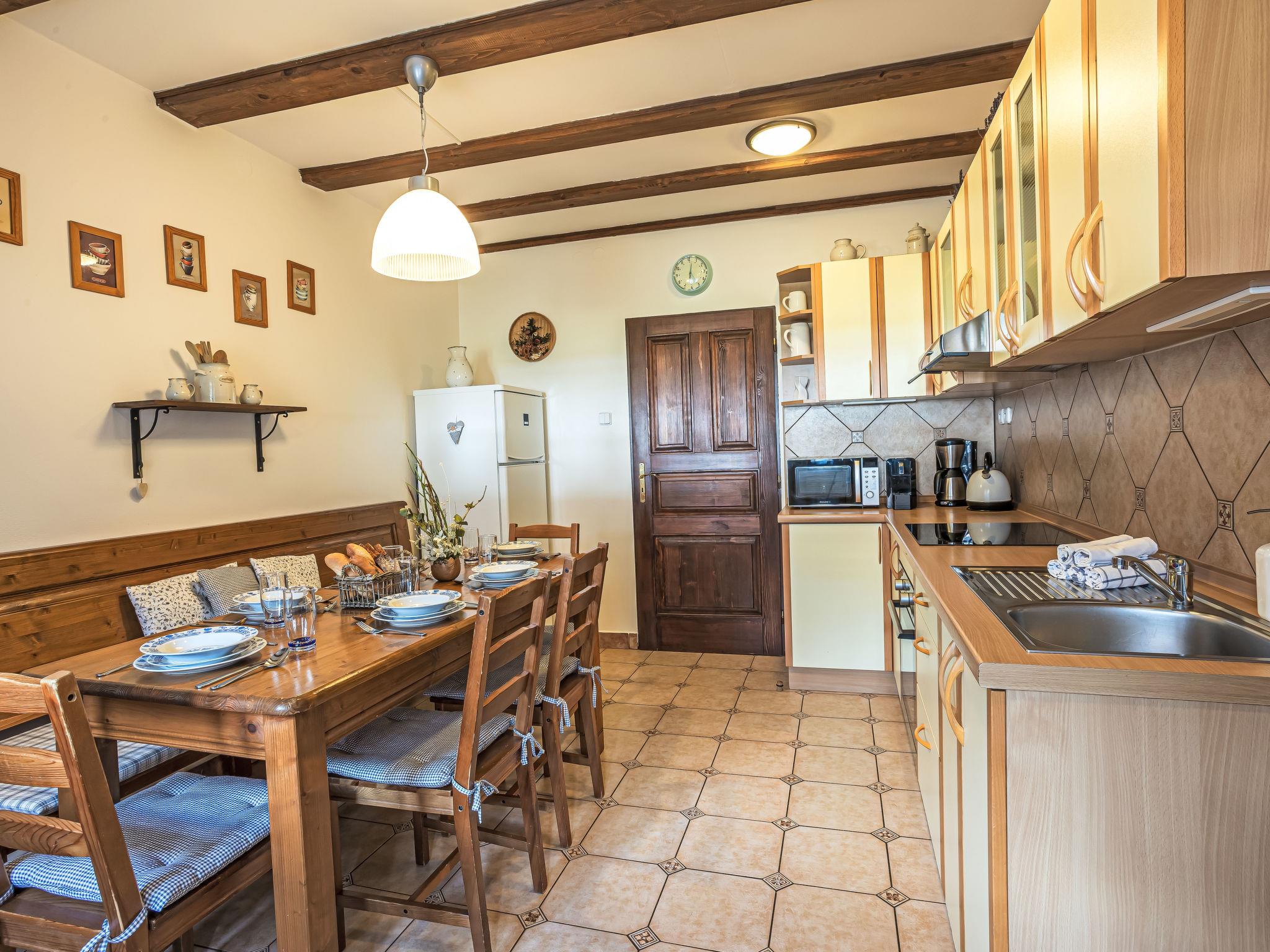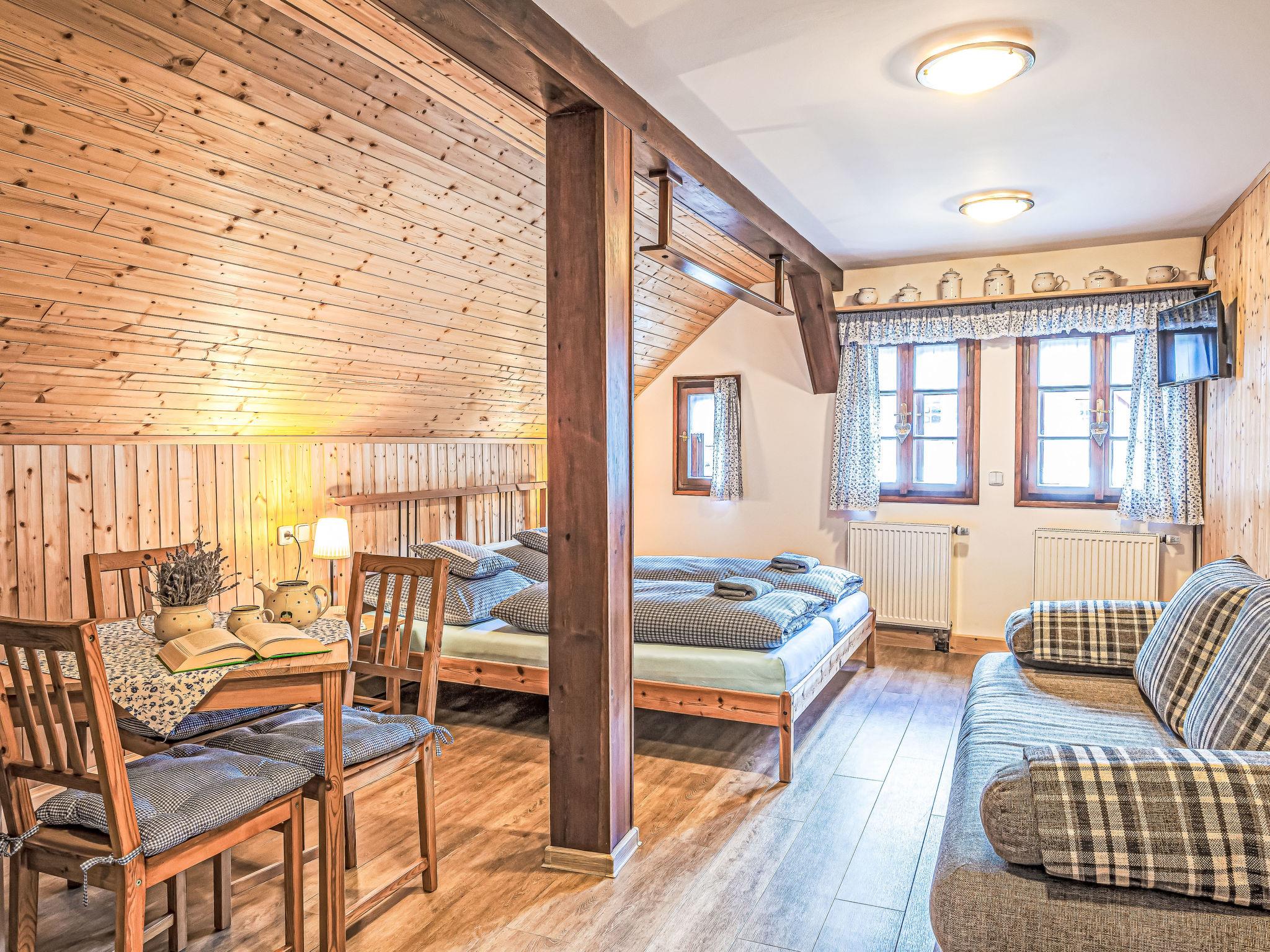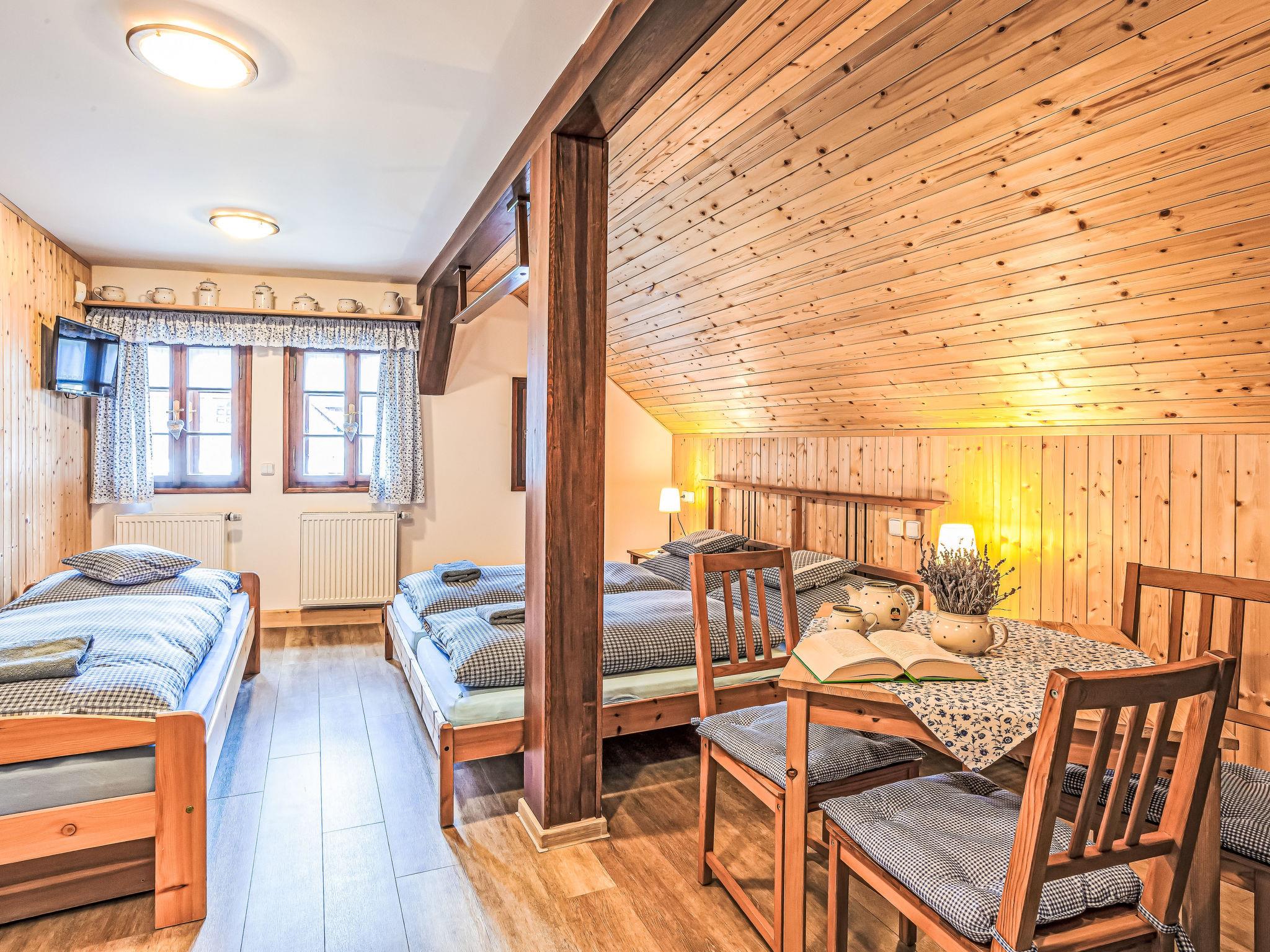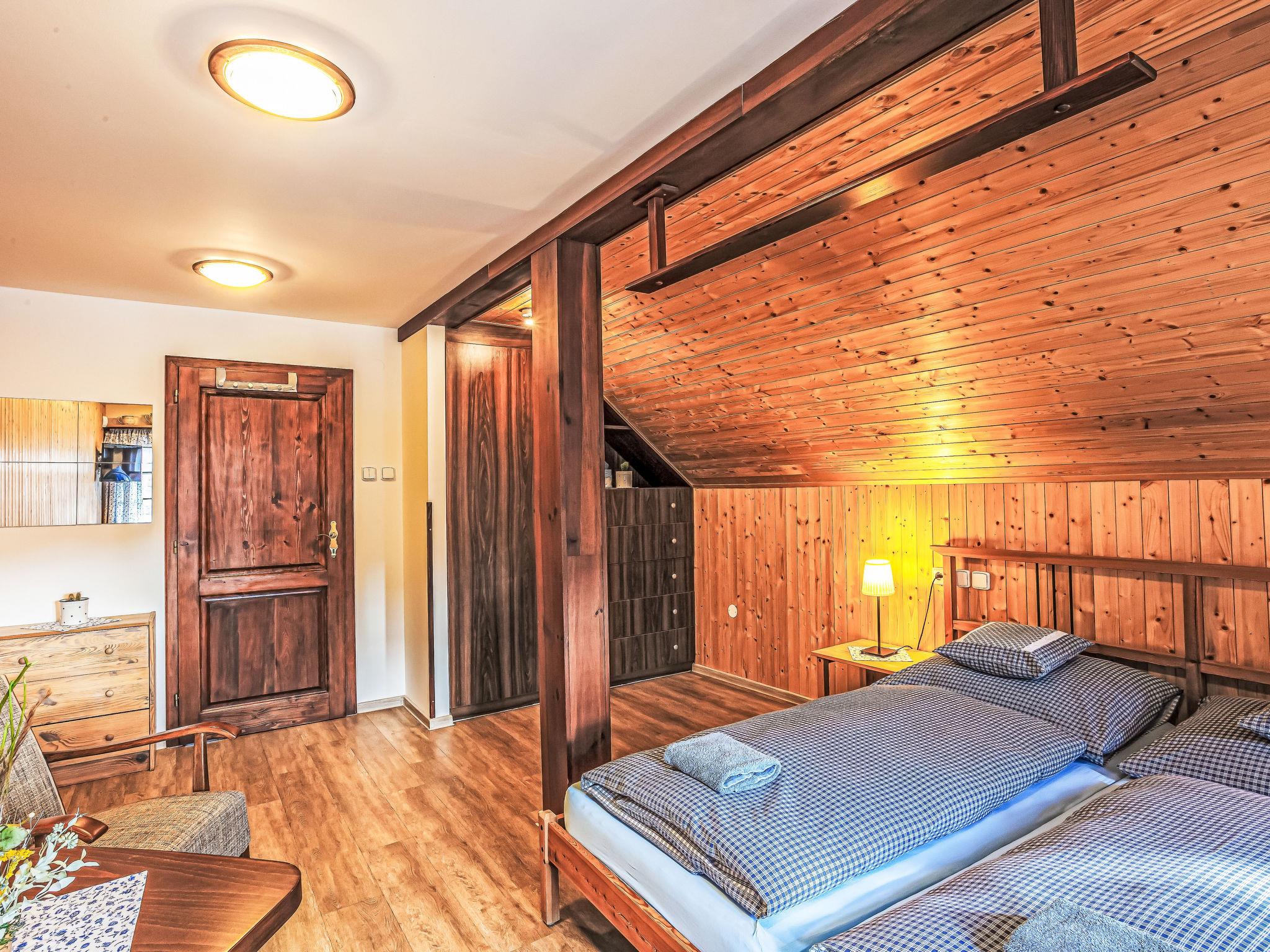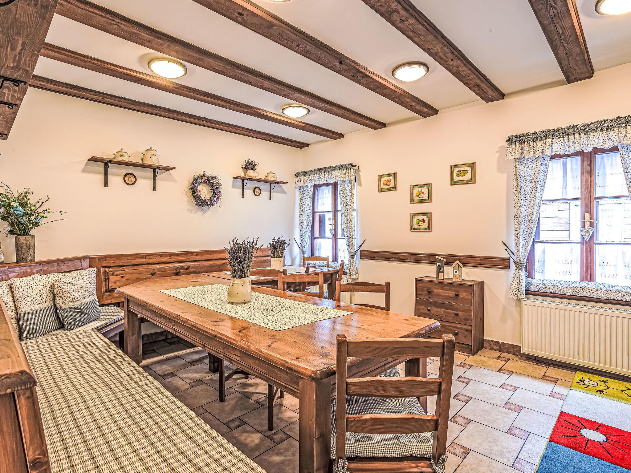 "Maršovka", 8-room house on 3 levels. Very stylish and cosy furnishings: large lounge. Kitchen (oven, dishwasher, 4 ceramic glass hob hotplates, kettle, microwave, electric coffee machine) with dining table. Bathroom, sep. WC. Electric heating. Upper floor: (steep stair), 1 room with sloping ceilings with 1 double bed. 1 room with sloping ceilings with 1 double bed. 1 room with sloping ceilings with 1 bed and 1 double bed. 1 room with sloping ceilings with 1 double sofabed (length 170 cm), 1 double bed. Shower/WC. 2nd upper floor: (steep stair), 1 room with sloping ceilings with 2 beds. 1 room with sloping ceilings with 2 beds and 1 sofabed. Wooden floors. Facilities: Internet (WiFi, free). Please note: suitable for families. Non-smoking house. 1 small pet/ dog allowed. Smoke alarm, fire extinguisher, no lift.