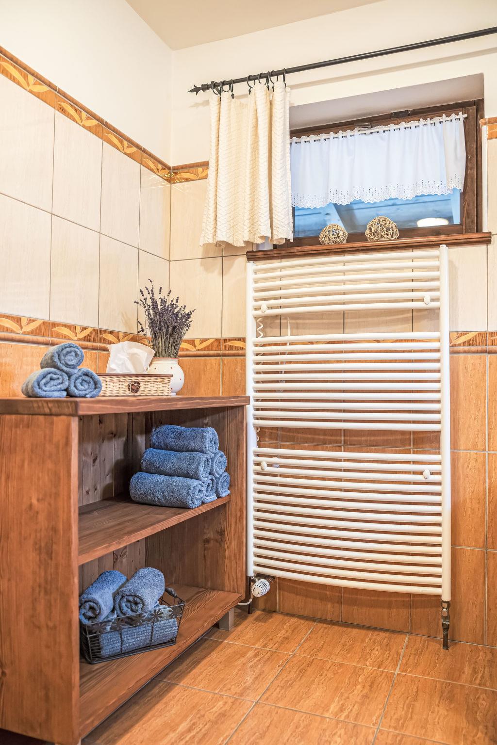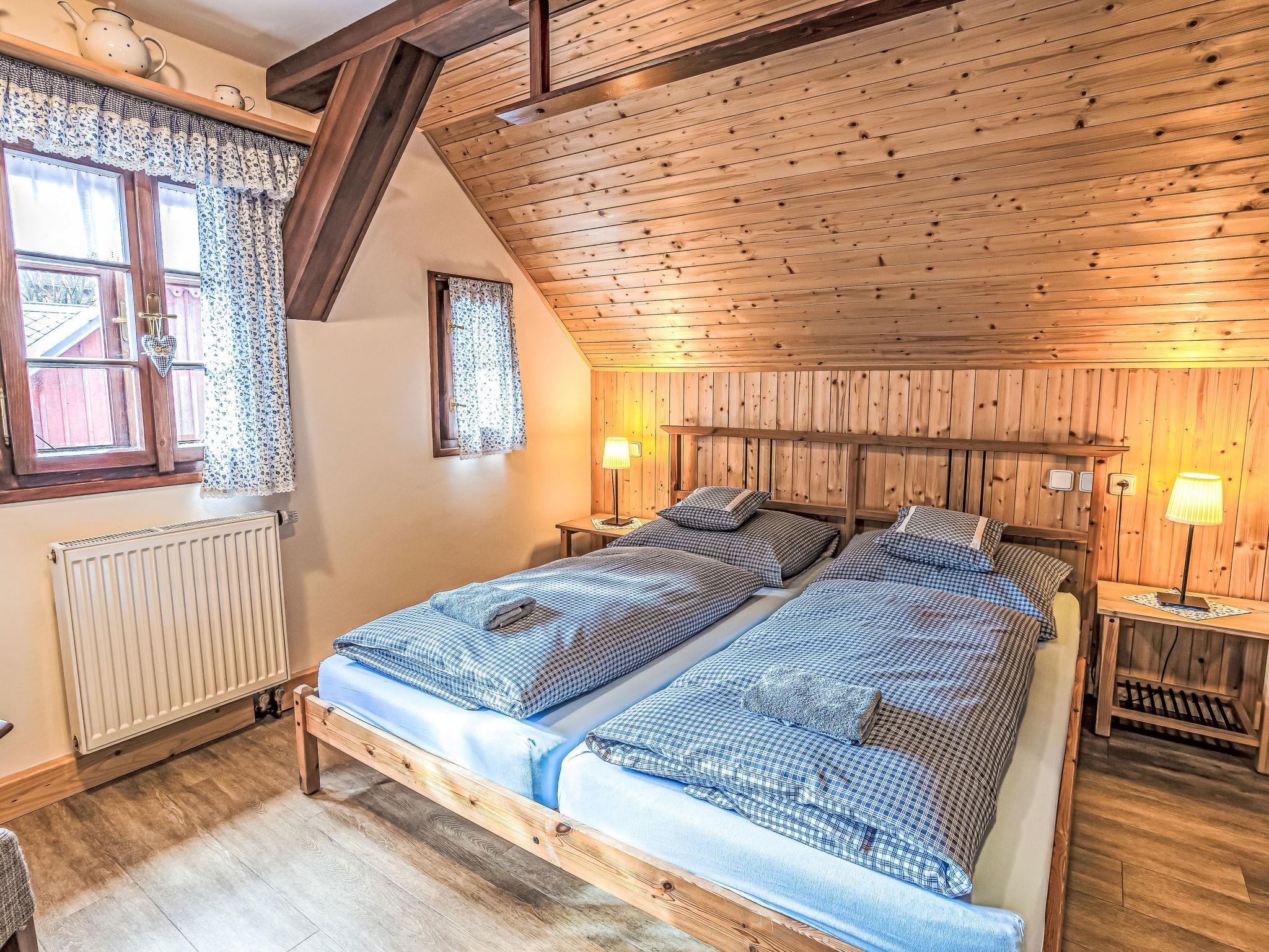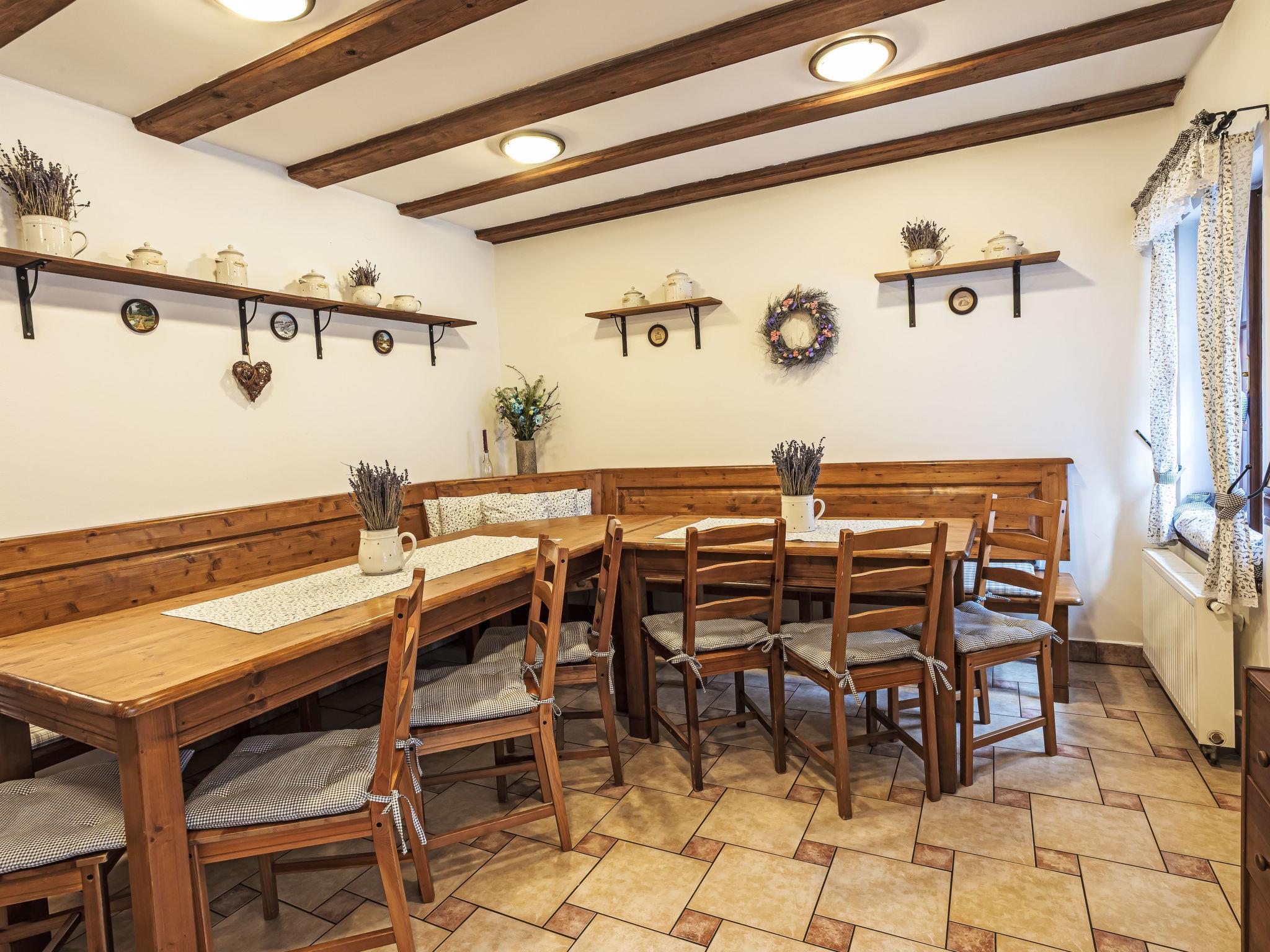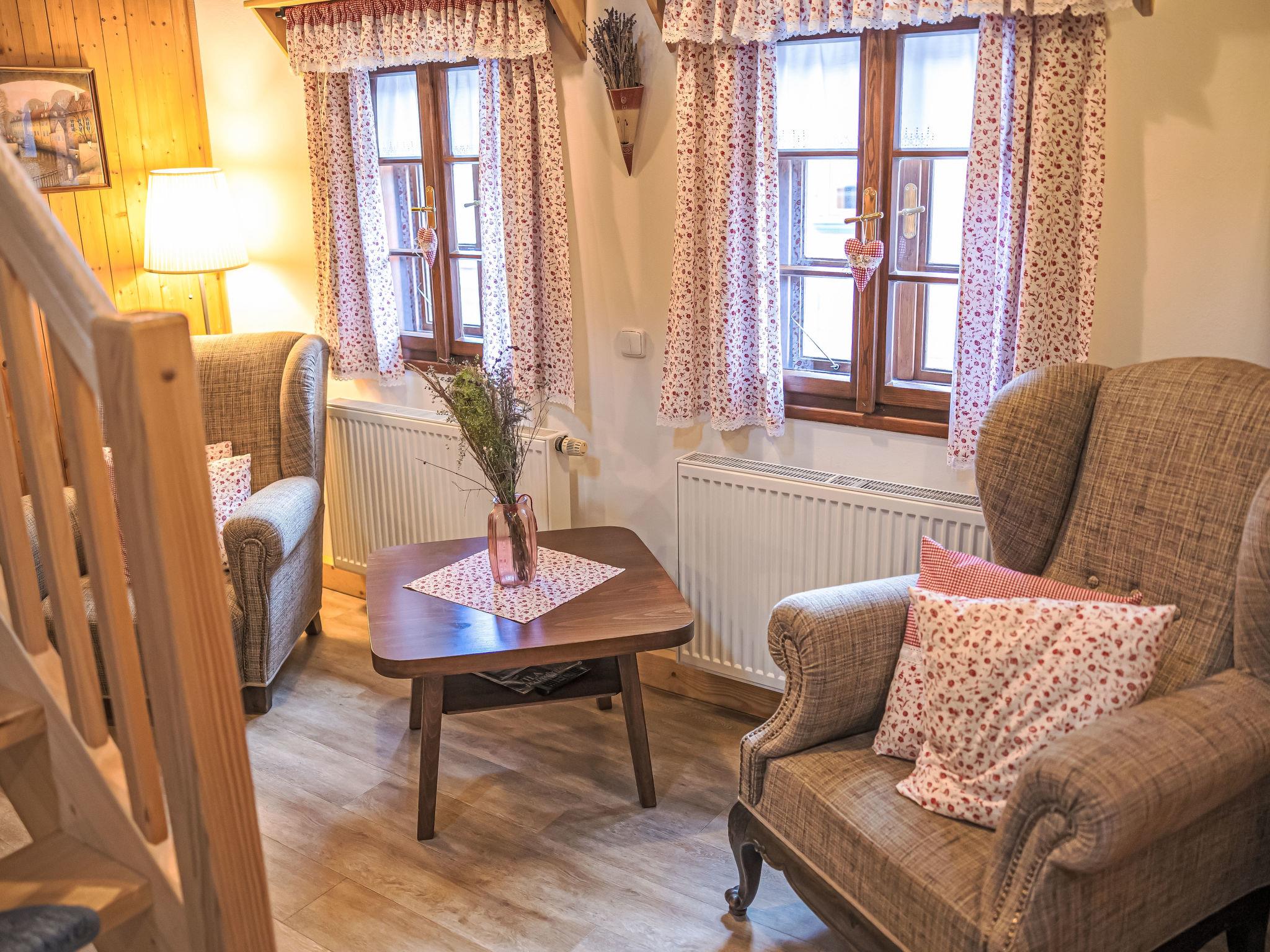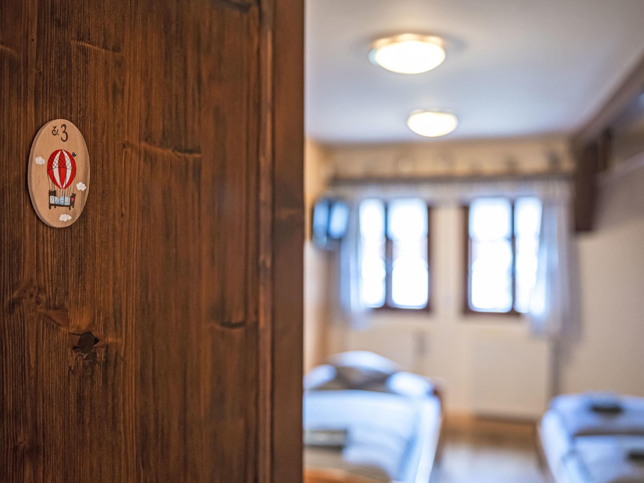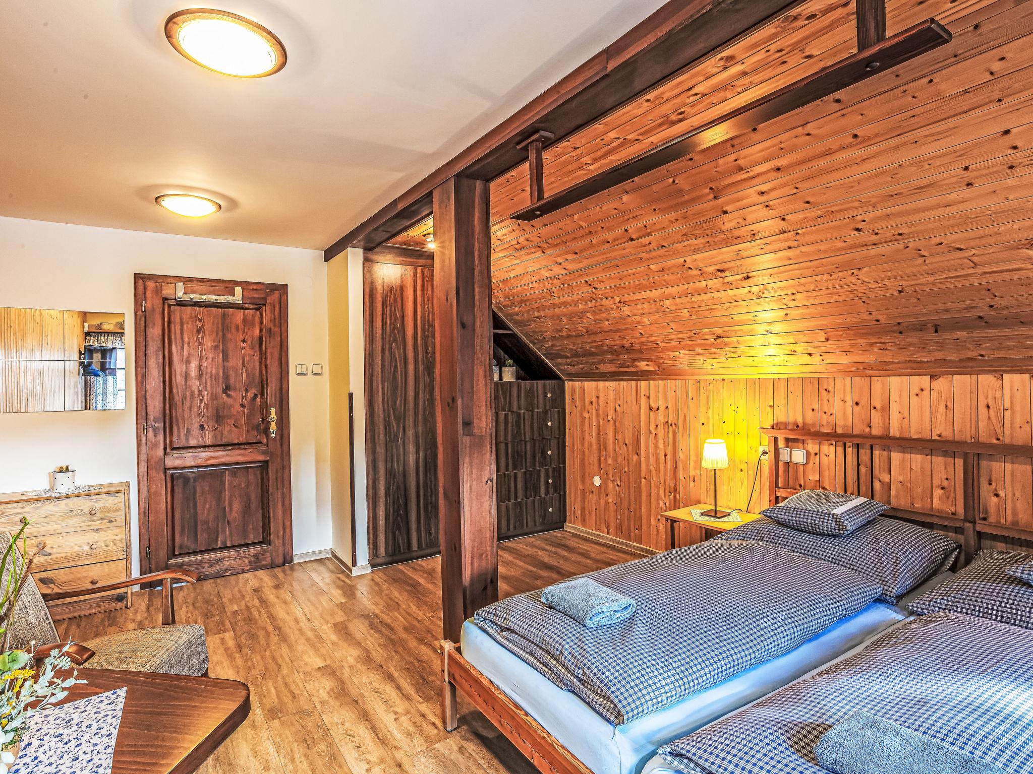 "Maršovka", 8-room house on 3 levels. Very stylish and cosy furnishings: large lounge. Kitchen (oven, dishwasher, 4 ceramic glass hob hotplates, kettle, microwave, electric coffee machine) with dining table. Bathroom, sep. WC. Electric heating. Upper floor: (steep stair), 1 room with sloping ceilings with 1 double bed. 1 room with sloping ceilings with 1 double bed. 1 room with sloping ceilings with 1 bed and 1 double bed. 1 room with sloping ceilings with 1 double sofabed (length 170 cm), 1 double bed. Shower/WC. 2nd upper floor: (steep stair), 1 room with sloping ceilings with 2 beds. 1 room with sloping ceilings with 2 beds and 1 sofabed. Wooden floors. Facilities: Internet (WiFi, free). Please note: suitable for families. Non-smoking house. 1 small pet/ dog allowed. Smoke alarm, fire extinguisher, no lift.