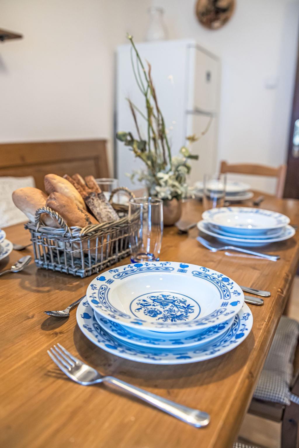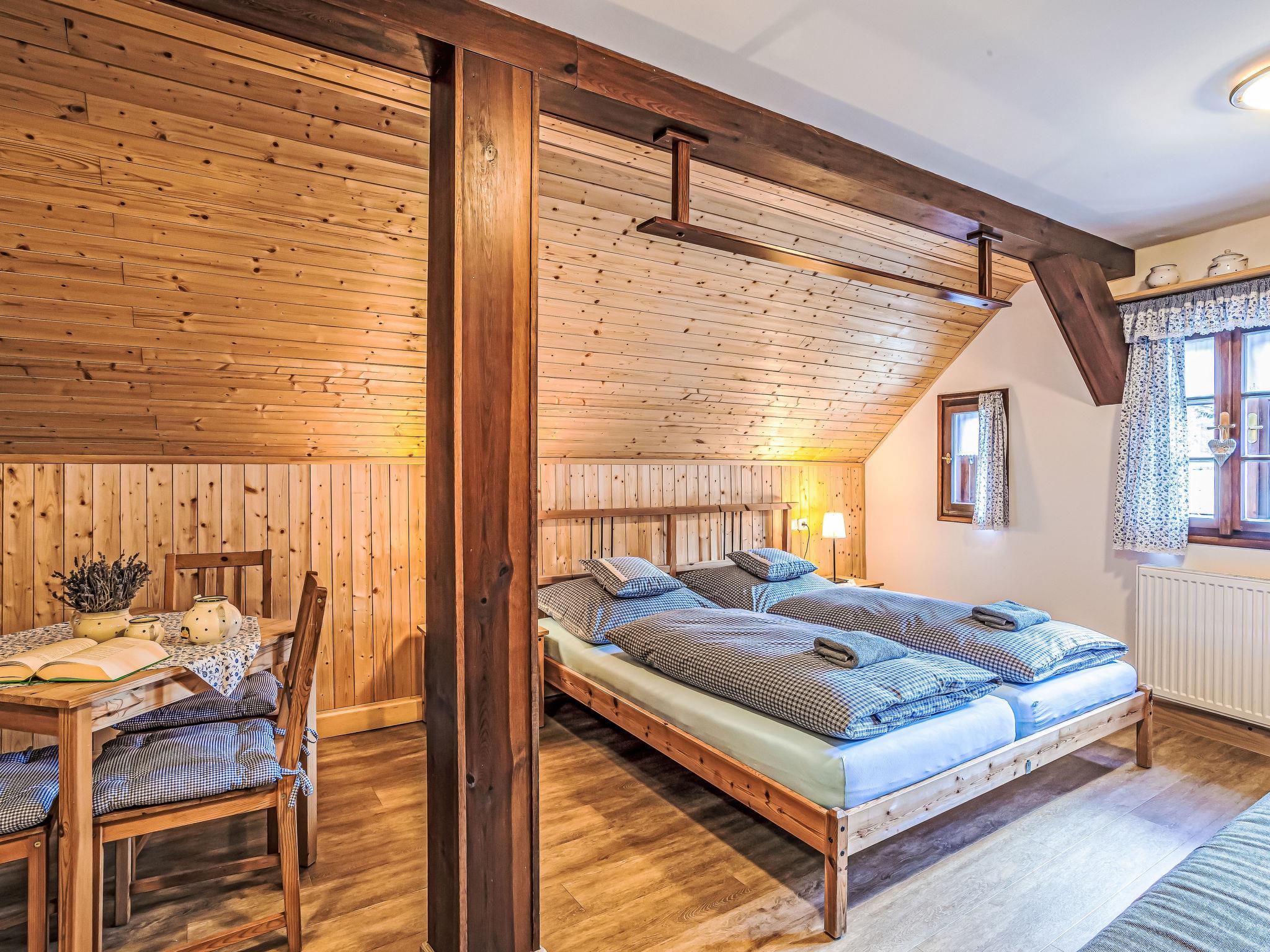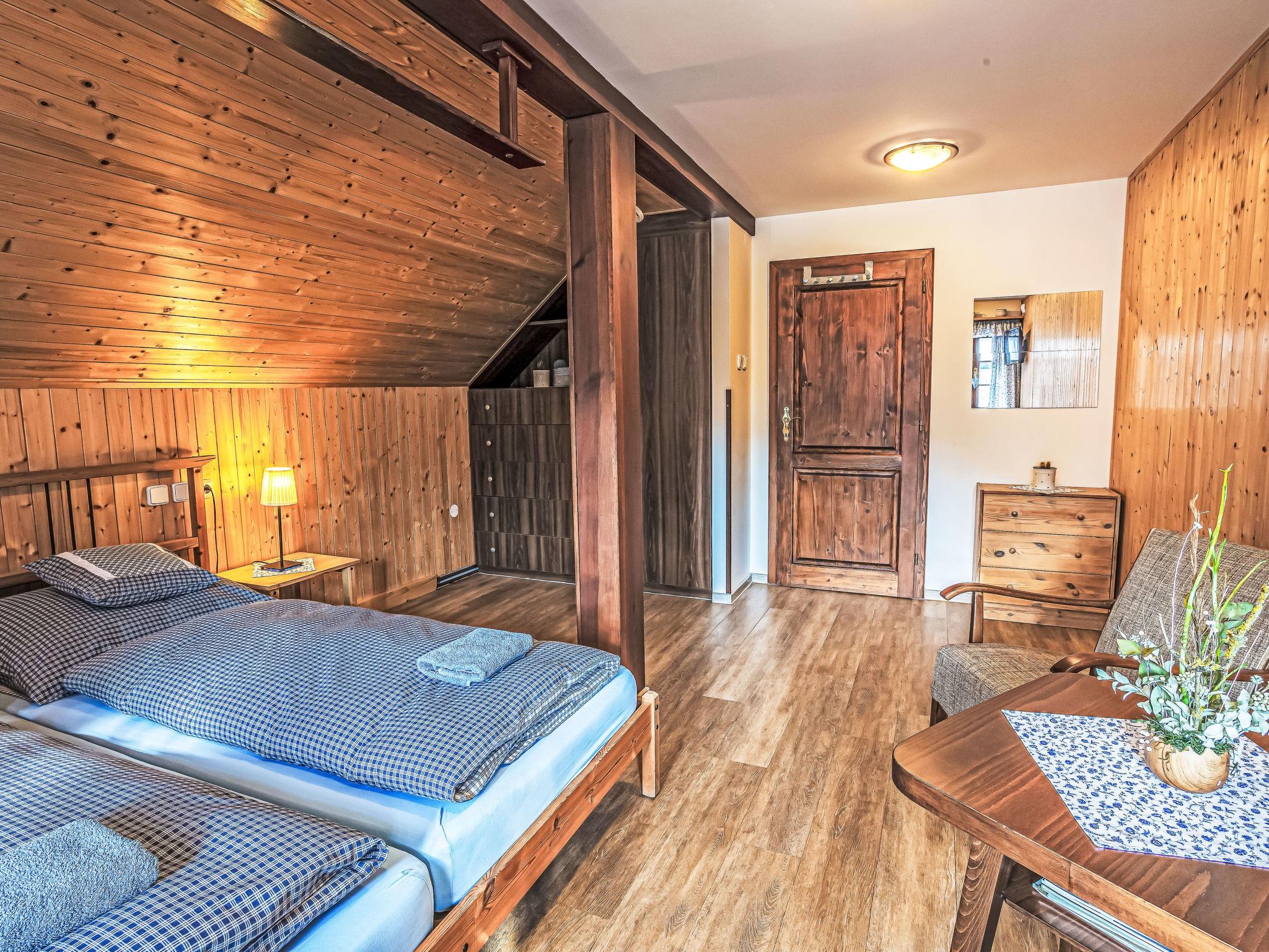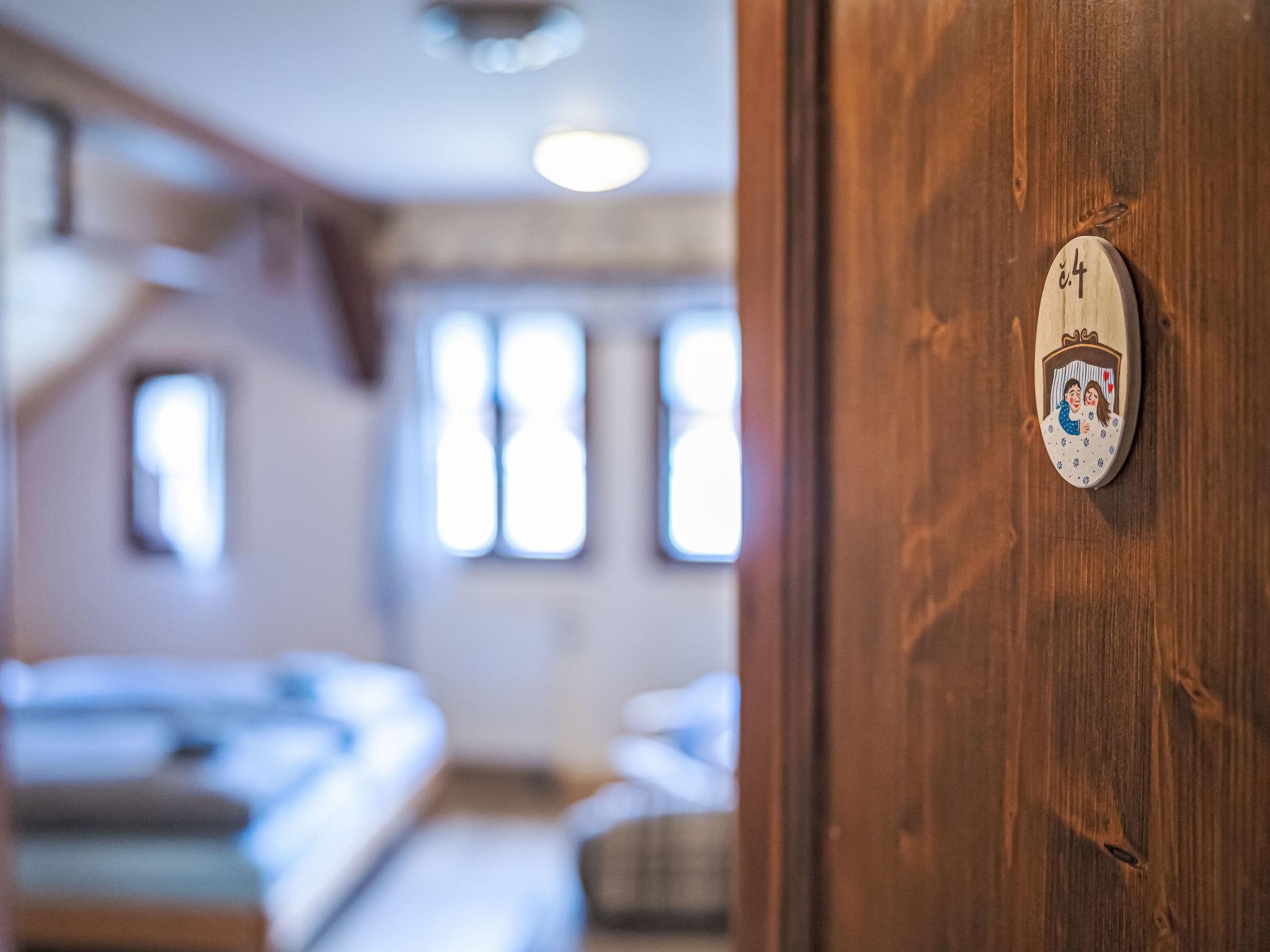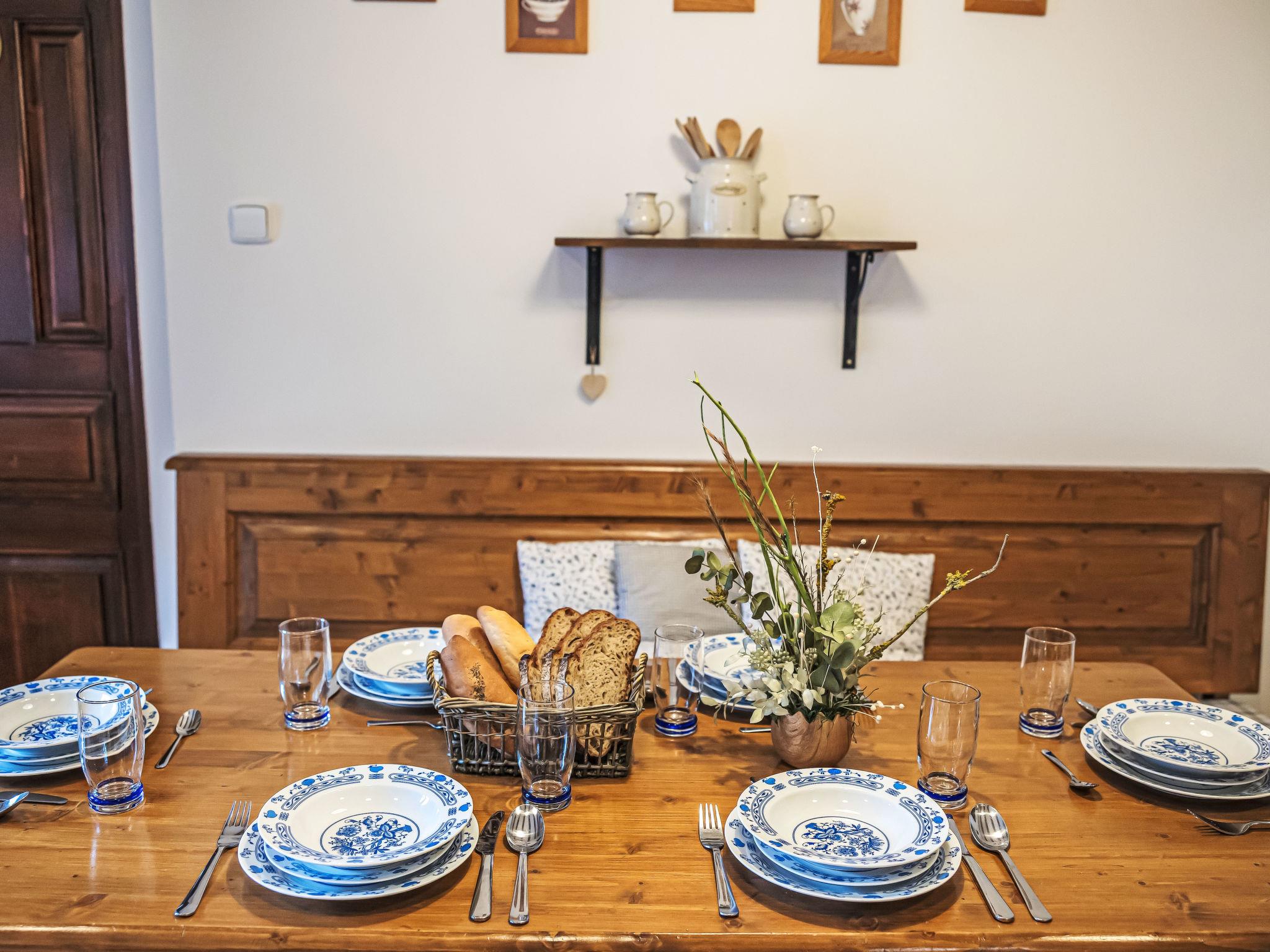 "Maršovka", 8-room house on 3 levels. Very stylish and cosy furnishings: large lounge. Kitchen (oven, dishwasher, 4 ceramic glass hob hotplates, kettle, microwave, electric coffee machine) with dining table. Bathroom, sep. WC. Electric heating. Upper floor: (steep stair), 1 room with sloping ceilings with 1 double bed. 1 room with sloping ceilings with 1 double bed. 1 room with sloping ceilings with 1 bed and 1 double bed. 1 room with sloping ceilings with 1 double sofabed (length 170 cm), 1 double bed. Shower/WC. 2nd upper floor: (steep stair), 1 room with sloping ceilings with 2 beds. 1 room with sloping ceilings with 2 beds and 1 sofabed. Wooden floors. Facilities: Internet (WiFi, free). Please note: suitable for families. Non-smoking house. 1 small pet/ dog allowed. Smoke alarm, fire extinguisher, no lift.