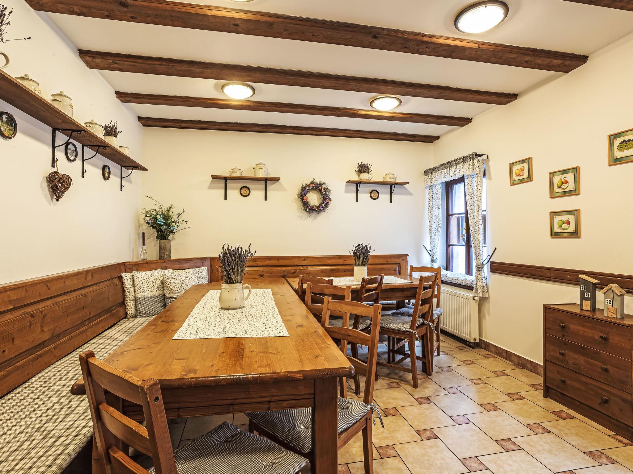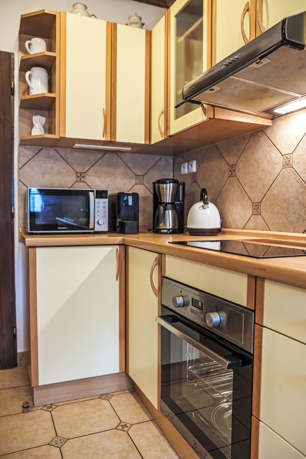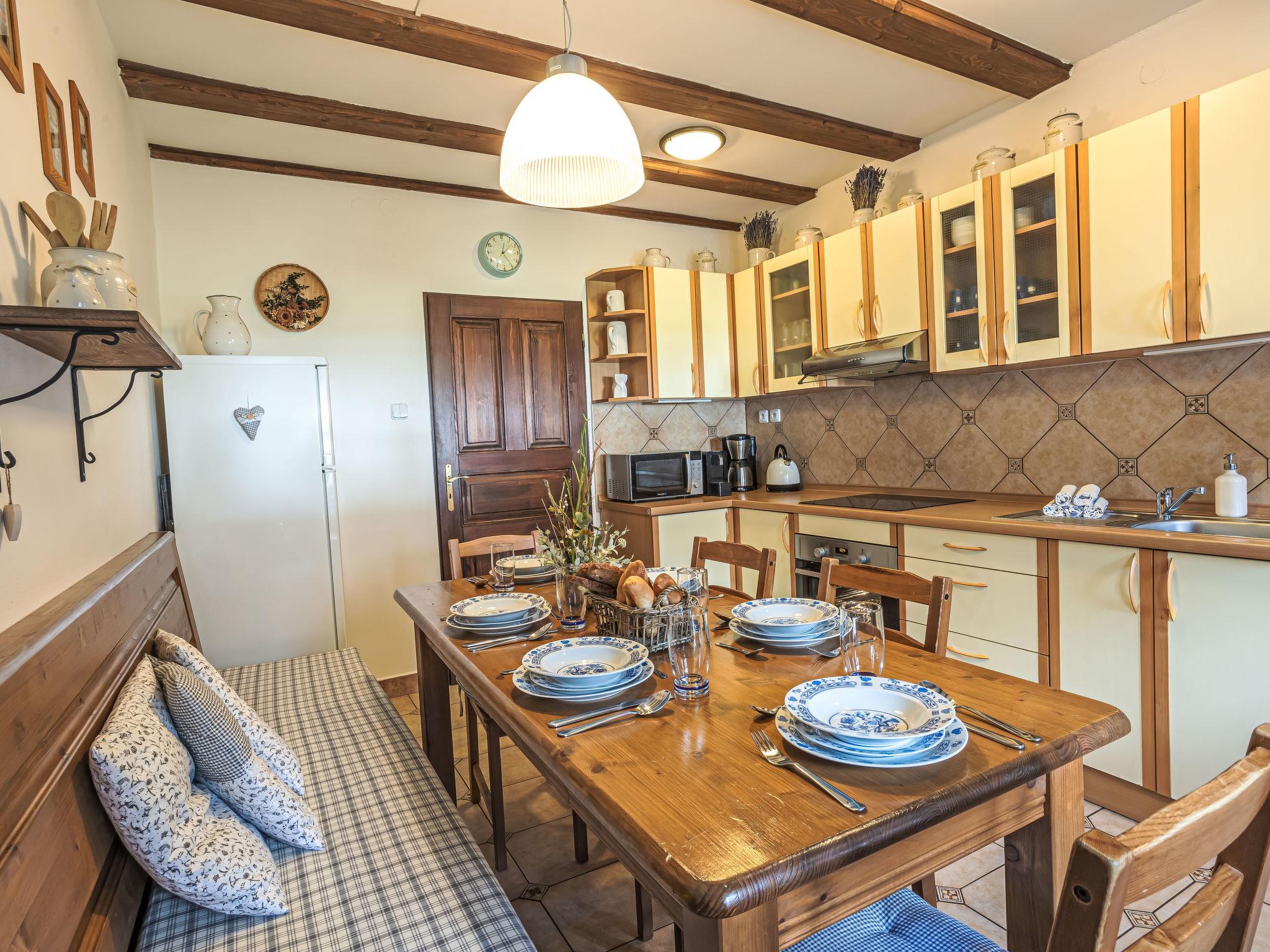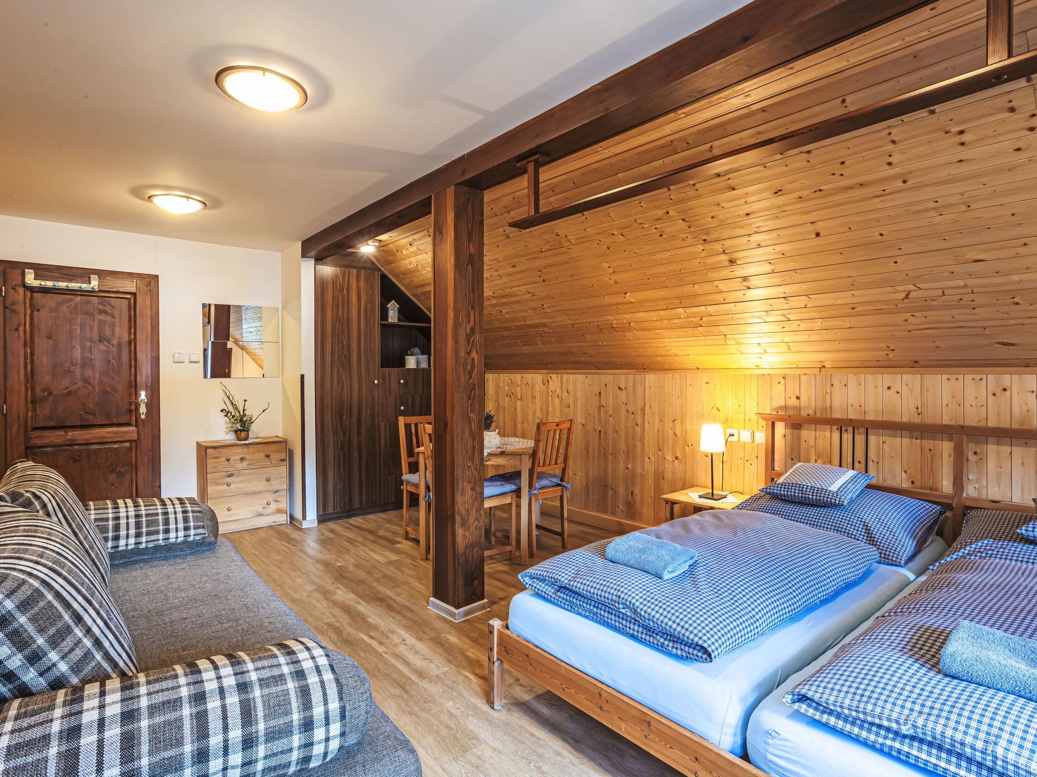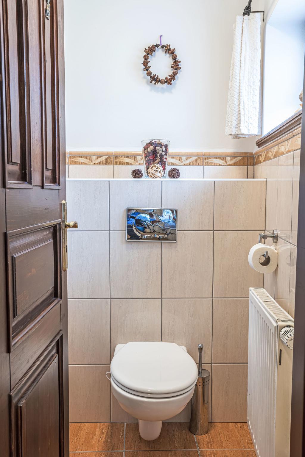 "Maršovka", 8-room house on 3 levels. Very stylish and cosy furnishings: large lounge. Kitchen (oven, dishwasher, 4 ceramic glass hob hotplates, kettle, microwave, electric coffee machine) with dining table. Bathroom, sep. WC. Electric heating. Upper floor: (steep stair), 1 room with sloping ceilings with 1 double bed. 1 room with sloping ceilings with 1 double bed. 1 room with sloping ceilings with 1 bed and 1 double bed. 1 room with sloping ceilings with 1 double sofabed (length 170 cm), 1 double bed. Shower/WC. 2nd upper floor: (steep stair), 1 room with sloping ceilings with 2 beds. 1 room with sloping ceilings with 2 beds and 1 sofabed. Wooden floors. Facilities: Internet (WiFi, free). Please note: suitable for families. Non-smoking house. 1 small pet/ dog allowed. Smoke alarm, fire extinguisher, no lift.