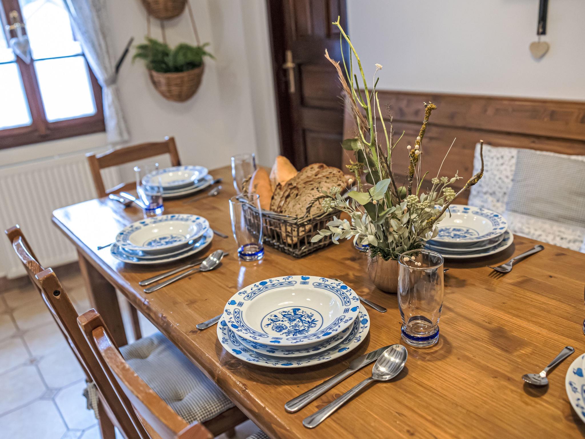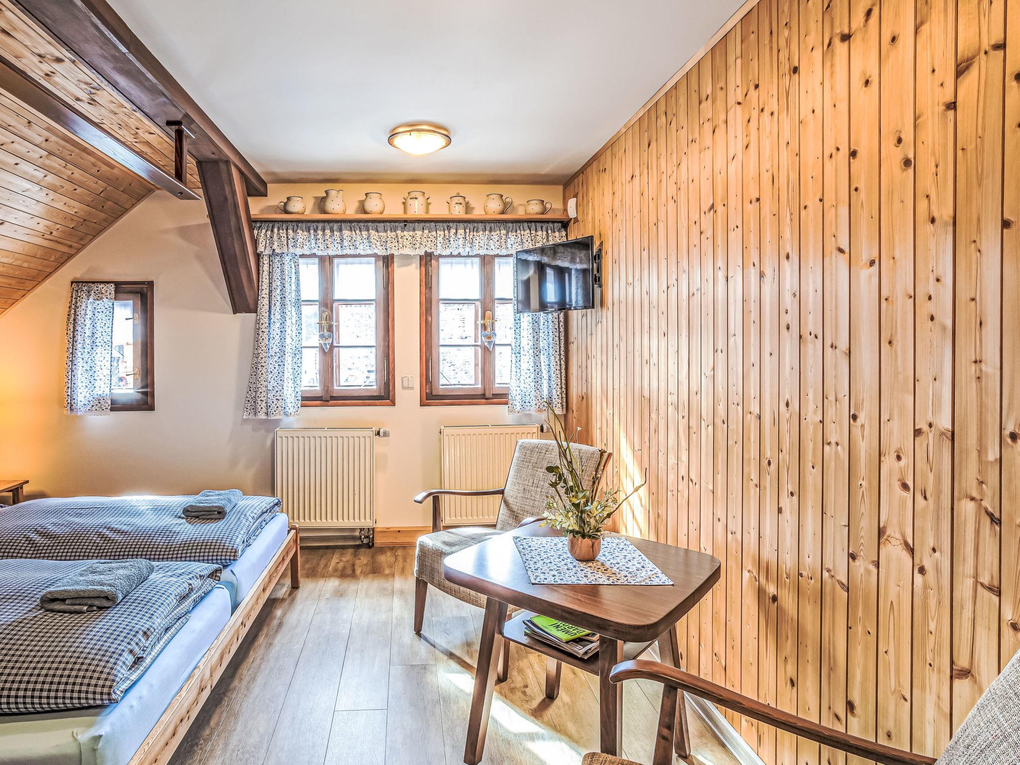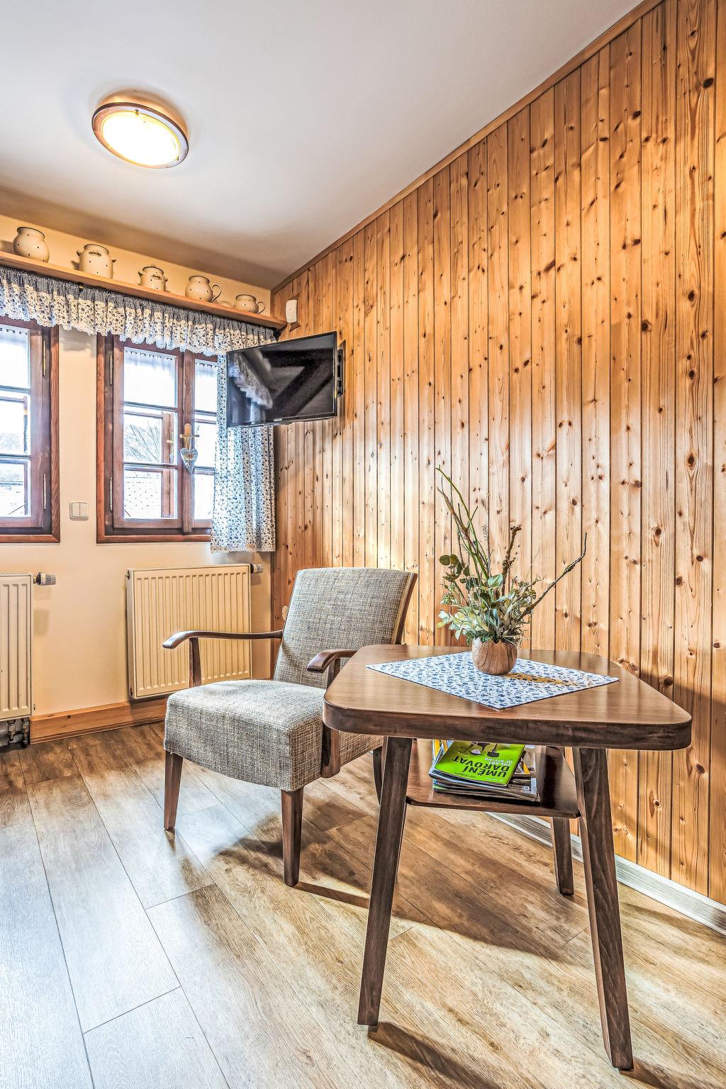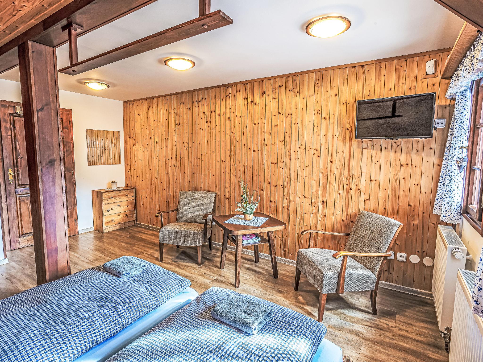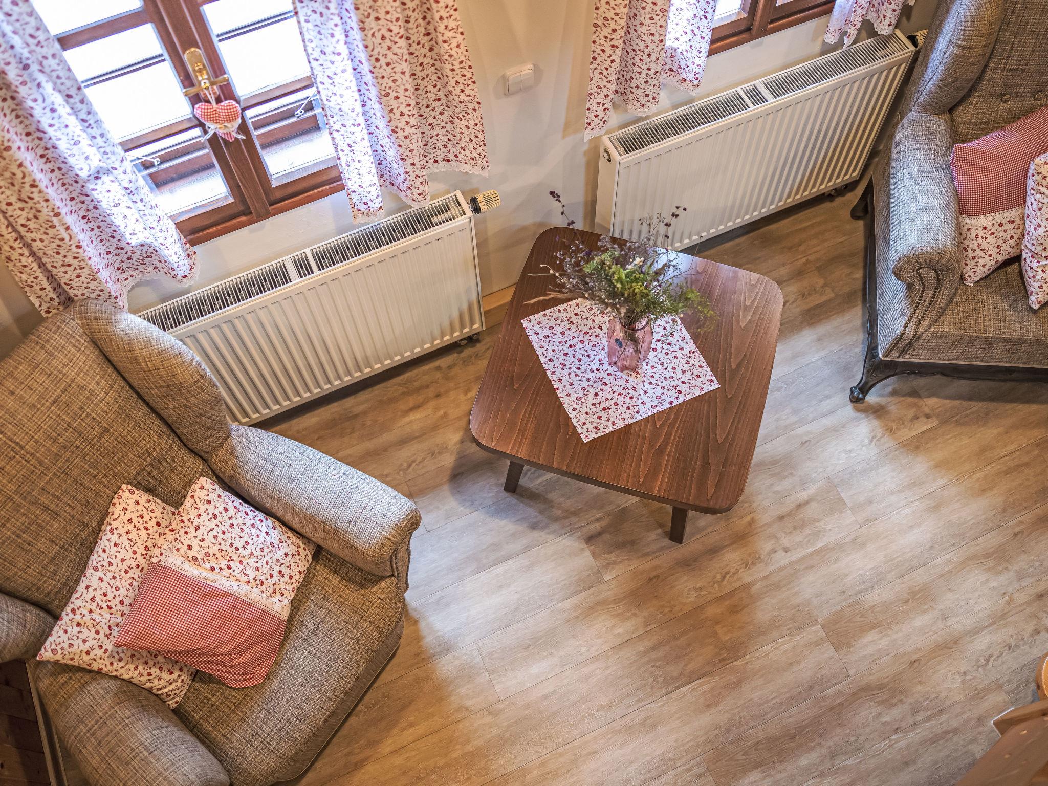 "Maršovka", 8-room house on 3 levels. Very stylish and cosy furnishings: large lounge. Kitchen (oven, dishwasher, 4 ceramic glass hob hotplates, kettle, microwave, electric coffee machine) with dining table. Bathroom, sep. WC. Electric heating. Upper floor: (steep stair), 1 room with sloping ceilings with 1 double bed. 1 room with sloping ceilings with 1 double bed. 1 room with sloping ceilings with 1 bed and 1 double bed. 1 room with sloping ceilings with 1 double sofabed (length 170 cm), 1 double bed. Shower/WC. 2nd upper floor: (steep stair), 1 room with sloping ceilings with 2 beds. 1 room with sloping ceilings with 2 beds and 1 sofabed. Wooden floors. Facilities: Internet (WiFi, free). Please note: suitable for families. Non-smoking house. 1 small pet/ dog allowed. Smoke alarm, fire extinguisher, no lift.