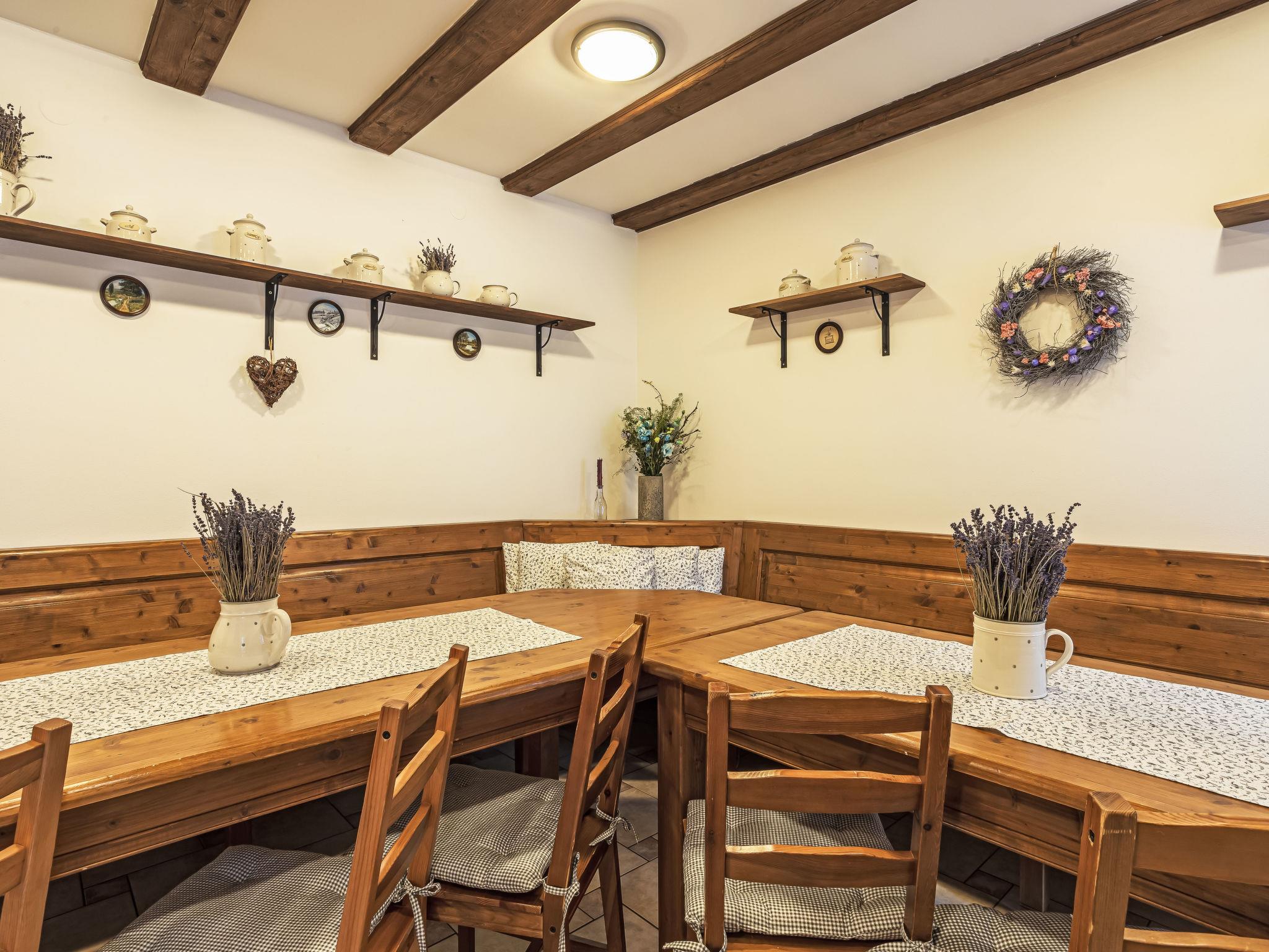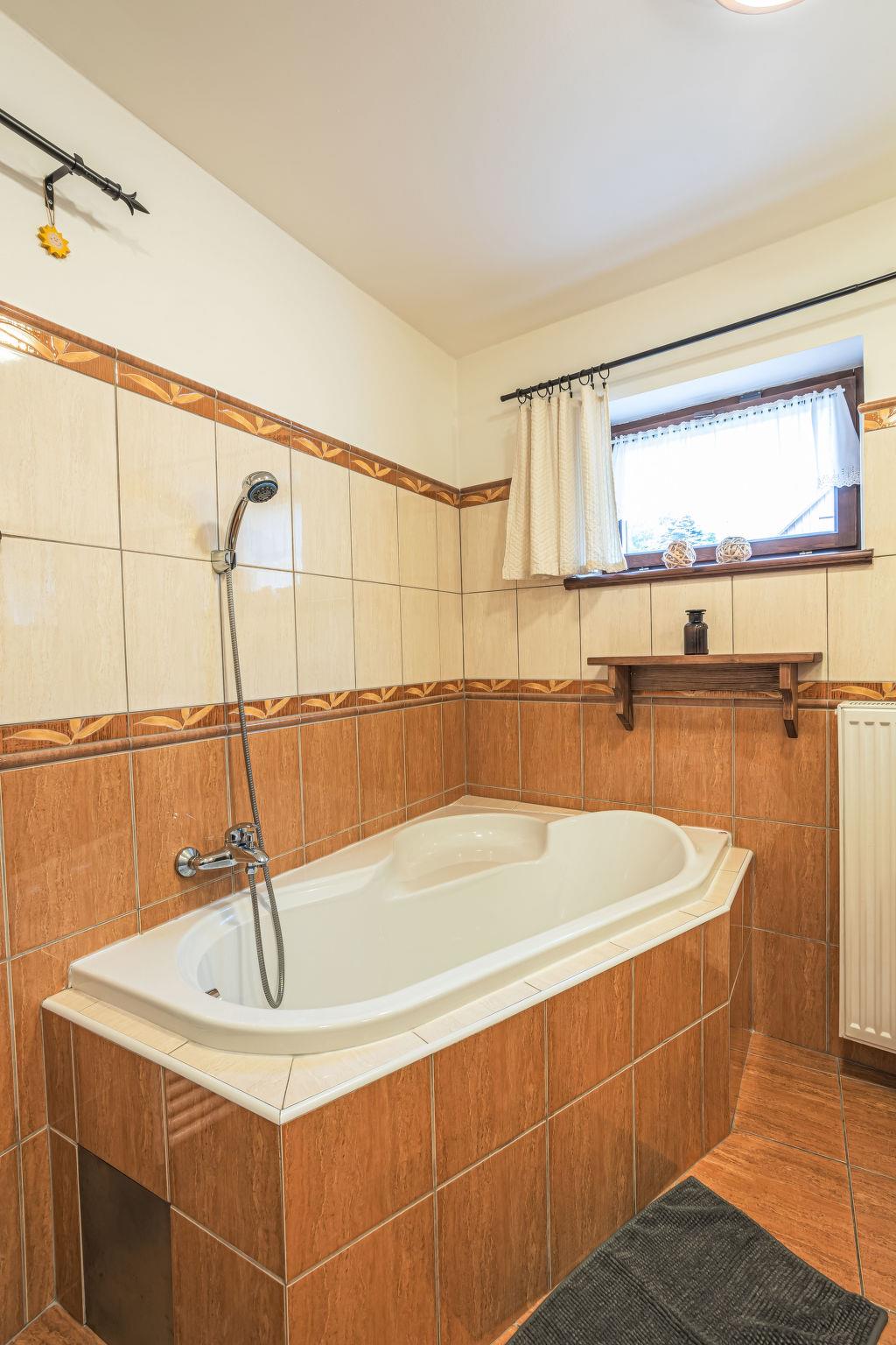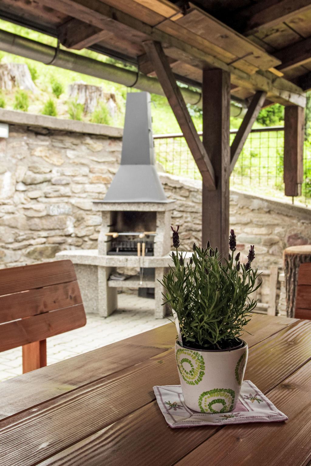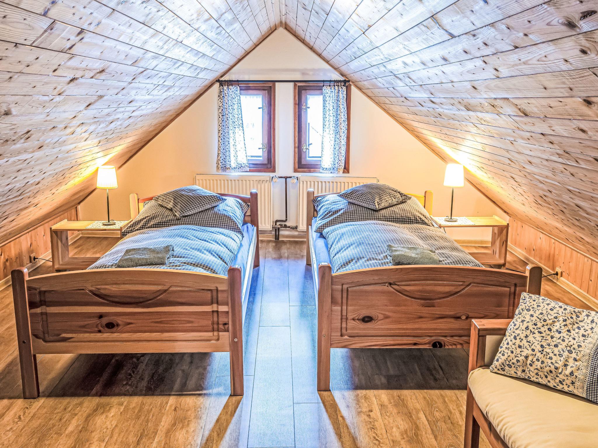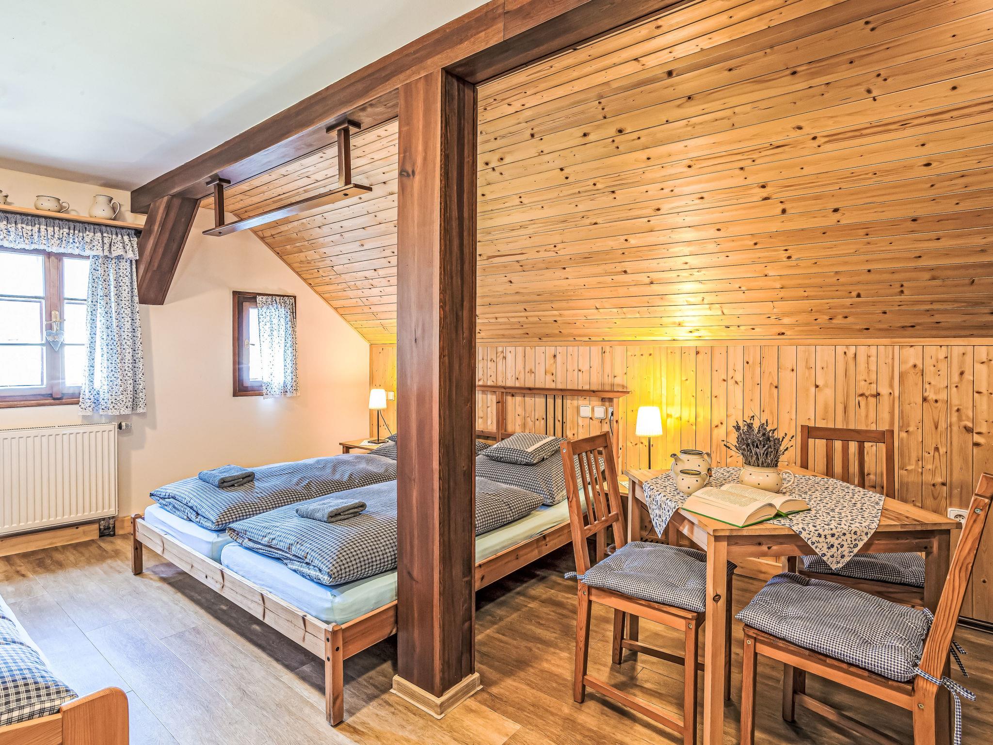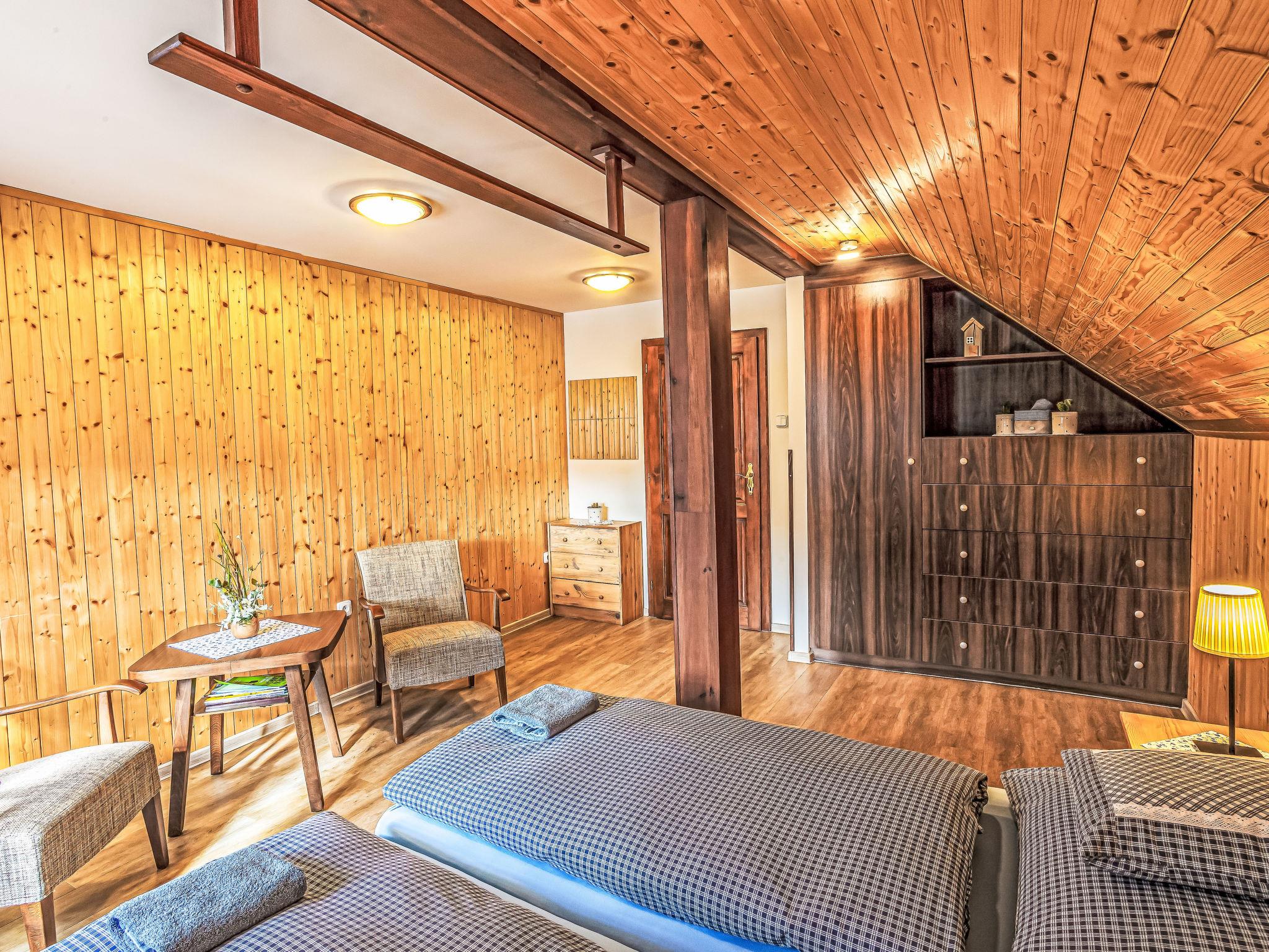 "Maršovka", 8-room house on 3 levels. Very stylish and cosy furnishings: large lounge. Kitchen (oven, dishwasher, 4 ceramic glass hob hotplates, kettle, microwave, electric coffee machine) with dining table. Bathroom, sep. WC. Electric heating. Upper floor: (steep stair), 1 room with sloping ceilings with 1 double bed. 1 room with sloping ceilings with 1 double bed. 1 room with sloping ceilings with 1 bed and 1 double bed. 1 room with sloping ceilings with 1 double sofabed (length 170 cm), 1 double bed. Shower/WC. 2nd upper floor: (steep stair), 1 room with sloping ceilings with 2 beds. 1 room with sloping ceilings with 2 beds and 1 sofabed. Wooden floors. Facilities: Internet (WiFi, free). Please note: suitable for families. Non-smoking house. 1 small pet/ dog allowed. Smoke alarm, fire extinguisher, no lift.
