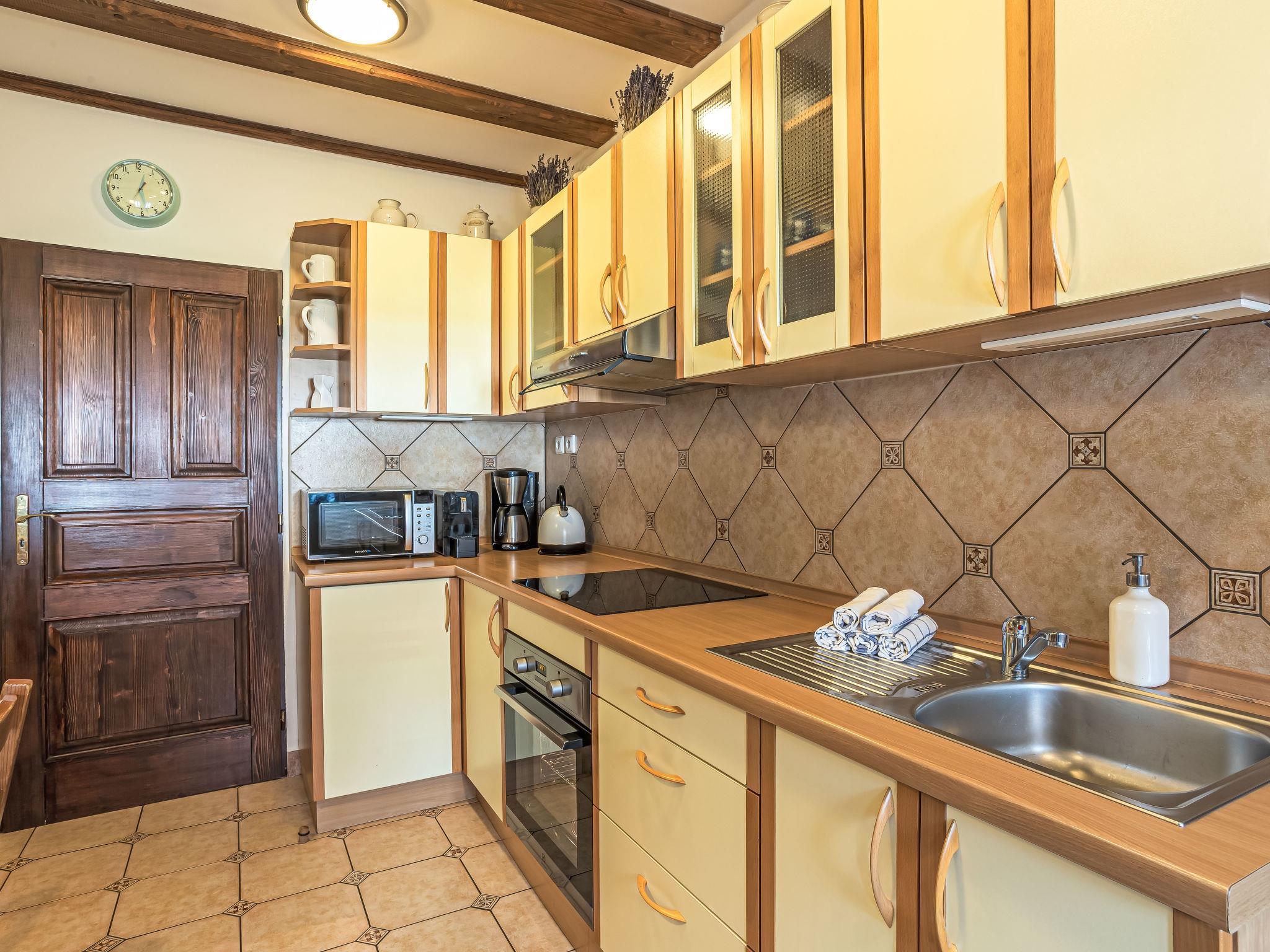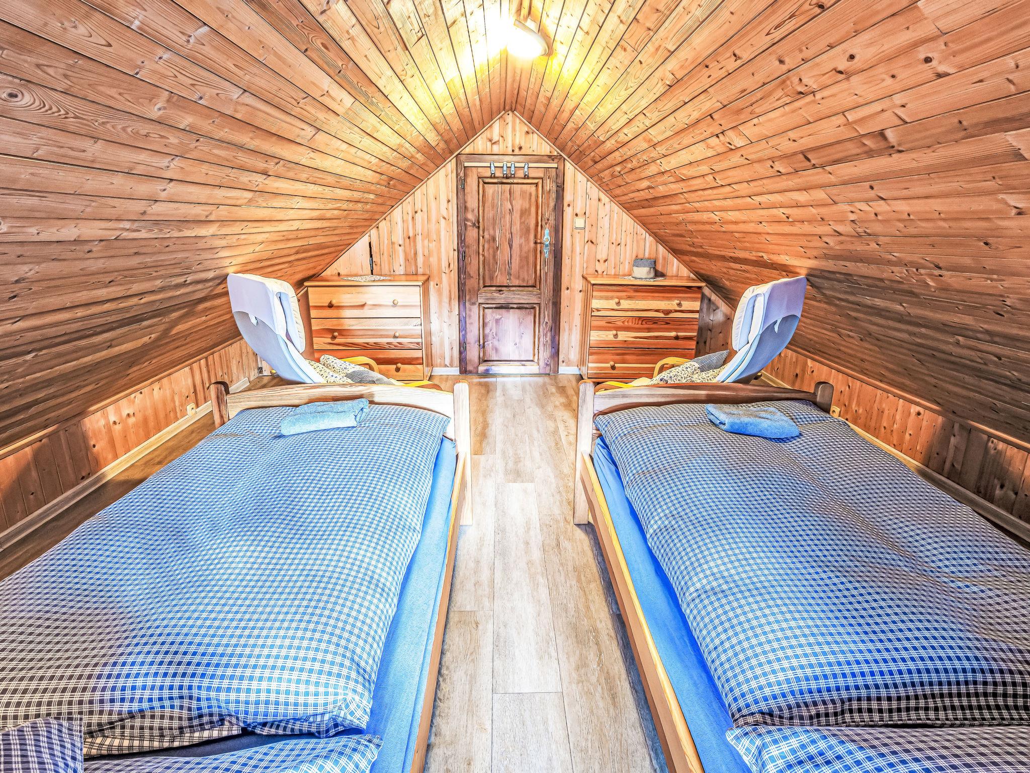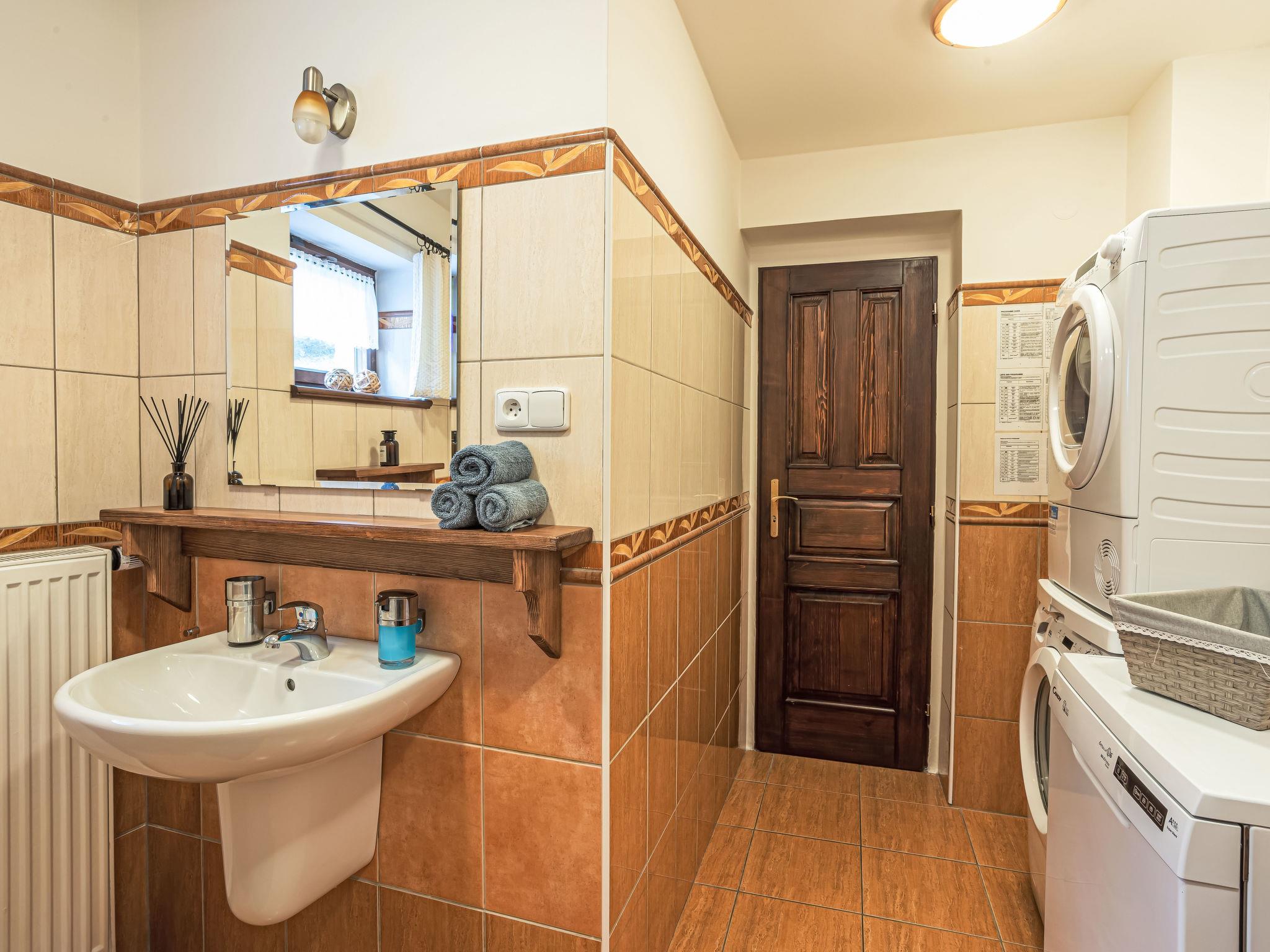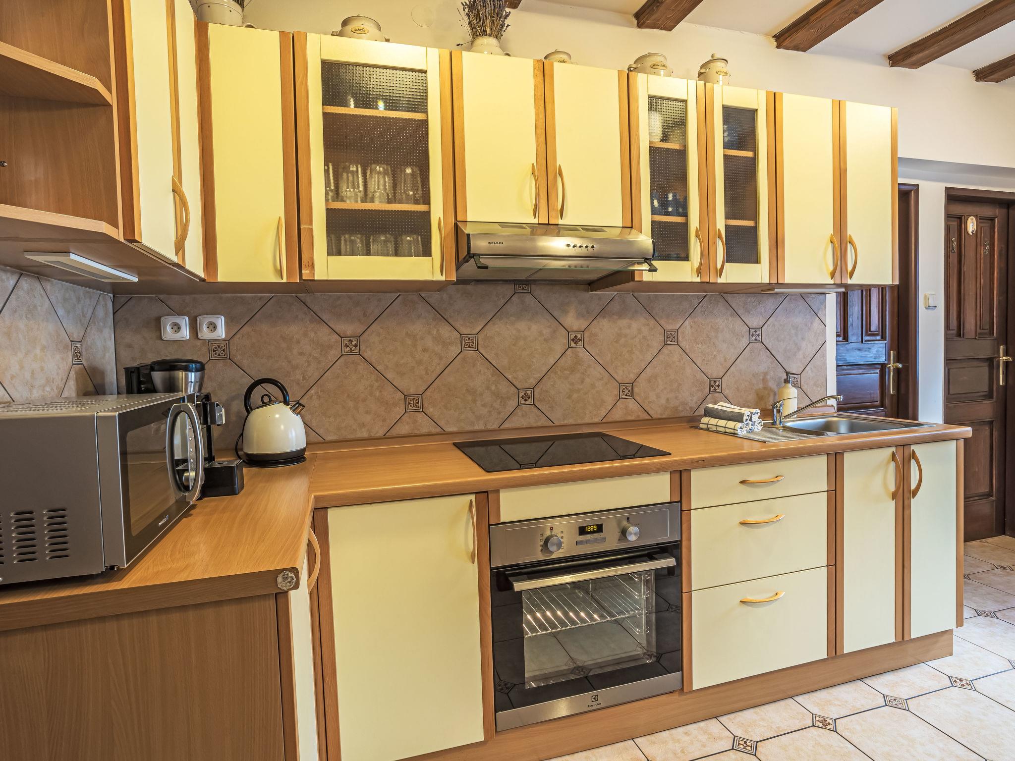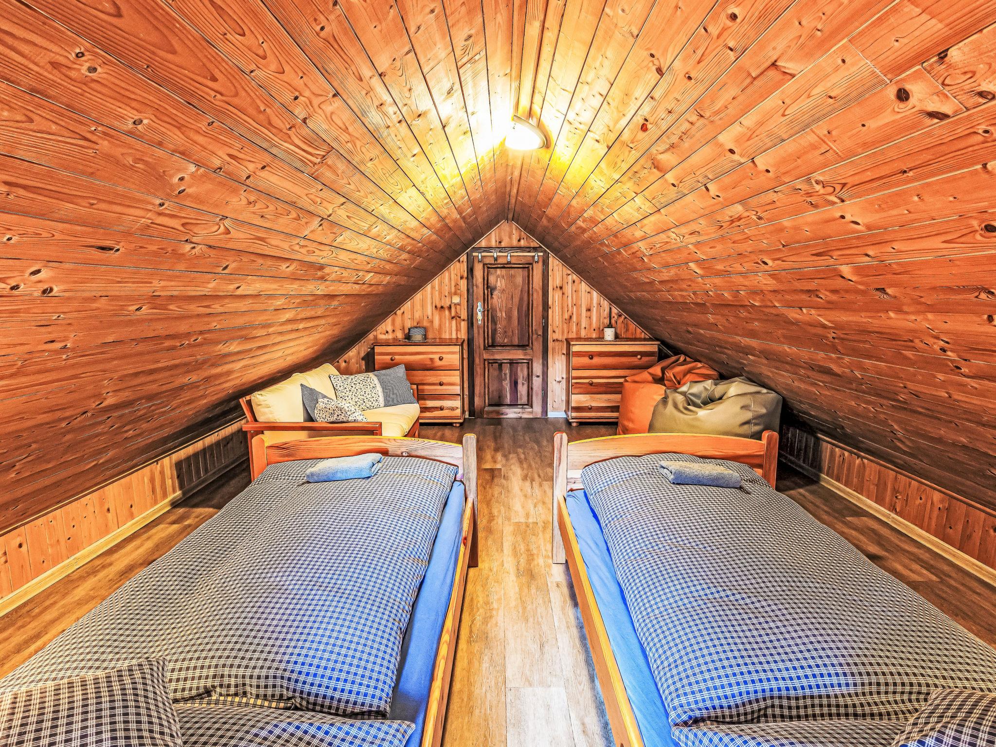 "Maršovka", 8-room house on 3 levels. Very stylish and cosy furnishings: large lounge. Kitchen (oven, dishwasher, 4 ceramic glass hob hotplates, kettle, microwave, electric coffee machine) with dining table. Bathroom, sep. WC. Electric heating. Upper floor: (steep stair), 1 room with sloping ceilings with 1 double bed. 1 room with sloping ceilings with 1 double bed. 1 room with sloping ceilings with 1 bed and 1 double bed. 1 room with sloping ceilings with 1 double sofabed (length 170 cm), 1 double bed. Shower/WC. 2nd upper floor: (steep stair), 1 room with sloping ceilings with 2 beds. 1 room with sloping ceilings with 2 beds and 1 sofabed. Wooden floors. Facilities: Internet (WiFi, free). Please note: suitable for families. Non-smoking house. 1 small pet/ dog allowed. Smoke alarm, fire extinguisher, no lift.