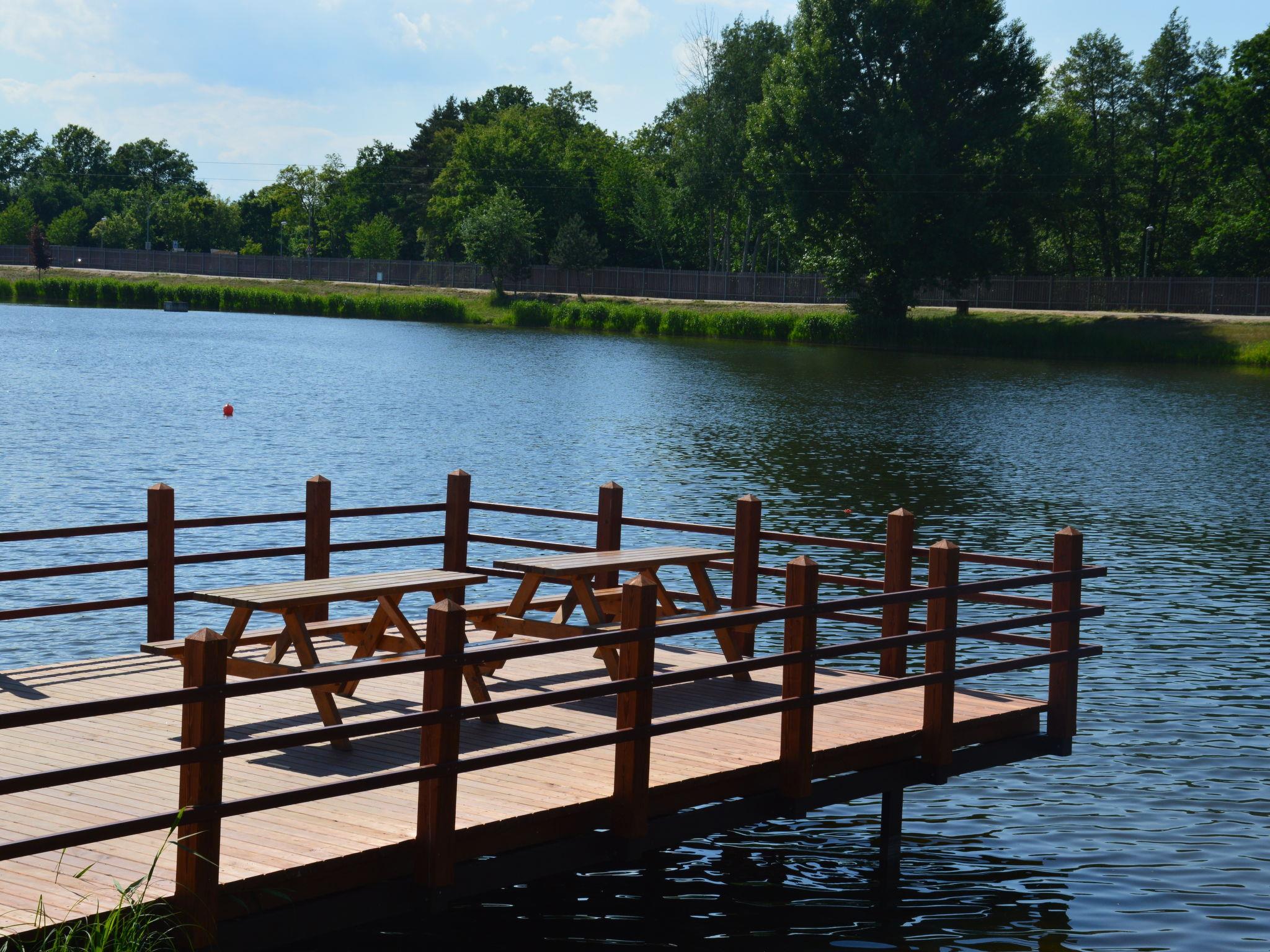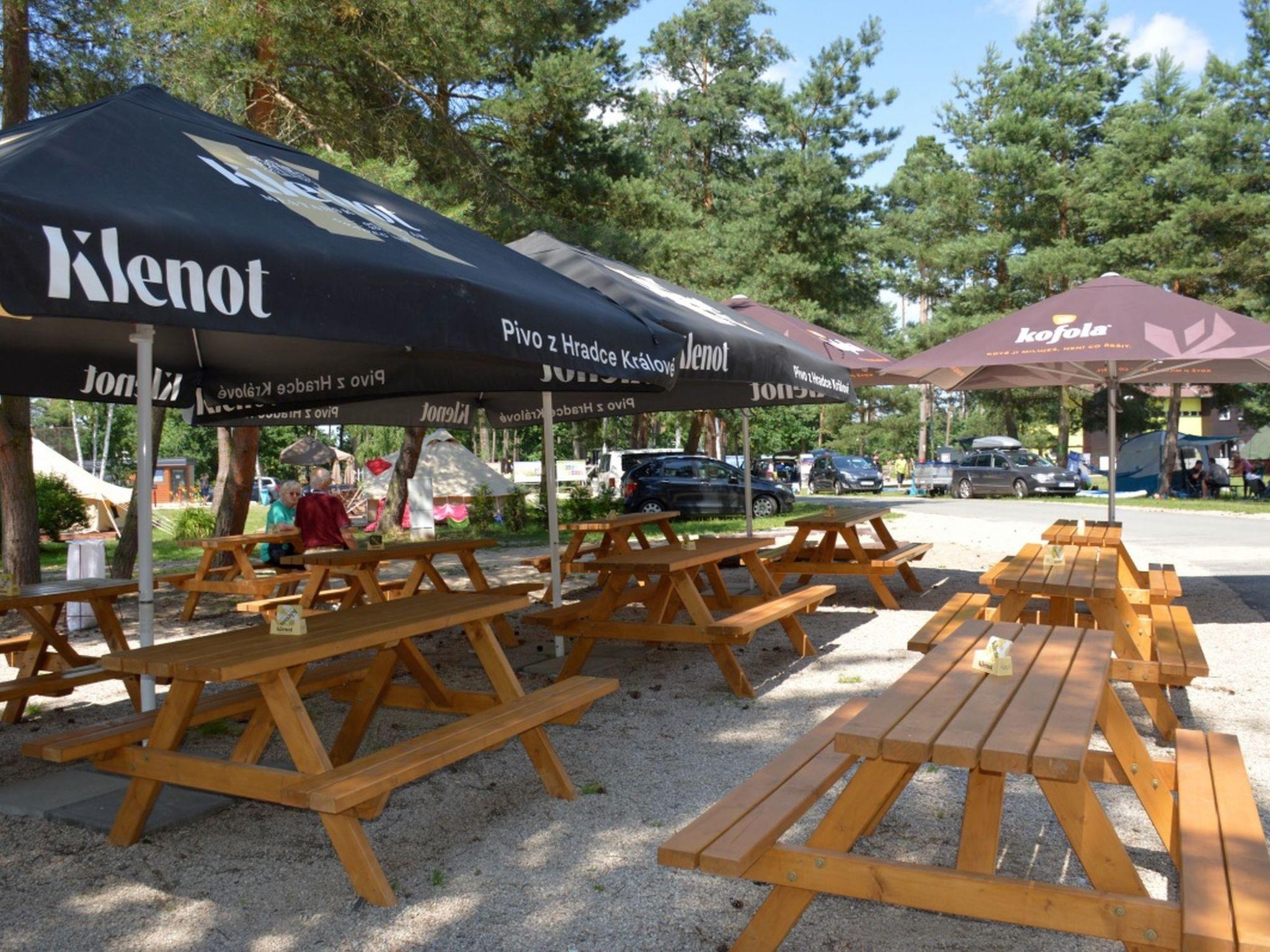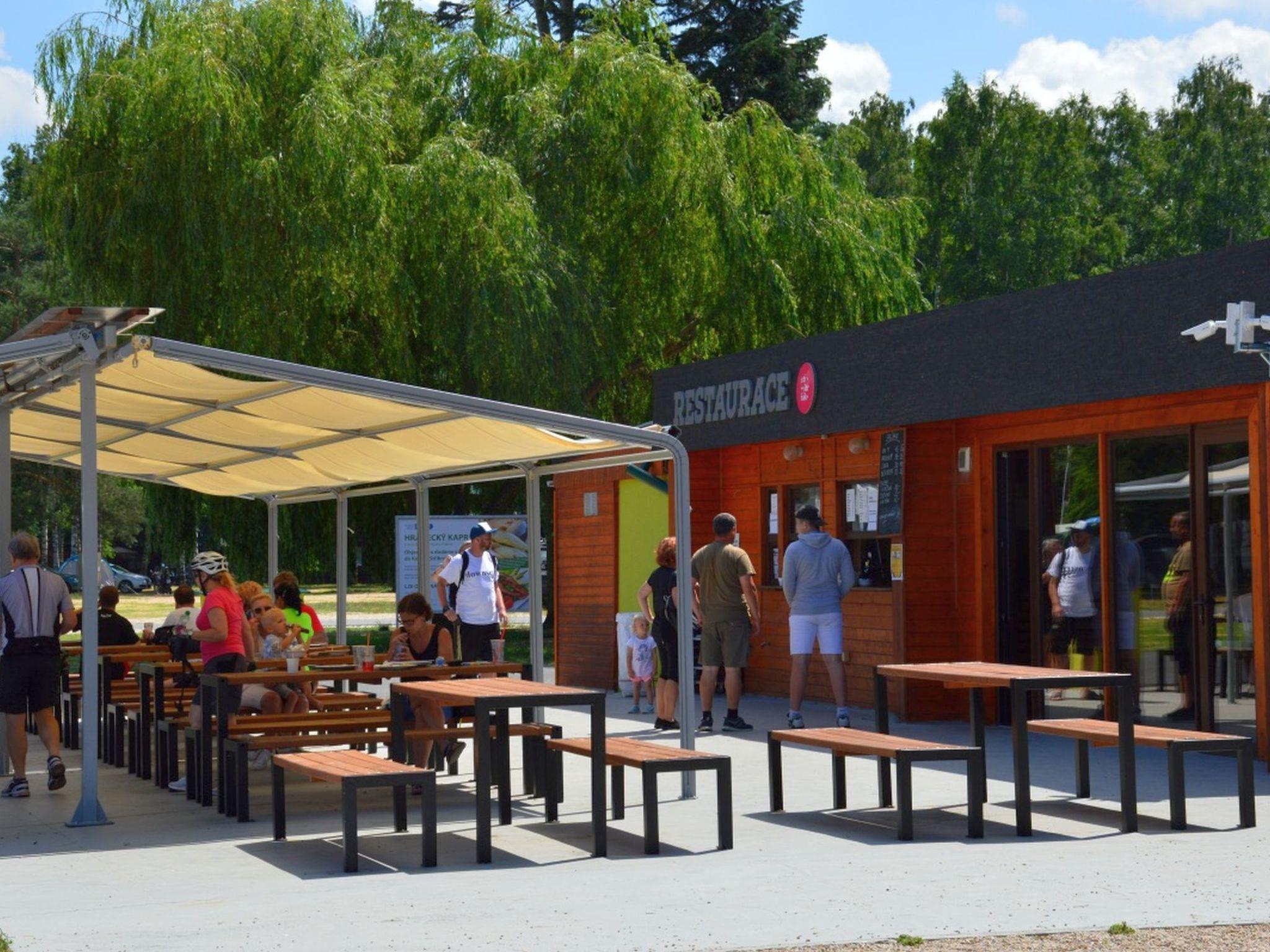 Child friendly holiday village "Kemp Stríbrný rybník". 25 houses in the resort. In the district of Malšova Lhota, 5 km from the centre of Hradec Králové, along the wooded area, on the lake. For shared use: property. Table tennis, boccia (extra), beach volleyball, arbour, barbecue, fireplace, children's playground, bathing jetty. In the complex: reception, restaurant, bar, bistro, playroom, washing machine (for shared use, extra), bicycle rental. Parking (extra) on the premises. Bus stop "Stríbrný rybník" 700 m, railway station "Blešno" 5 km, sandy beach, bathing lake 50 m. Sports harbour, minigolf, sports centre, walking paths from the house, cycle lane, fishing possibilities 50 m. Nearby attractions: Adventure park Firmsport, letní kino, tutistický vlácek do lesa, Stezka siluet, Rytírské hradište 3 km, Park Na Vetvi 3 km, Obory se zverí 4.2 km, Obrí akvárium, Botanická zahrada 4.7 km. Hiking paths: Pohádková, Vodnická stezka 6 km, Planetárium, planetární stezka 8.4 km, Zoopark Stežery, Rozhledna Milír 15 km. Please note: entertainment in the season. Suitable for families. Fishing [permit required]. The photograph shows a typical example.