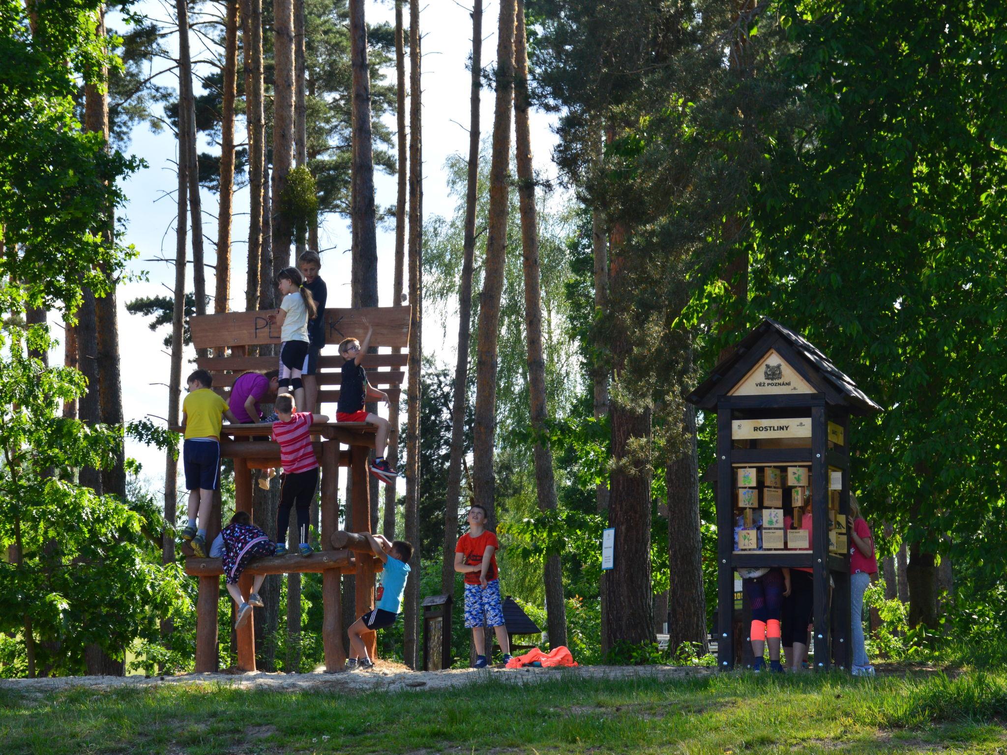 Child friendly holiday village "Kemp Stríbrný rybník". 25 houses in the resort. In the district of Malšova Lhota, 5 km from the centre of Hradec Králové, along the wooded area, on the lake. For shared use: property. Table tennis, boccia (extra), beach volleyball, arbour, barbecue, fireplace, children's playground, bathing jetty. In the complex: reception, restaurant, bar, bistro, playroom, washing machine (for shared use, extra), bicycle rental. Parking (extra) on the premises. Bus stop "Stríbrný rybník" 700 m, railway station "Blešno" 5 km, sandy beach, bathing lake 50 m. Sports harbour, minigolf, sports centre, walking paths from the house, cycle lane, fishing possibilities 50 m. Nearby attractions: Adventure park Firmsport, letní kino, tutistický vlácek do lesa, Stezka siluet, Rytírské hradište 3 km, Park Na Vetvi 3 km, Obory se zverí 4.2 km, Obrí akvárium, Botanická zahrada 4.7 km. Hiking paths: Pohádková, Vodnická stezka 6 km, Planetárium, planetární stezka 8.4 km, Zoopark Stežery, Rozhledna Milír 15 km. Please note: entertainment in the season. Suitable for families. Fishing [permit required]. The photograph shows a typical example.