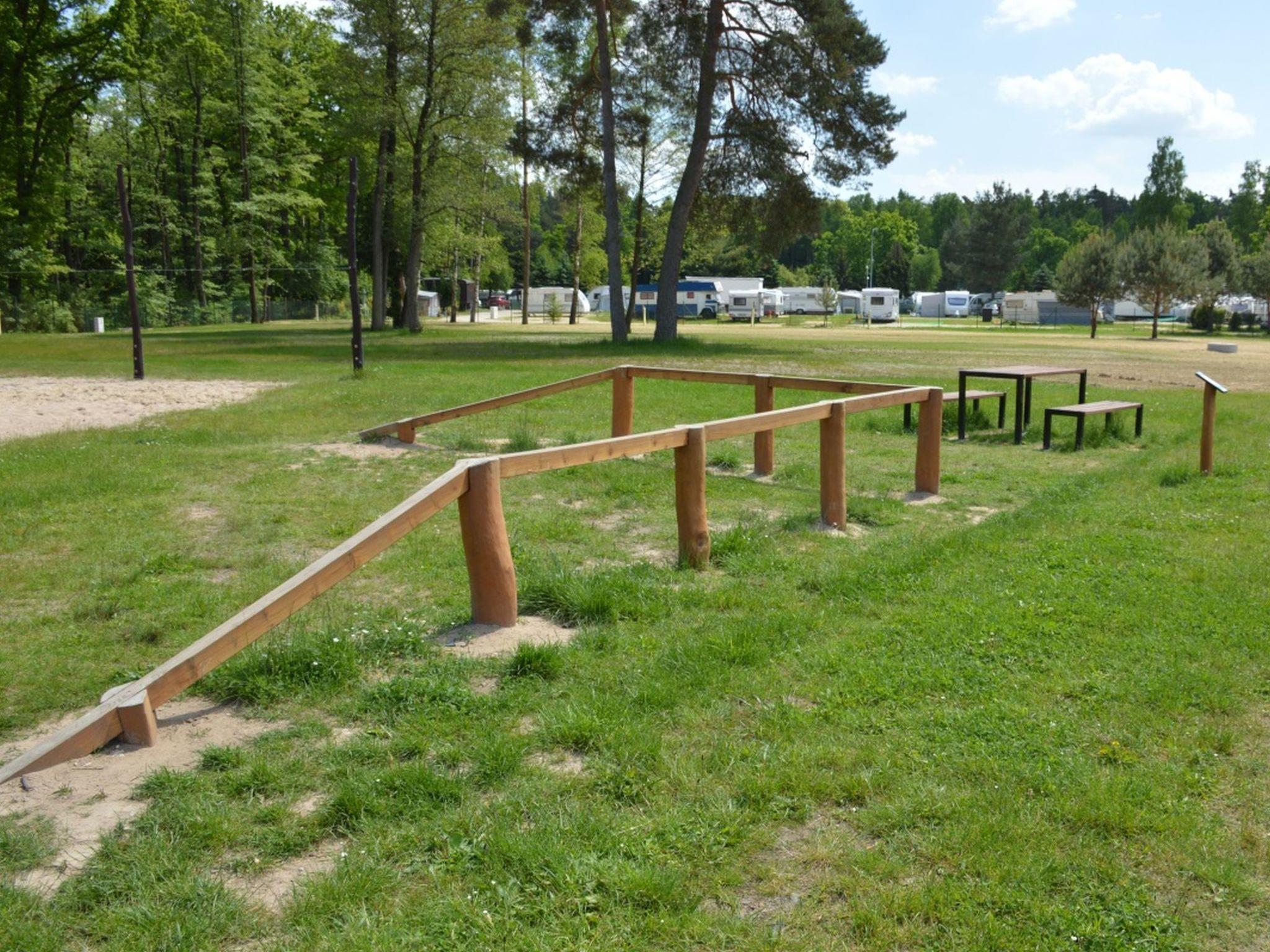Child friendly holiday village "Kemp Stríbrný rybník". 25 houses in the resort. In the district of Malšova Lhota, 5 km from the centre of Hradec Králové, along the wooded area, on the lake. For shared use: property. Table tennis, boccia (extra), beach volleyball, arbour, barbecue, fireplace, children's playground, bathing jetty. In the complex: reception, restaurant, bar, bistro, playroom, washing machine (for shared use, extra), bicycle rental. Parking (extra) on the premises. Bus stop "Stríbrný rybník" 700 m, railway station "Blešno" 5 km, sandy beach, bathing lake 50 m. Sports harbour, minigolf, sports centre, walking paths from the house, cycle lane, fishing possibilities 50 m. Nearby attractions: Adventure park Firmsport, letní kino, tutistický vlácek do lesa, Stezka siluet, Rytírské hradište 3 km, Park Na Vetvi 3 km, Obory se zverí 4.2 km, Obrí akvárium, Botanická zahrada 4.7 km. Hiking paths: Pohádková, Vodnická stezka 6 km, Planetárium, planetární stezka 8.4 km, Zoopark Stežery, Rozhledna Milír 15 km. Please note: entertainment in the season. Suitable for families. Fishing [permit required]. The photograph shows a typical example.