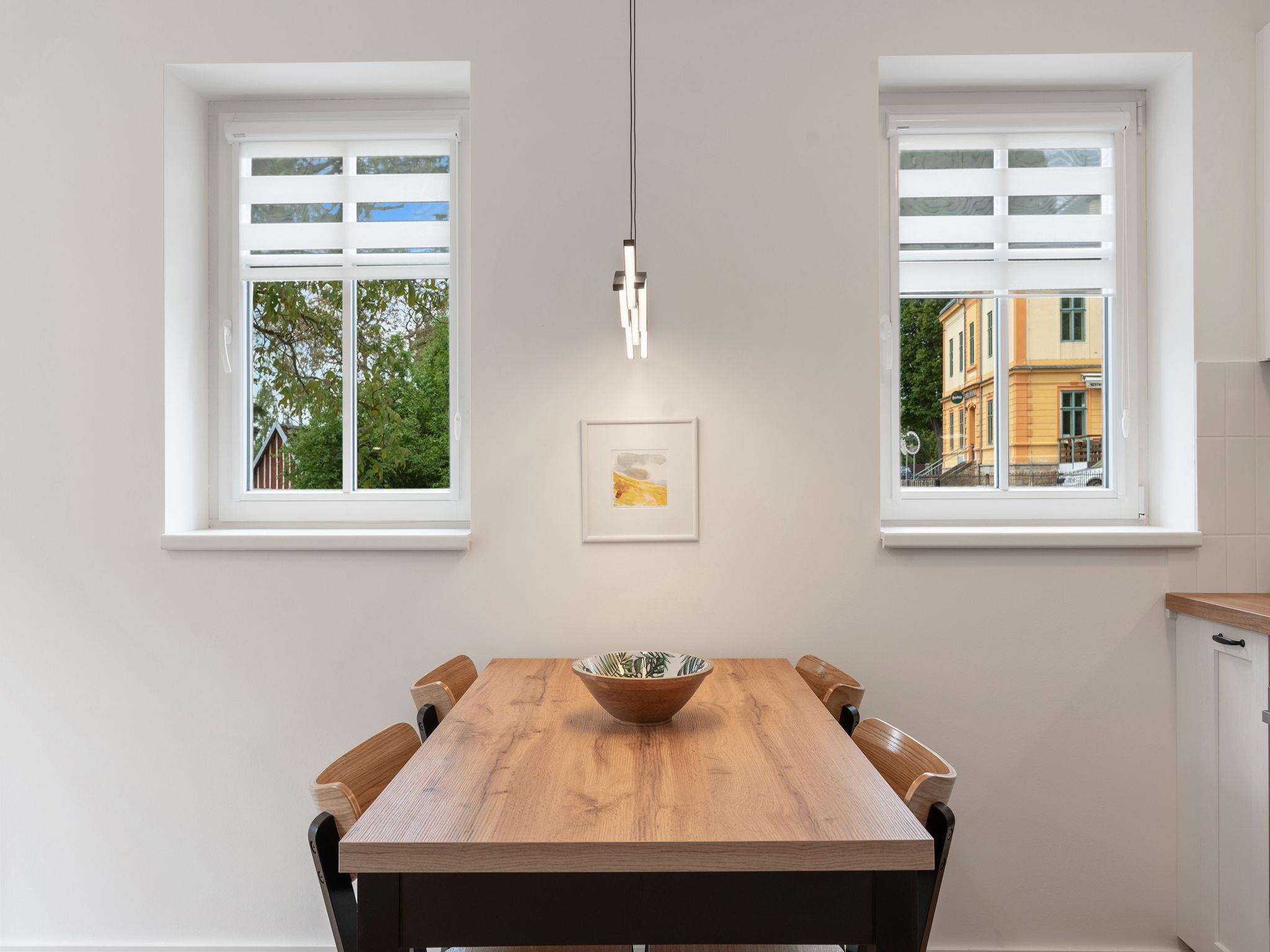 2-room apartment on the ground floor. Very beautiful furnishings: living/sleeping room with 1 double sofabed (140 cm), TV. Exit to the balcony. 1 room with 1 double bed. Kitchenette (oven, dishwasher, 2 ceramic glass hob hotplates, kettle, microwave, electric coffee machine) with dining nook. Shower/WC. Balcony. Balcony furniture. Beautiful view of the garden and the forest. Facilities: hair dryer. Internet (WiFi, free). Parking. Suitable for families. Maximum 2 pets/ dogs allowed.