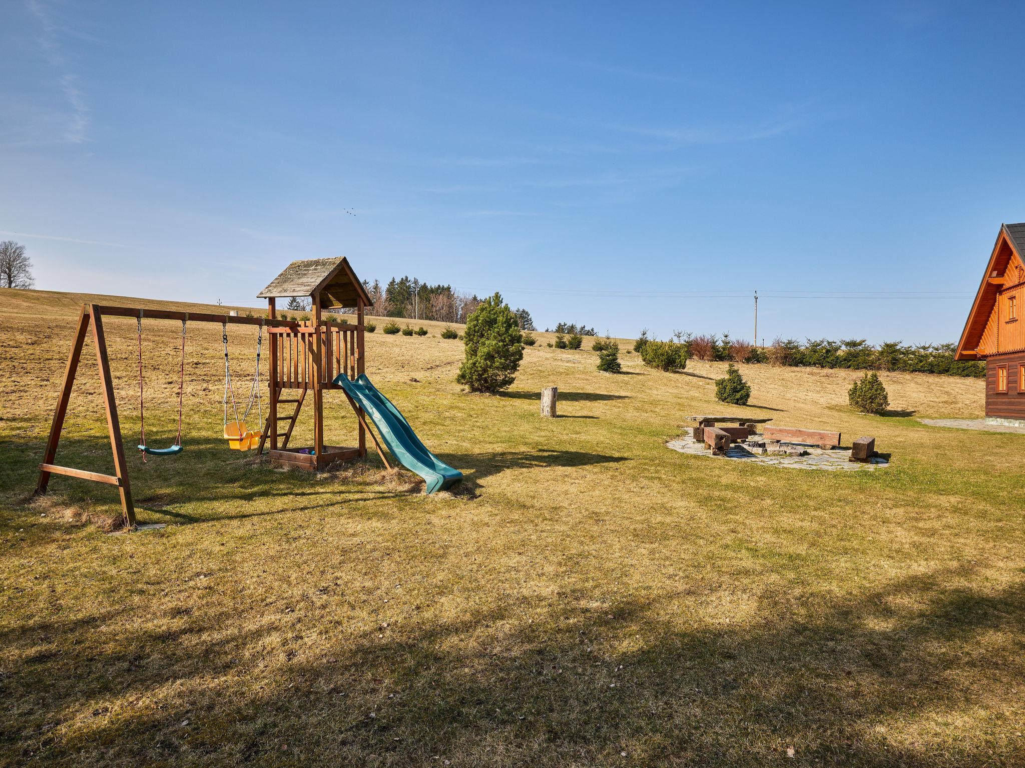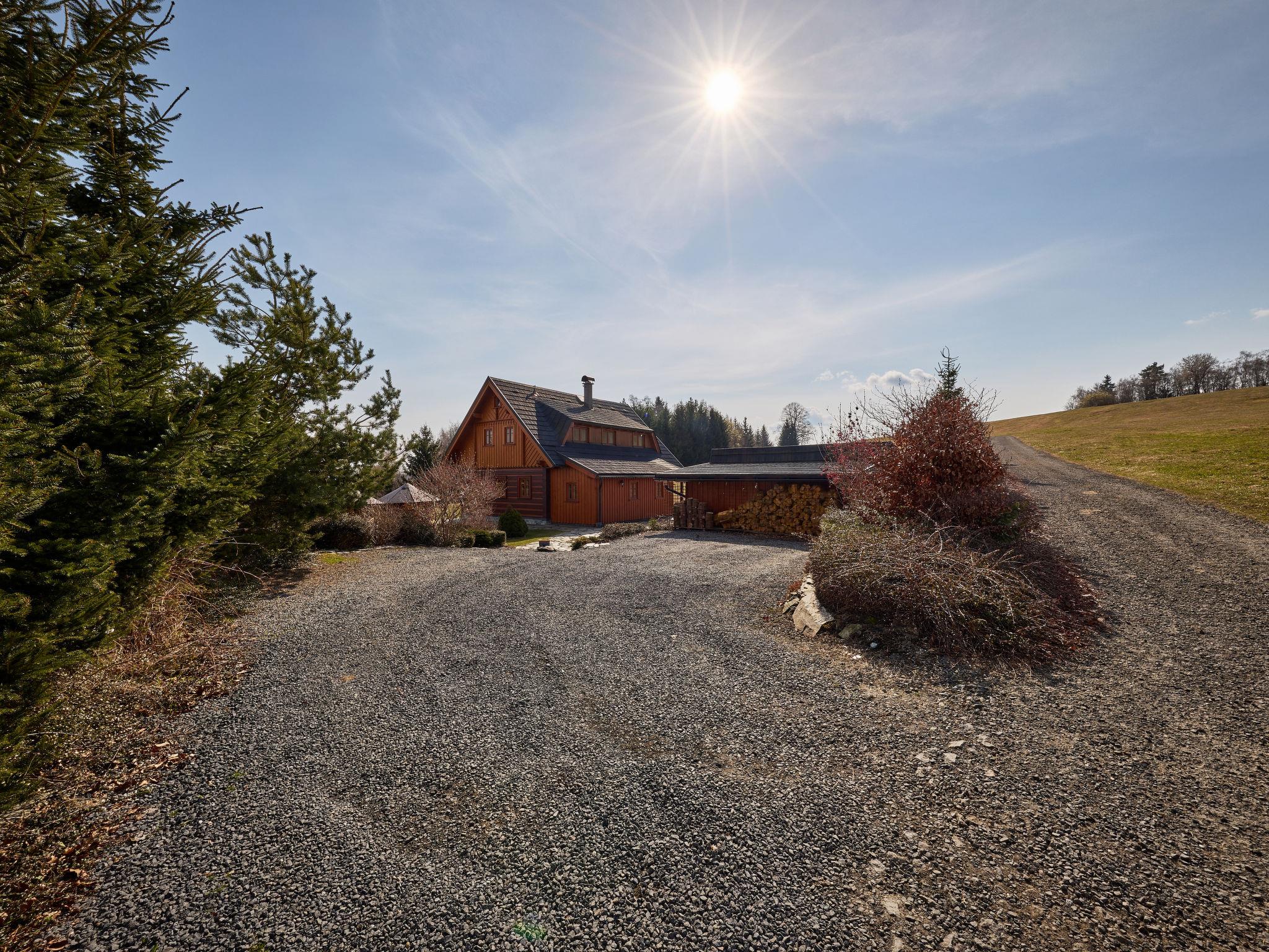Large, beautiful, luxurious timber house "Timber Lodge with Hydromassage", built in 2015. 500 m from the centre of Jílové u Držkova, in a secluded, quiet, sunny position on top of a hill. Trees. Private: large garden (not fenced) trees, natural garden 2'000 m2, lawn for sunbathing. Hot tub, terrace, garden furniture, barbecue, fireplace, children's playground. In Winter: please take snow chains. Parking (for 5 cars) at the house. Shop 3 km, restaurant 600 m, bus stop "Jílové u Držkova" 400 m, railway station "Návarov" 3.5 km, thermal baths "Termy Cieplickie PL" 50 km, natural swimming pond 300 m. Golf course (9 hole) 20 km, minigolf 14 km, ski lift 6 km, ski rental 6 km, cross country ski track 6 km. Nearby attractions: Návarov 5 km, Šibenák 6 km, Železný Brod 8 km, Bozkovské jeskyne 10 km, Malá Skála 20 km, Pencín 6 km. Well-known ski regions can easily be reached: Kozákov 16 km, Zásada 6 km, Vysoké nad Jizerou 13 km. Well-known lakes can easily be reached: lom Jílové 300 m. Hiking paths: Návarov 5 km, Semily Riegrova stezka 12 km, Palackého stezka 5 km. Please note: suitable for families. The owner does not accept any youth groups.