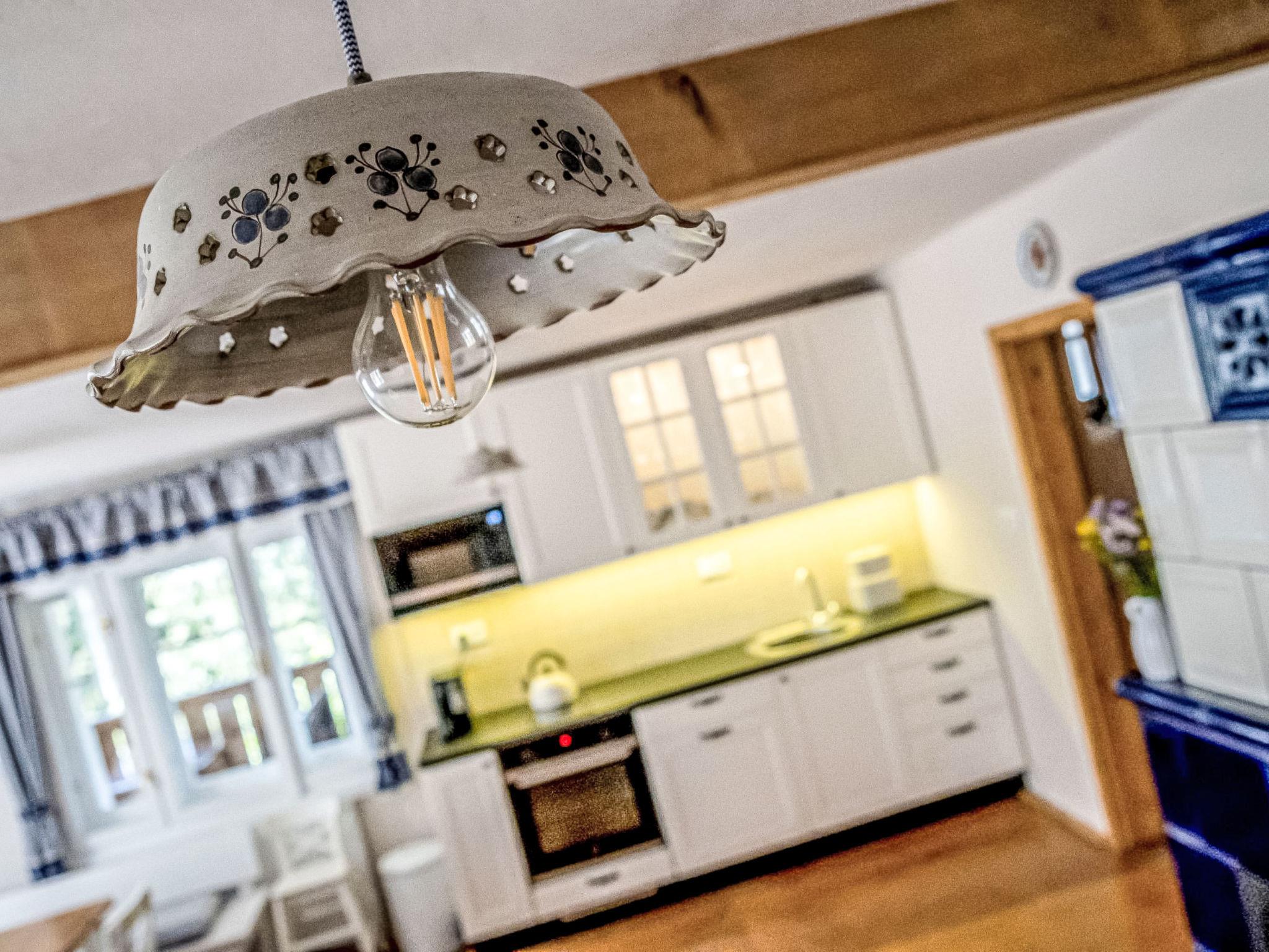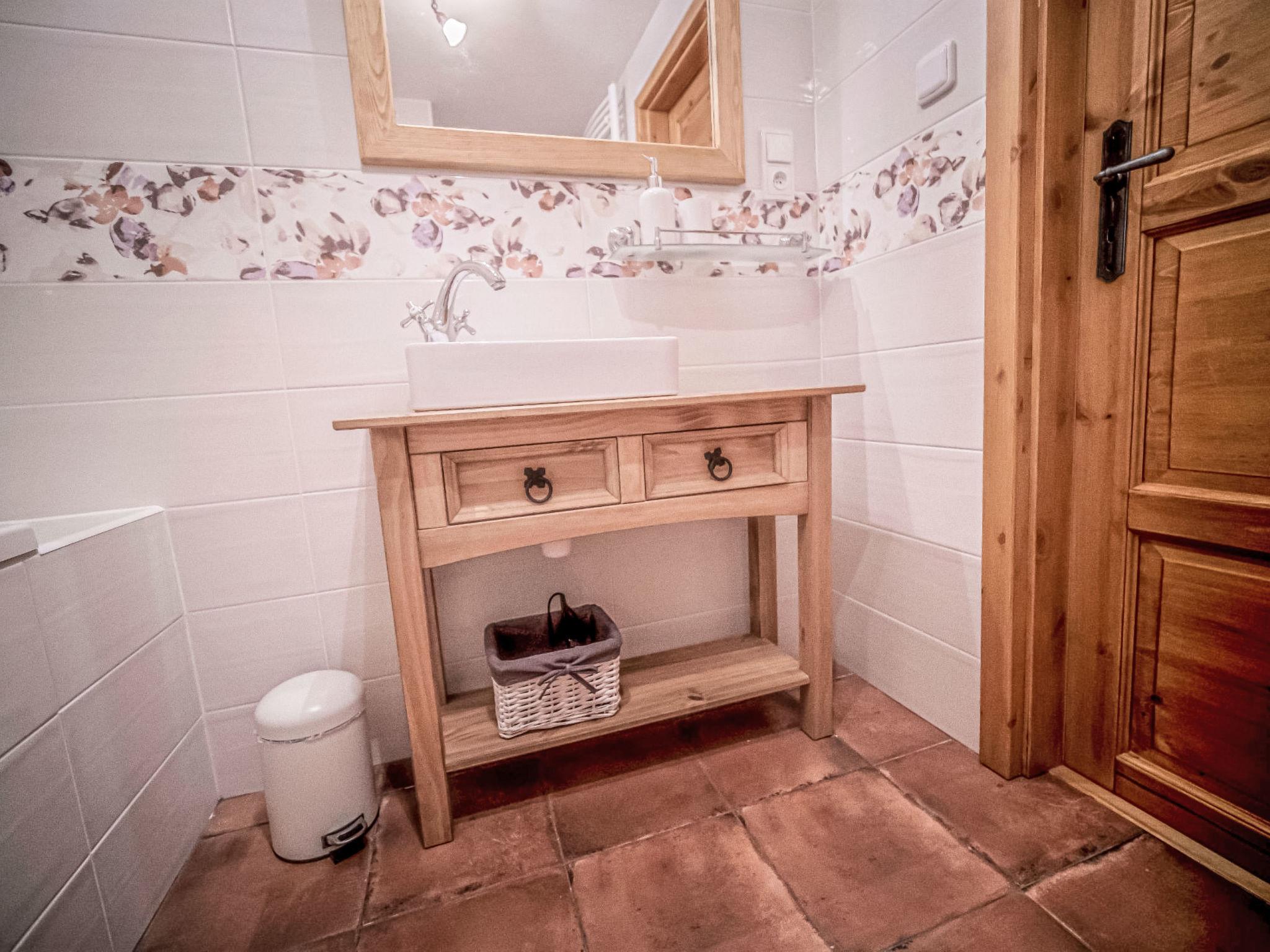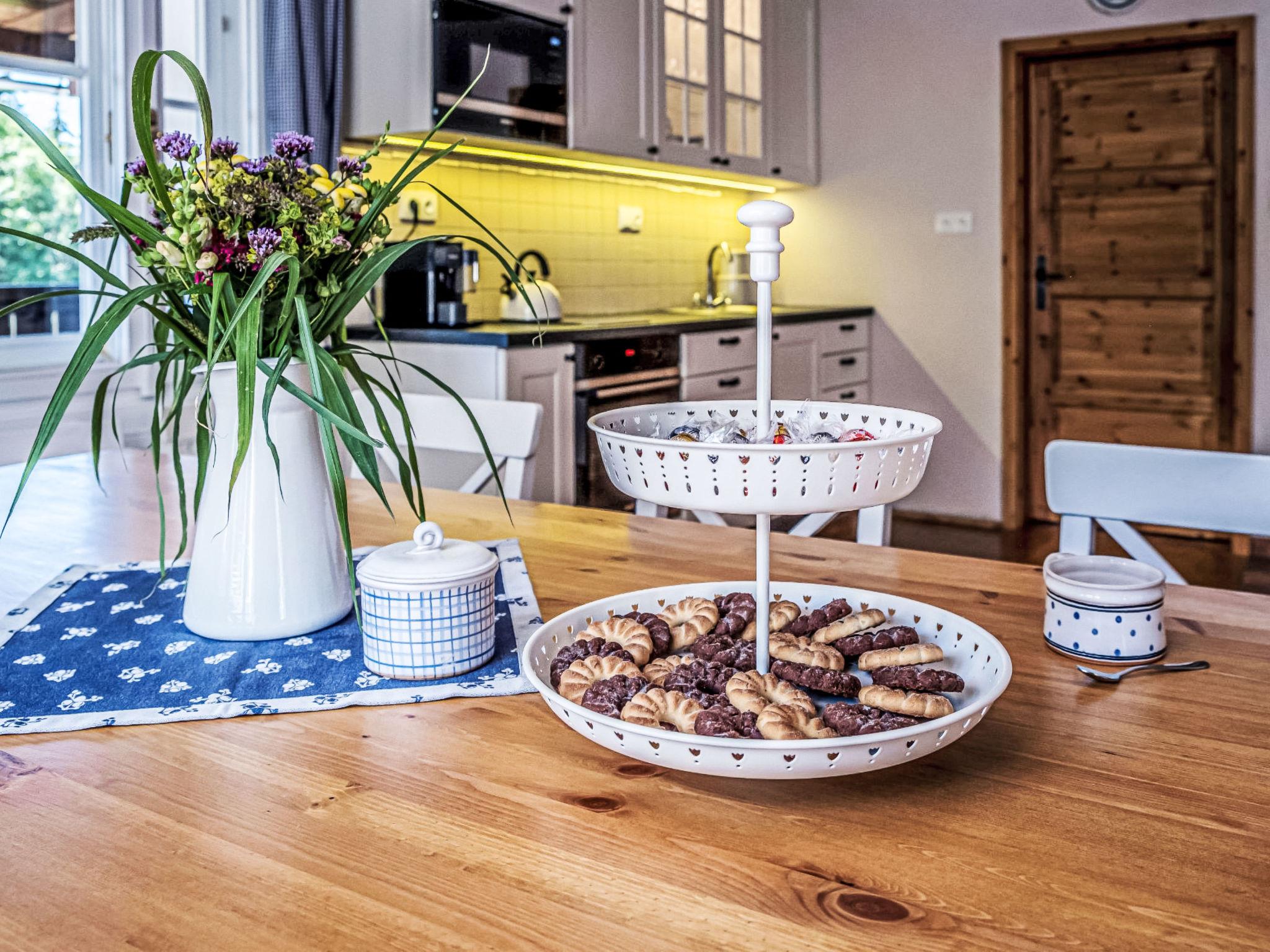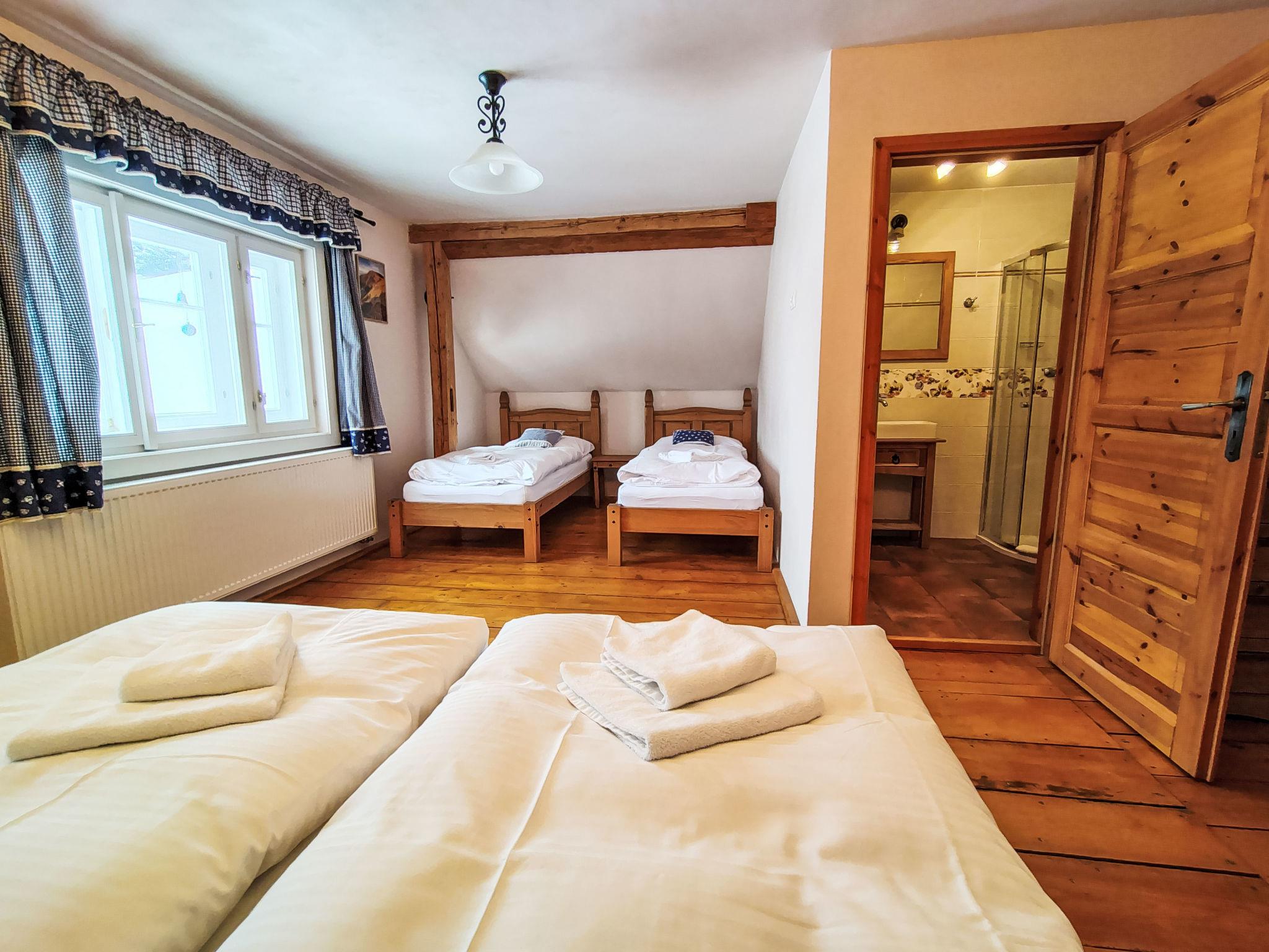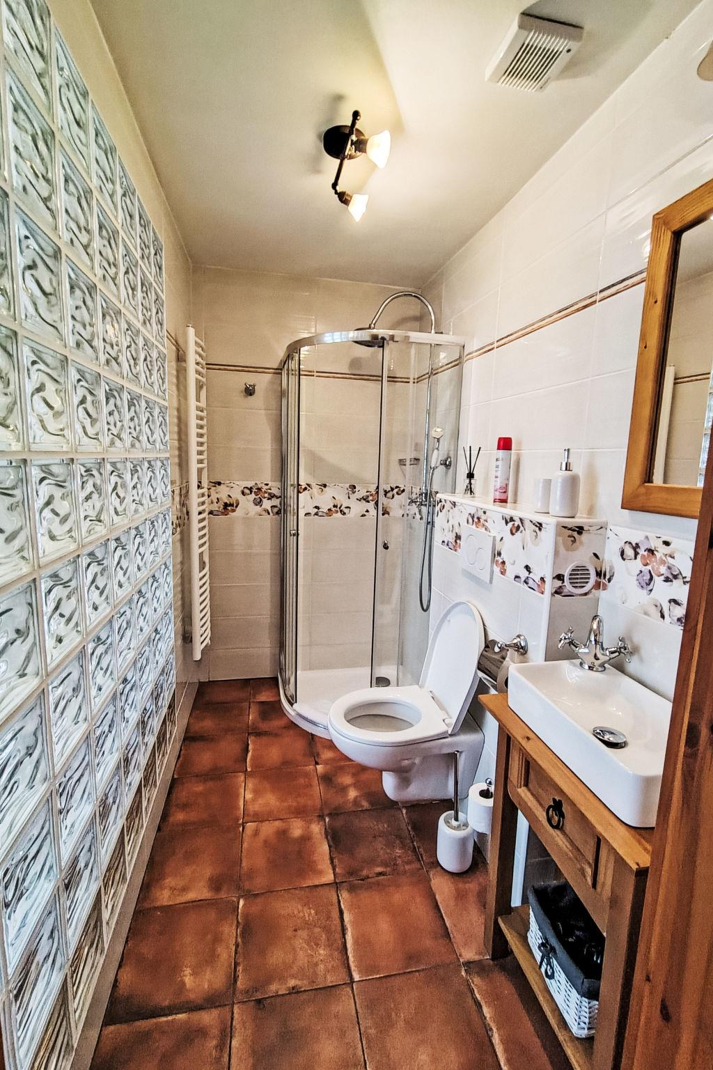5-room cottage 200 m2. Very beautiful and rustic furnishings: entrance hall with separate WC. Exit to the veranda. Open large living/dining room with 1 sofabed and dining table. Large, open kitchen (oven, dishwasher, 4 ceramic glass hob hotplates, toaster, kettle, microwave, freezer, electric coffee machine, Capsules for coffee machine (Nespresso)) with electric heating and tiled stove. Sep. WC, Sauna. 2nd upper floor: 1 room with 2 beds, 1 double bed and shower/WC. 1 room with 1 double bed and shower/WC. 1 room with 1 double bed and shower/WC. 1 room with 2 beds, 1 double bed and bath/WC. Wooden floors. Terrace furniture. View of the mountains, the garden and the forest. Facilities: washing machine, sauna, children's high chair, baby cot, hair dryer. Internet (WiFi, free). Please note: suitable for families. Non-smokers only. Maximum 1 pet/ dog allowed.