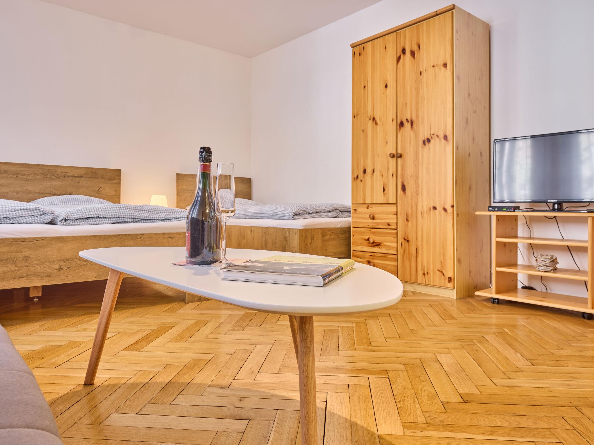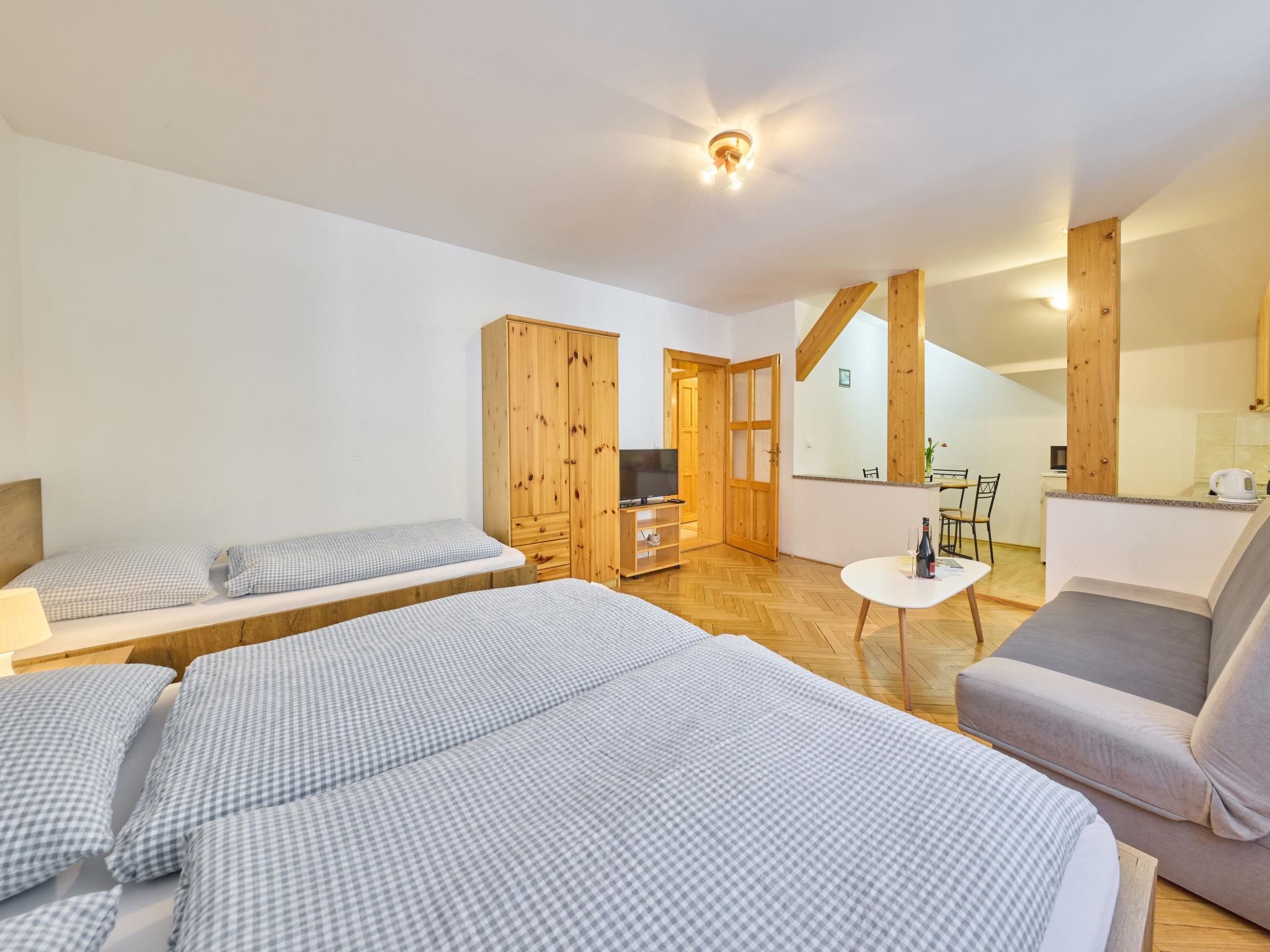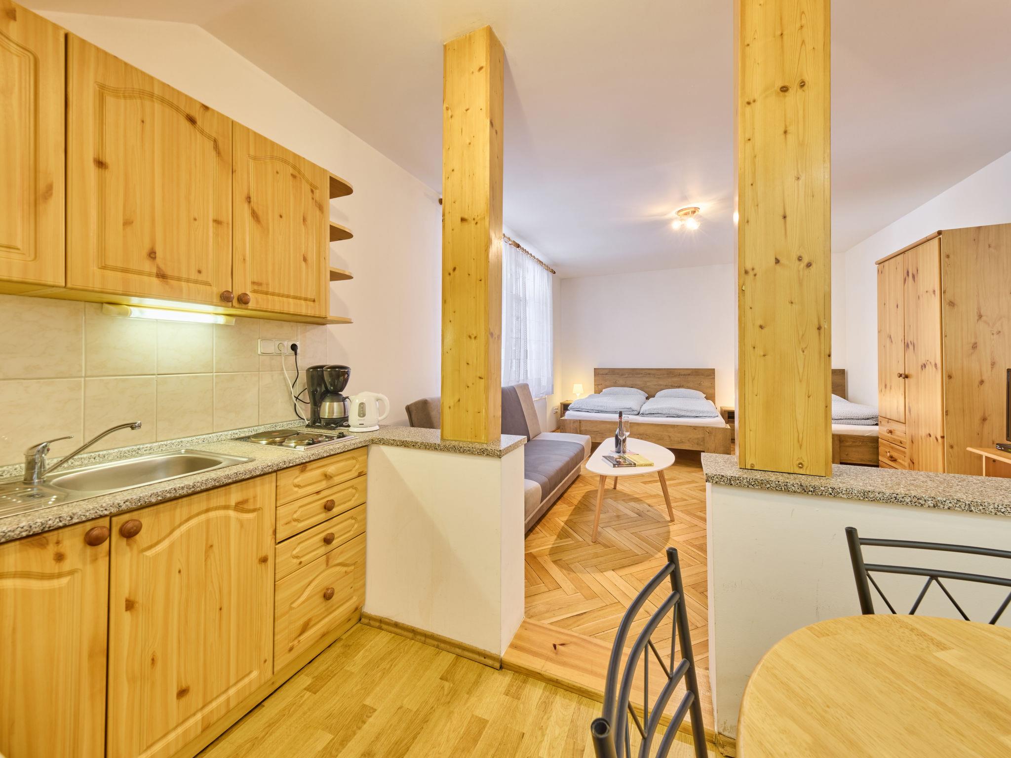 1-room studio on 2nd floor. Bright, beautiful furnishings: living/sleeping room with 3 beds and TV. Kitchenette (2 hot plates, kettle, microwave, electric coffee machine). Shower/WC. Facilities: Internet (WiFi, free). Please note: suitable for families. TV only CS.