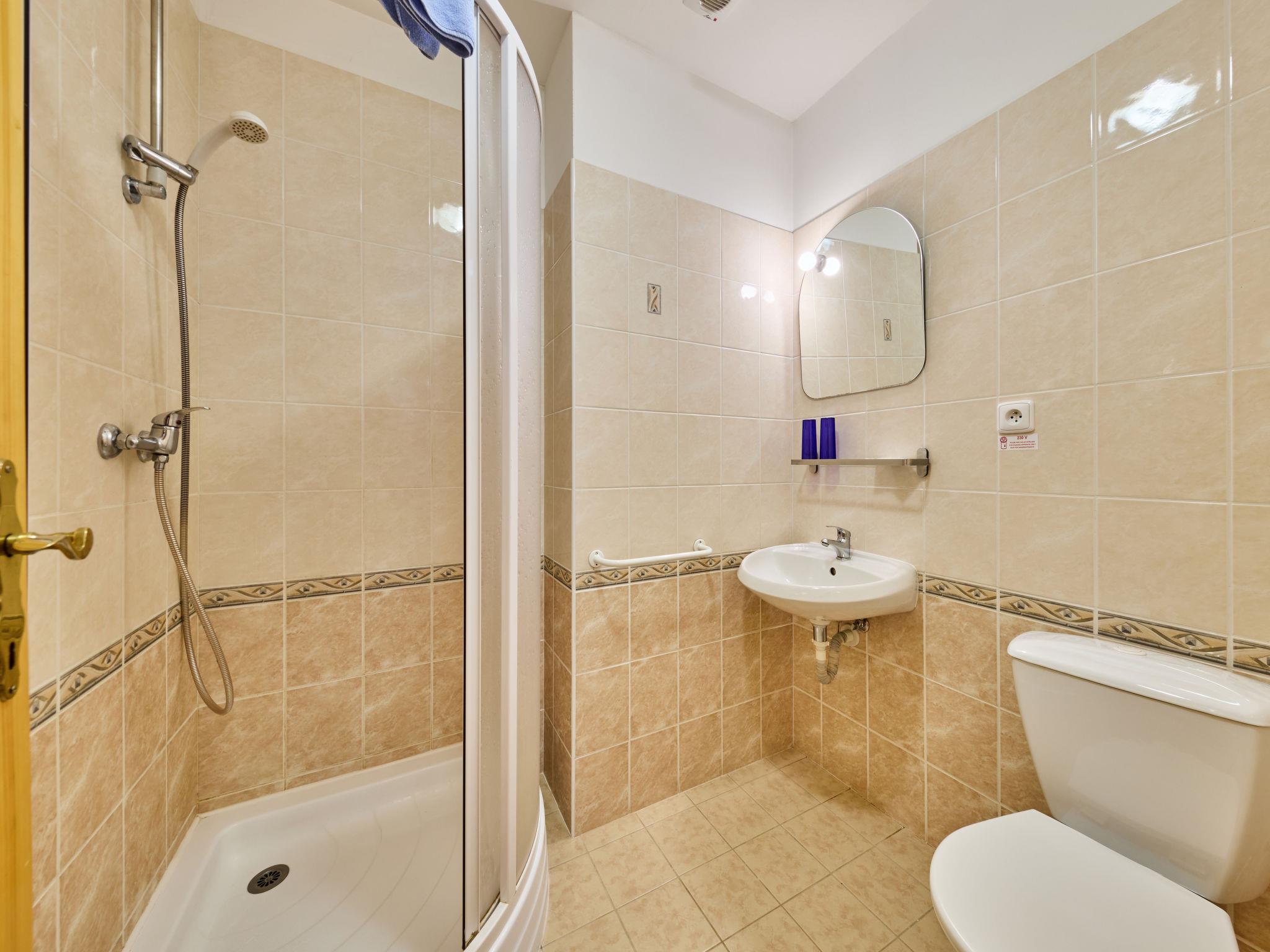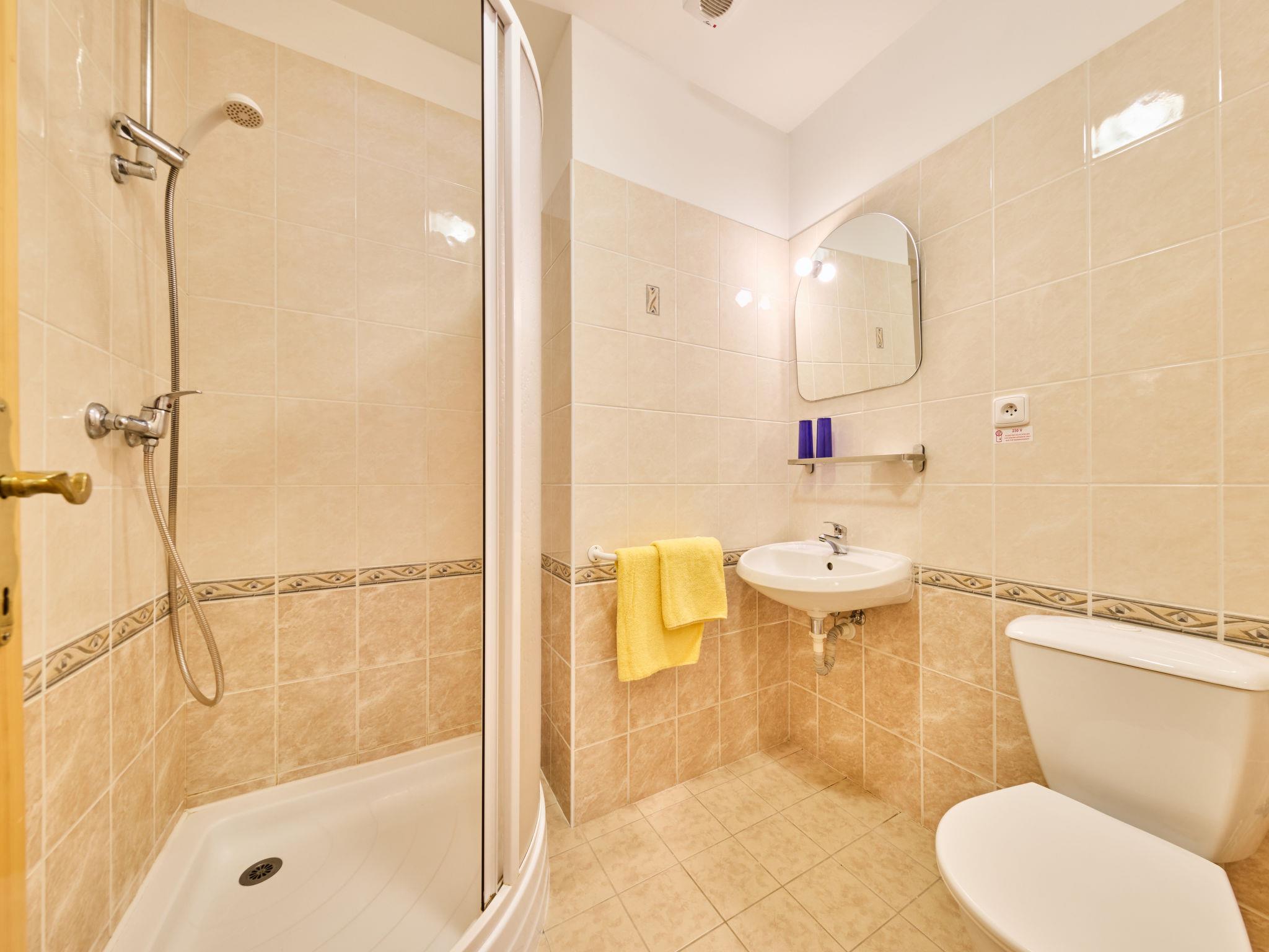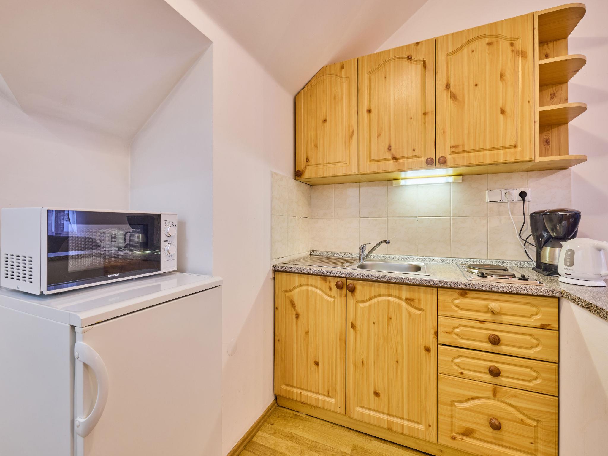 1-room studio on 2nd floor. Bright, beautiful furnishings: living/sleeping room with 3 beds and TV. Kitchenette (2 hot plates, kettle, microwave, electric coffee machine). Shower/WC. Facilities: Internet (WiFi, free). Please note: suitable for families. TV only CS.