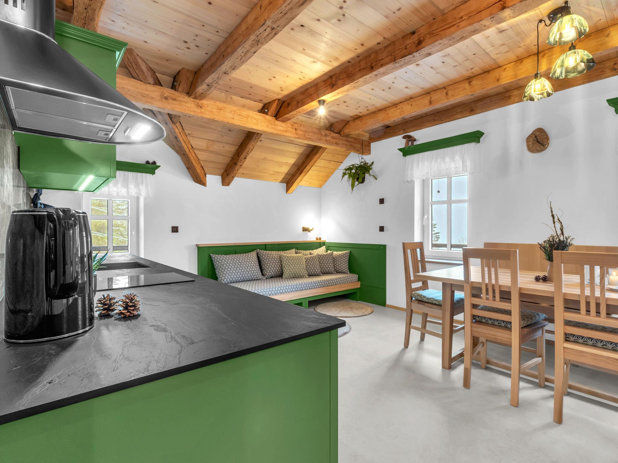 "V Mechu", 3-room apartment 47 m2 on 2 levels, on the top floor. Object suitable for 4 adults + 2 children. Luxurious and stylish furnishings: large living/dining room with dining nook and TV (flat screen). 1 room with 1 x 2 bunk beds, 1 double bed. Kitchenette (oven, dishwasher, 2 ceramic glass hob hotplates, toaster, kettle, microwave, electric coffee machine). Bath/WC. Floor heating. Upper floor: (steep stair), 1 open room with sloping ceilings with 2 beds (140 cm). Open small living room. Beautiful panoramic view of the valley. Facilities: washing machine. Internet (WiFi, free). Please note: suitable for families. No lift.
