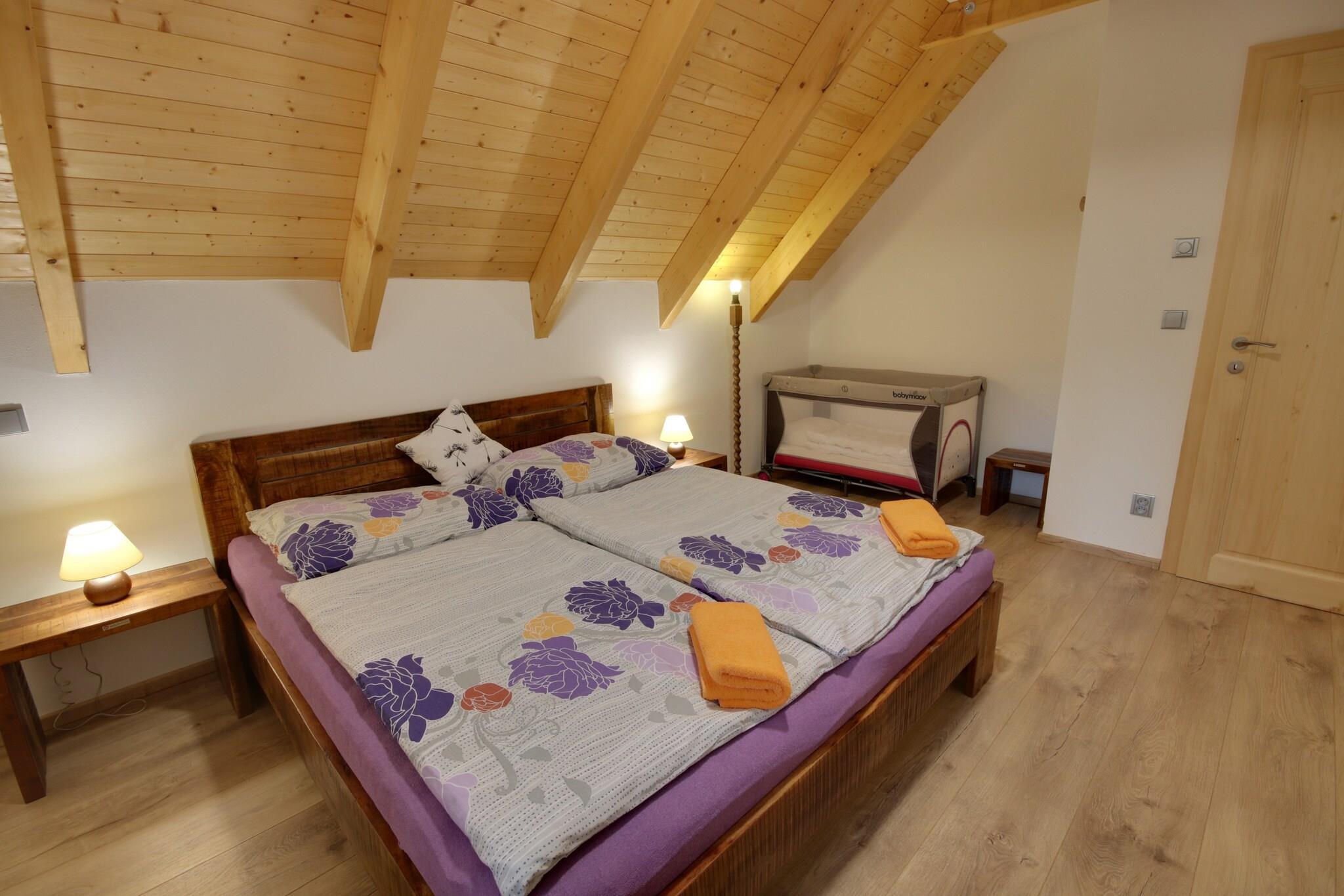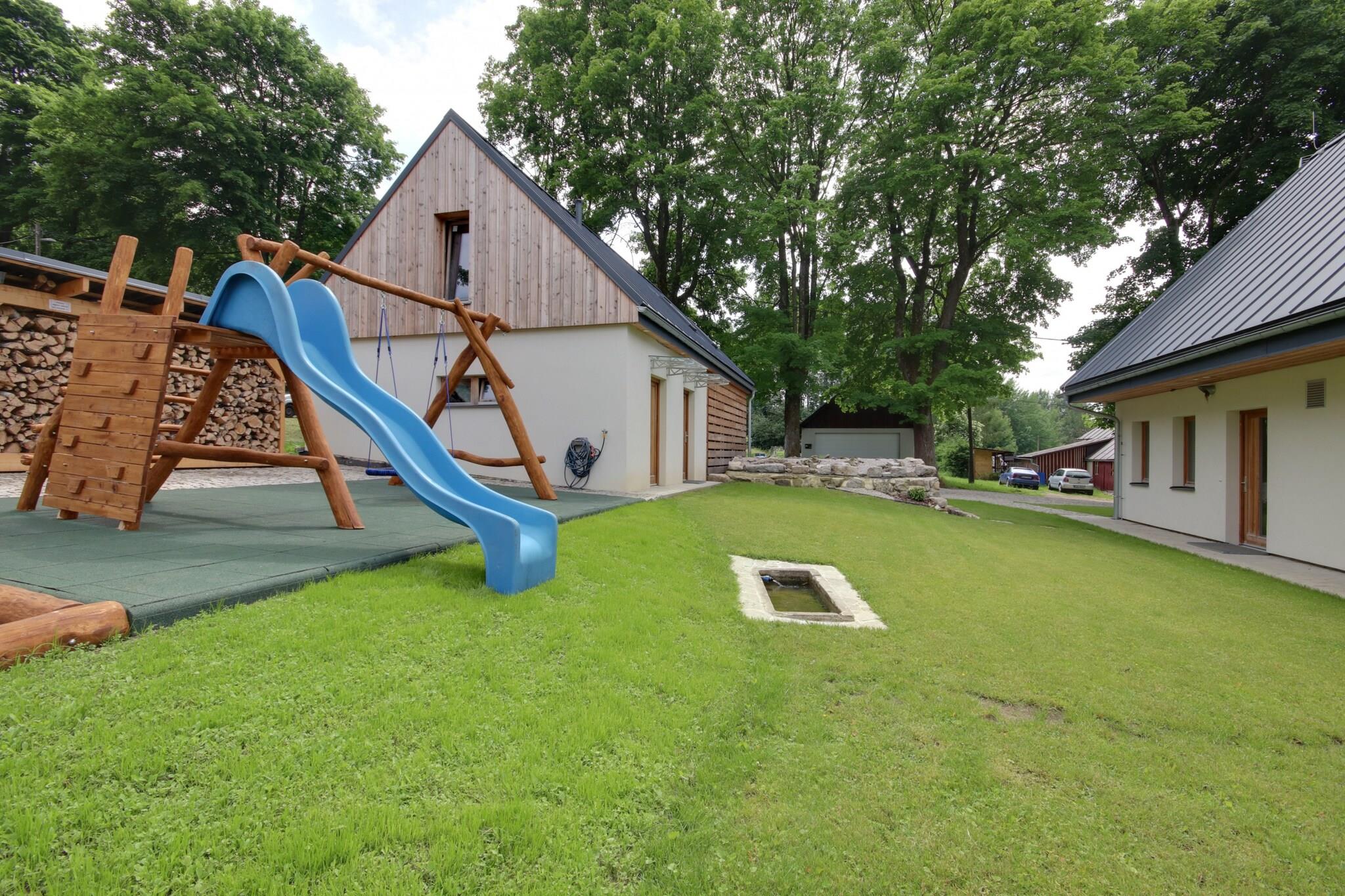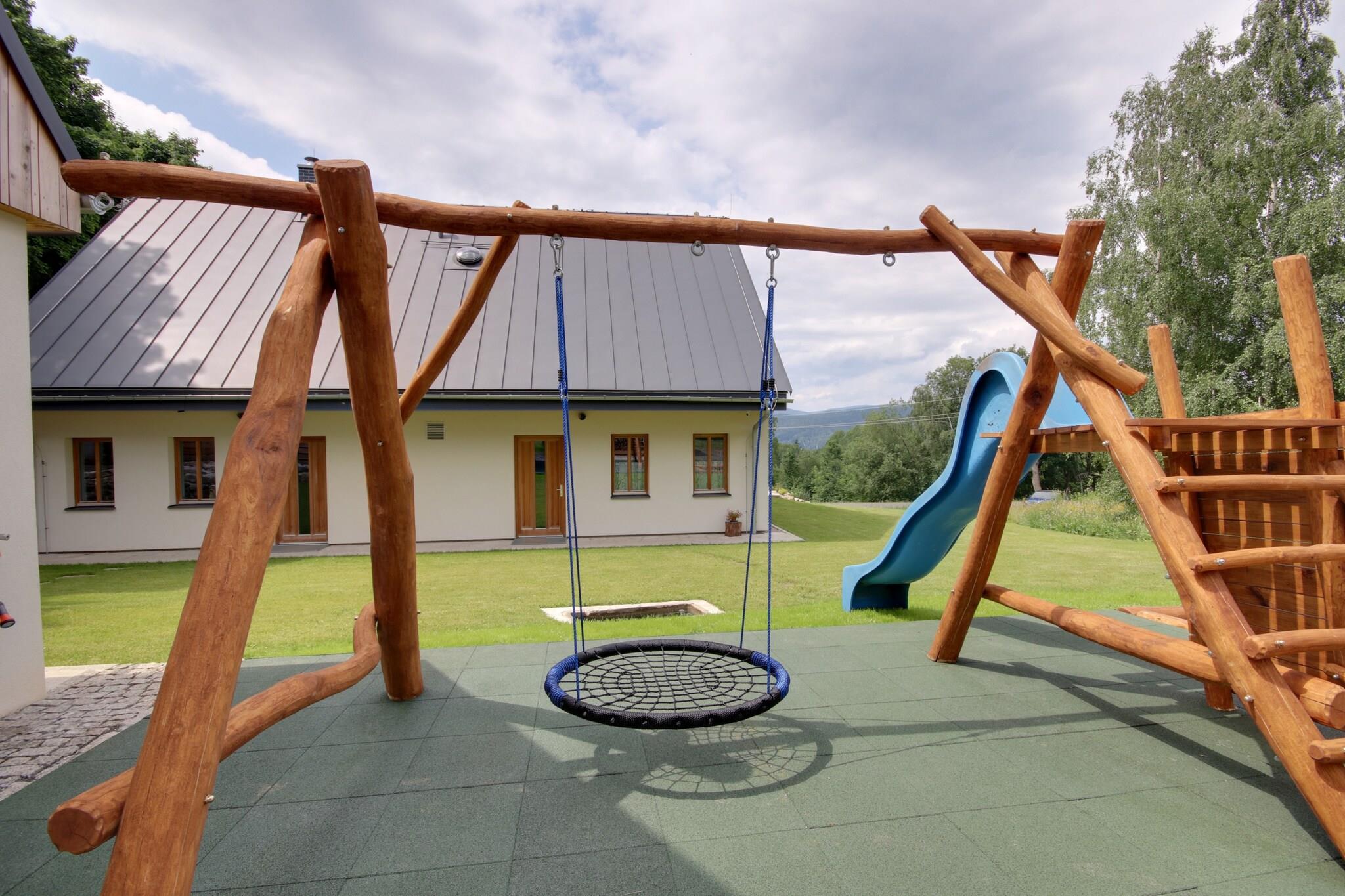 Denne rummelige villa, beliggende i Korenov, tilbyder et ideelt tilflugtssted for op til 12 gæster. Perfekt til familier eller grupper, det har to luksuriøst udstyrede lejligheder, der giver mulighed for privatliv, hvis det er nødvendigt. Ejendommen er kæledyrsvenlig, hvilket sikrer, at alle i din gruppe, inklusive kæledyr, er komfortable. Med 5 soveværelser og 3 moderne badeværelser er der masser af plads til alle gæster. Badeværelserne er slanke, med finish af høj kvalitet og kraftfulde brusere, mens det veludstyrede køkken har alt, hvad der skal til for at tilberede lækre måltider, lige fra køleskab og mikroovn til ovn og opvaskemaskine. Villaen ligger kun 2 km fra det populære U Capa skisportssted, hvilket gør det til et førsteklasses sted for vintersportsentusiaster. Om sommeren byder området på en række udendørs aktiviteter, herunder vandreture i Jezerske Hory-naturreservatet eller cykling langs lokale cykelstier. Det nærliggende skiområde Tanvaldsky Spicak ligger kun en kort køretur derfra, og byen byder også på kulturelle oplevelser og charmerende markeder. En swimmingpool i Tanvald, kun 5 km fra villaen, er et perfekt sted at slappe af efter en aktiv dag. Villaen er udstyret med alle de faciliteter, der er nødvendige for et behageligt ophold. Det har et fuldt udstyret køkken til at tilberede måltider, en hyggelig opholdsstue til underholdning og en rummelig have med legeredskaber til børn. Forældre kan slappe af på terrassen eller tænde grillen om aftenen for at nyde et dejligt måltid udendørs. Villaen tilbyder også et vaskerum med vaskemaskine og tørretumbler for din bekvemmelighed.