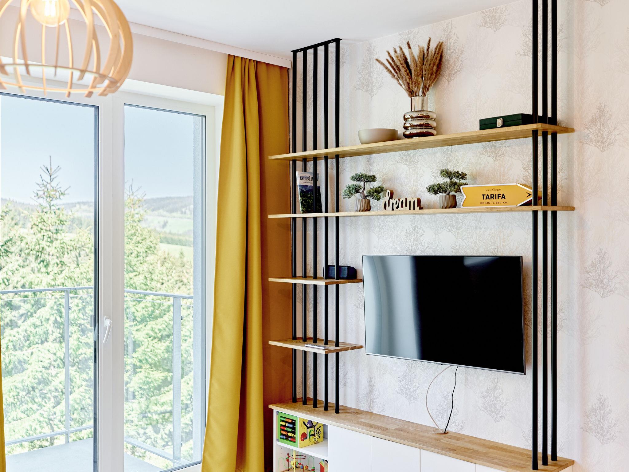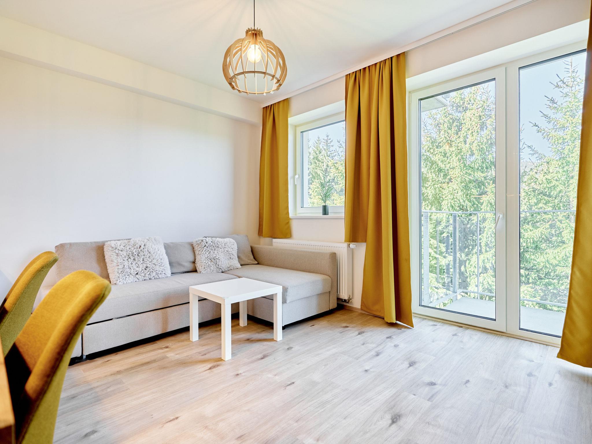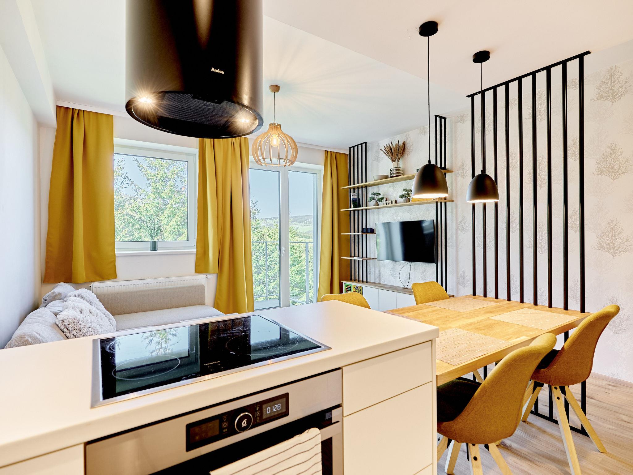 "Klínovec Suite", 2-room apartment 48 m2. Beautiful and modern furnishings: living room with 1 double sofabed and TV. 1 room with 1 x 2 bunk beds, 1 double bed. Kitchenette (oven, dishwasher, microwave, electric coffee machine) with dining table, TV. Exit to the balcony. Shower/WC. Heating. Small balcony. Beautiful view of the mountains and the forest. Facilities: Internet (WiFi, free). Garage at the house. Please note: non-smokers only. 1 pet/ dog allowed.