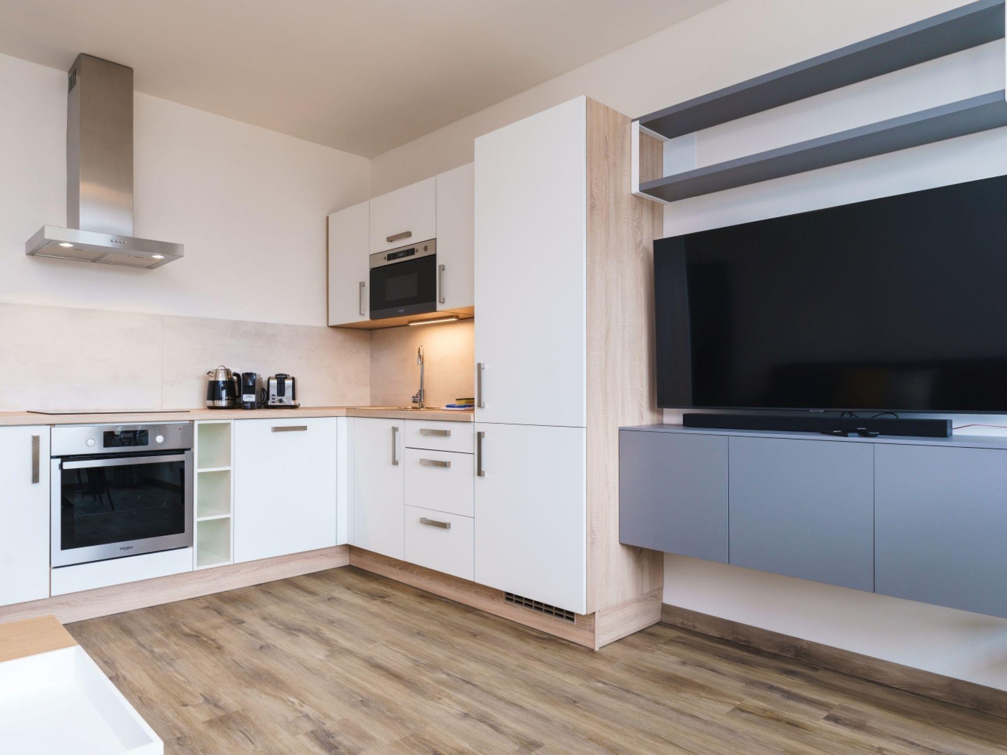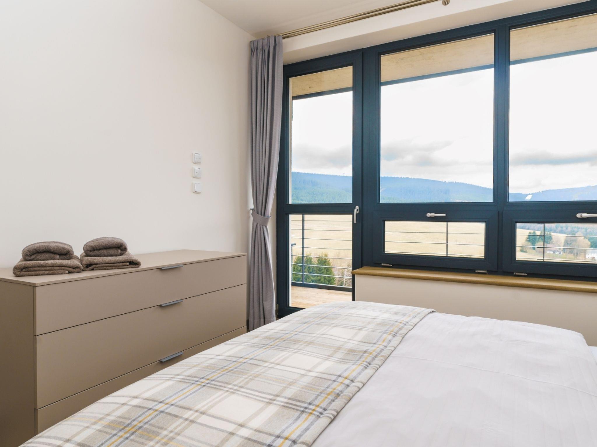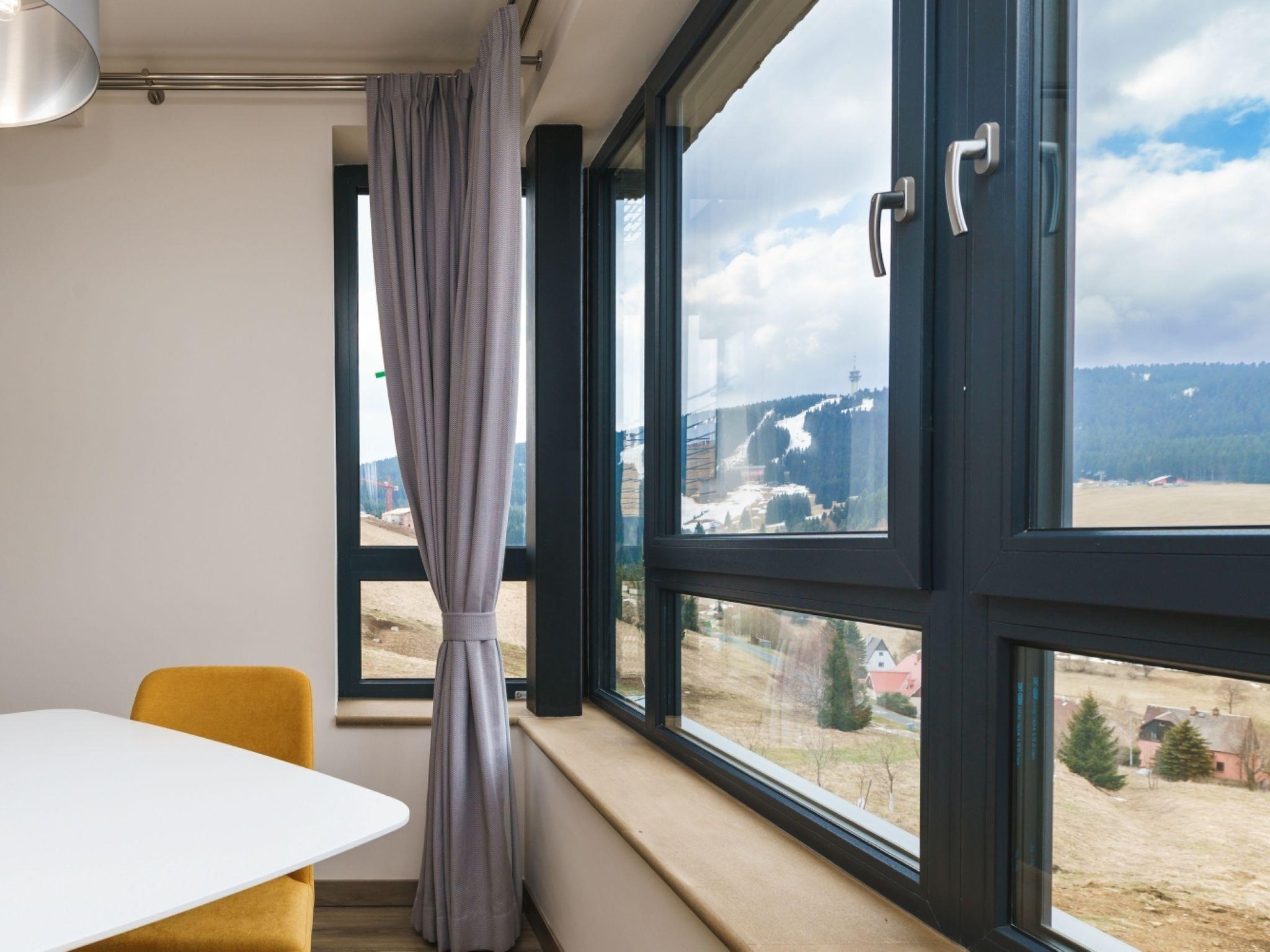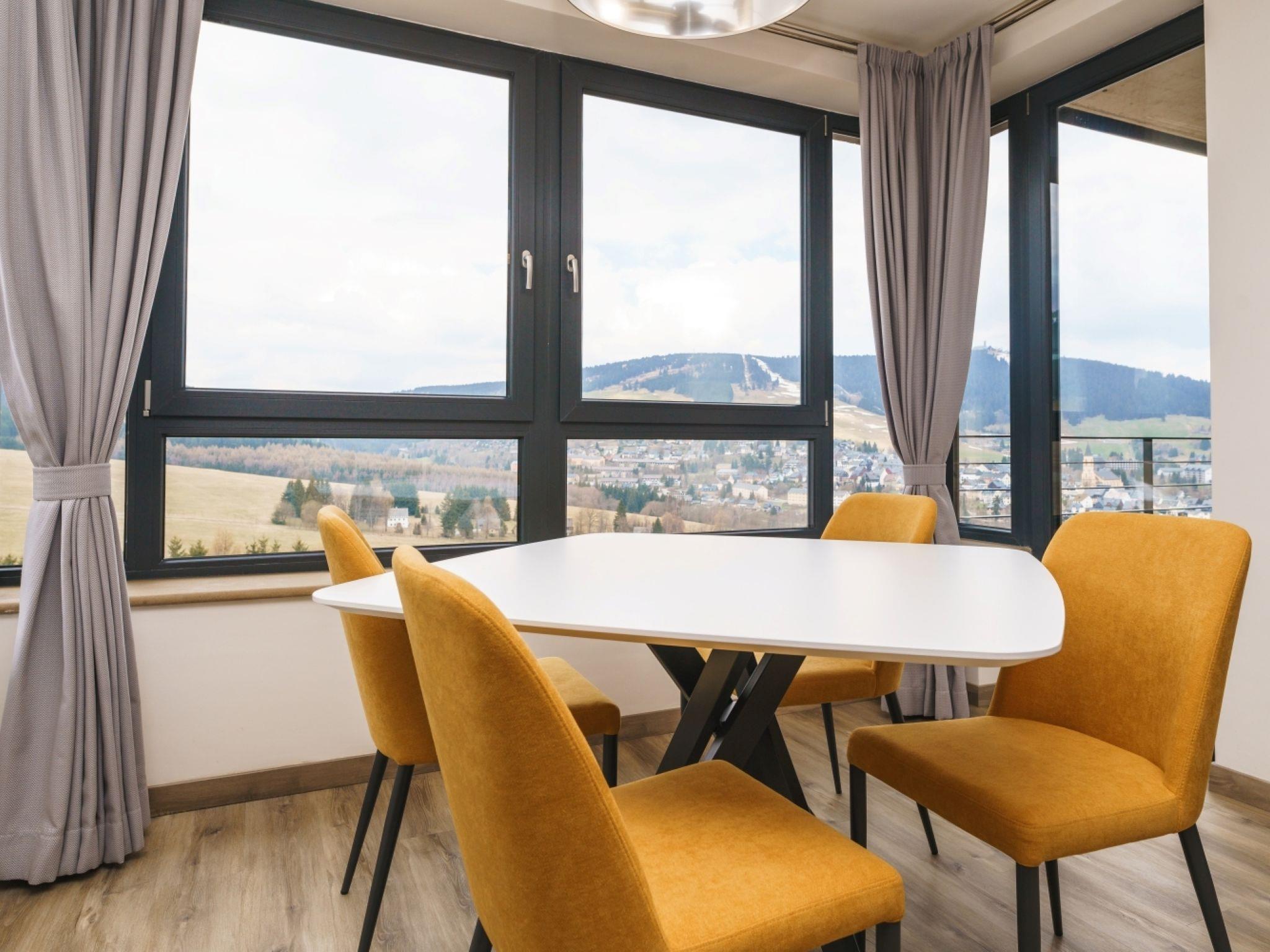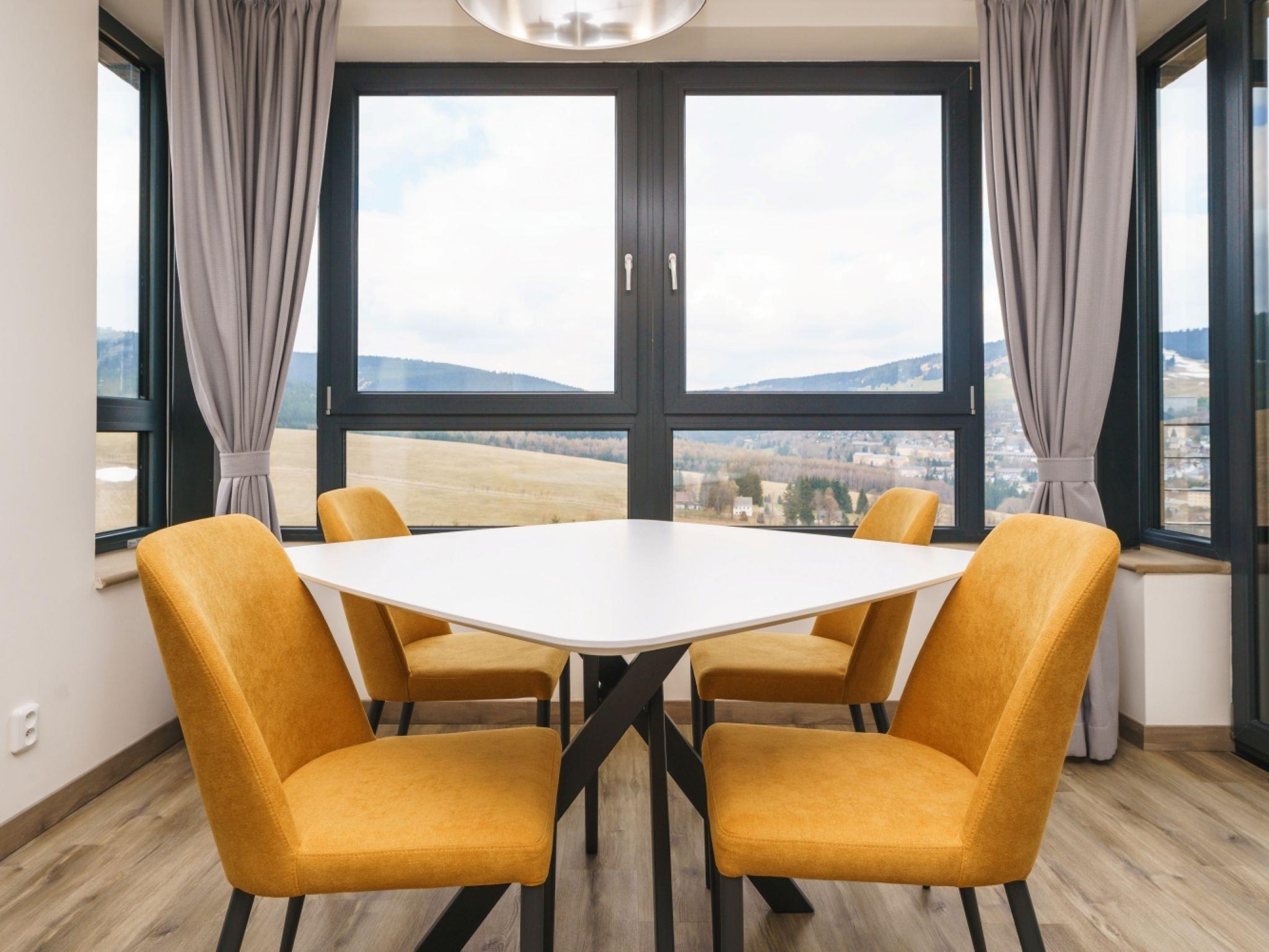"Simba Klínovec", 3-room apartment 68 m2 on 1st floor. Living room with 1 double sofabed. 1 room with 1 double bed. 1 room with 1 double bed. Kitchenette (oven, dishwasher, microwave, electric coffee machine) with dining table and TV. Exit to the balcony. Shower, sep. WC. Balcony. Balcony furniture. View of the mountains. Facilities: Internet (WiFi). Garage. Please note: non-smokers only.