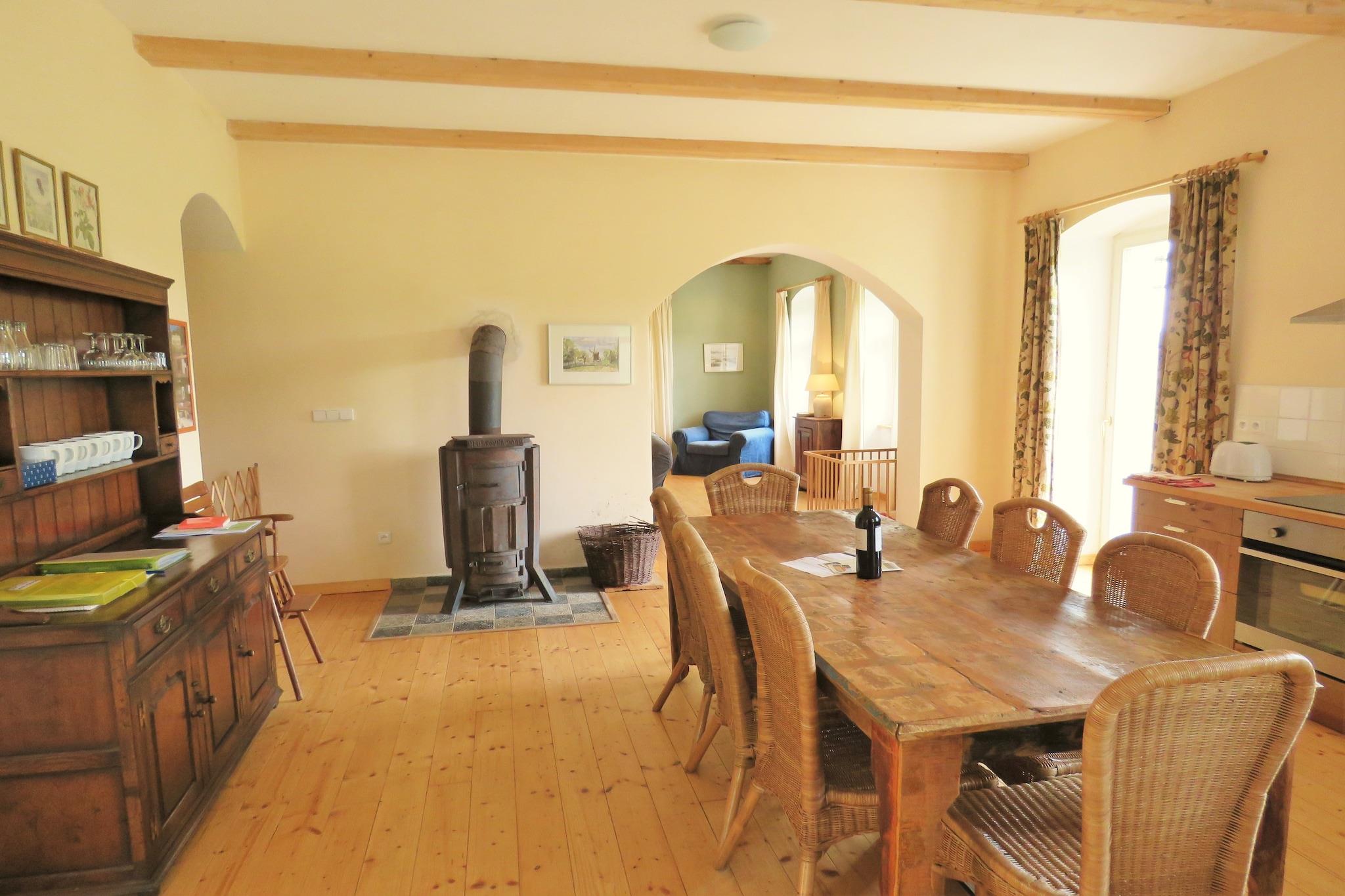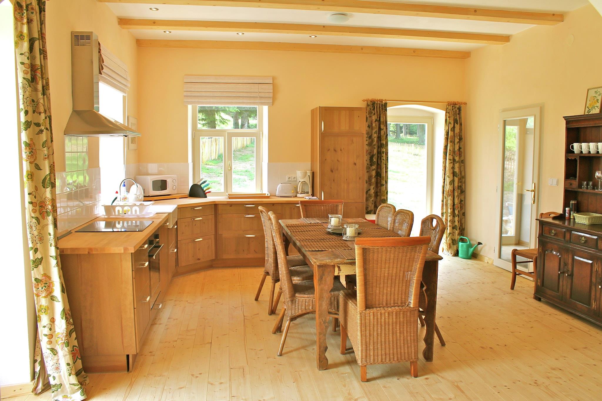 Velkommen til dette charmerende feriehus beliggende i den naturskønne region Milíre, Vestbøhmen. Perfekt til familier eller grupper på op til 8 gæster, dette rummelige oase tilbyder en hyggelig stue med pejs, dvd-afspiller og opholdsområde til afslappende aftener. Det åbne køkken er fuldt udstyret med moderne apparater, herunder en kaffemaskine, opvaskemaskine, ovn, mikroovn og et stort spisebord til 8, ideelt til fælles måltider. Havedøre fører ud til en privat terrasse og have, hvor du kan slappe af eller nyde grillfester med venner og familie. Ovenpå finder du fire komfortable soveværelser, der hver er indrettet med to enkeltsenge, hvilket gør det perfekt til grupper, der søger privatliv og komfort. Huset har to badeværelser - det ene med bruser og toilet, det andet med badekar - og et ekstra separat toilet for nemheds skyld. Familier, der rejser med børn, vil sætte pris på den tilgængelige sandkasse, børneseng, høj stol og kravlegård efter anmodning. Beliggende kun 7 km fra centrum af Tachov og omgivet af smukke skove og søer, tilbyder dette hjem nem adgang til restauranter, butikker og udendørs aktiviteter. Offentlig transport er tæt på, og parkering er tilgængelig på stedet, hvilket sikrer et behageligt og mindeværdigt ophold i hjertet af det vestlige Bøhmen.