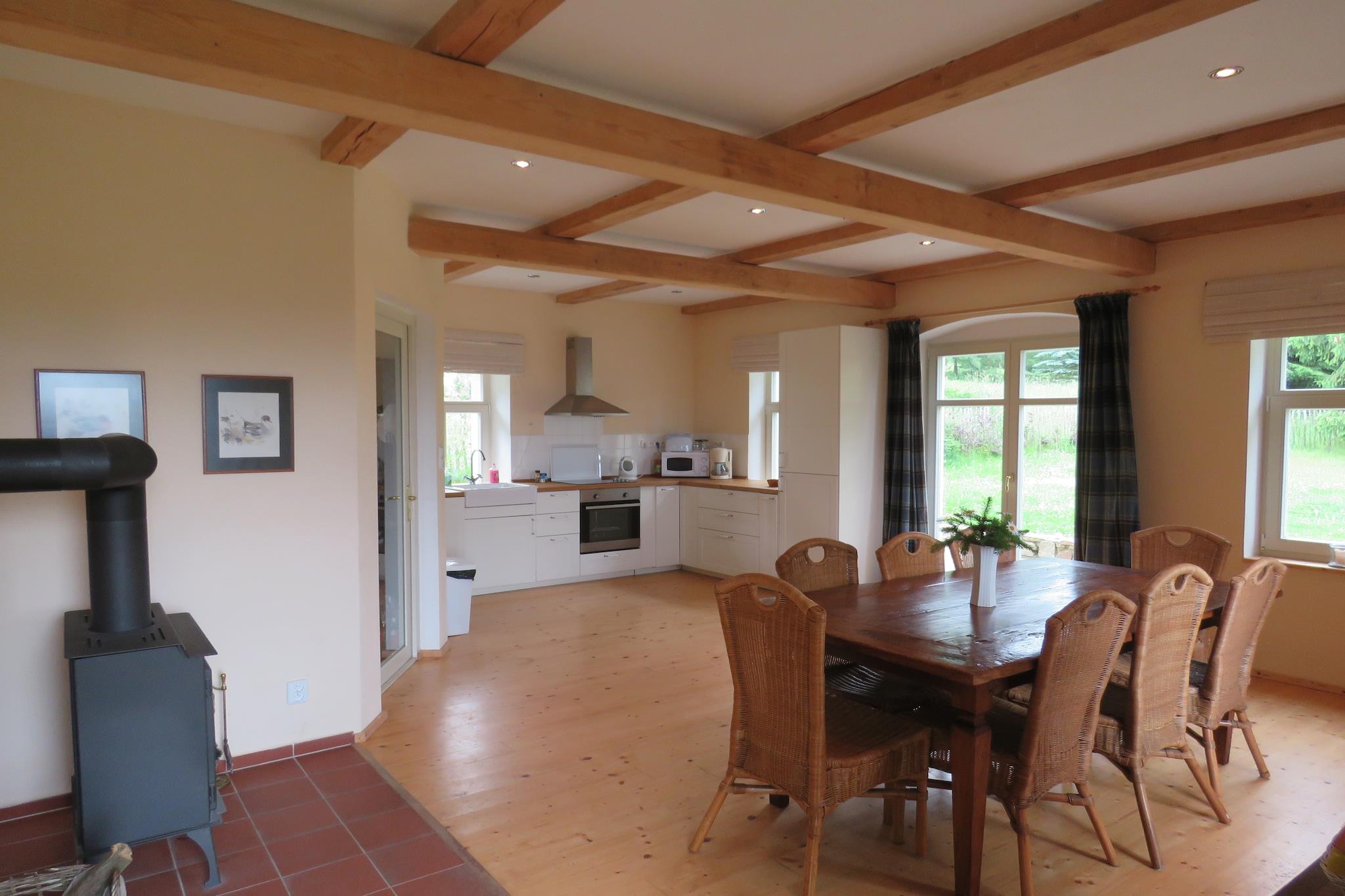 Stueetage: (Stue(pejs, sofahjørne, DVD-afspiller, radio), åbent køkken(spisebord(8 personer), kakkelovn(træ), elkedel, komfur(Komfur med fire kogeplader, elektrisk), kaffemaskine, ovn, mikrobølgeovn, opvaskemaskine , køle-fryseskab), toilet) På 1. etage: (soveværelse(2x enkeltseng(90 x 200 cm)), soveværelse(2x enkeltseng(dynebetræk, 90 x 200 cm)), soveværelse(2x enkeltseng(dynebetræk, 90 x 200 cm)), soveværelse(2x enkeltseng(dynebetræk, 90 x 200 cm)), badeværelse(bruser, håndvask, toilet), badeværelse(badekar, håndvask, toilet), Repos(trappegitter)) veranda, DVD-afspiller, terrasse(privat), have(privat, indhegnet, > 1000 m2), havemøbler, grill, parkering, sandkasse, barneseng, barnestol(på anmodning), kravlegård(på anmodning)