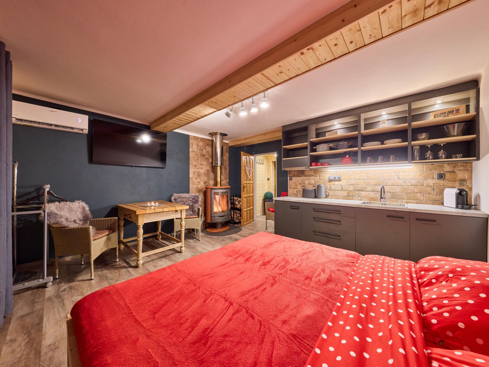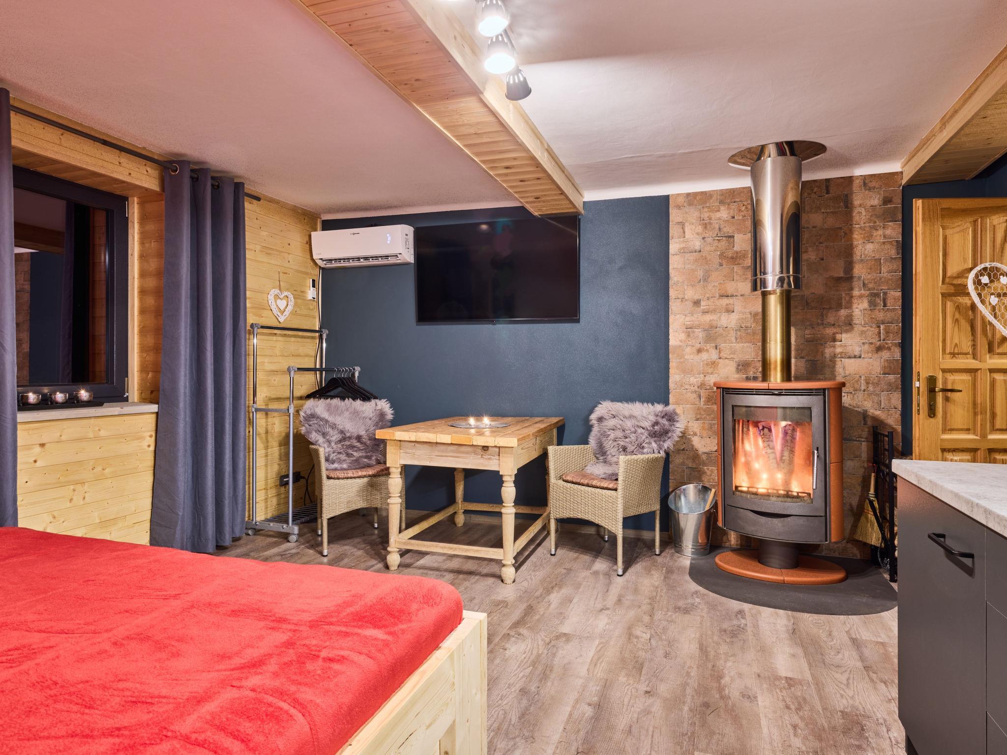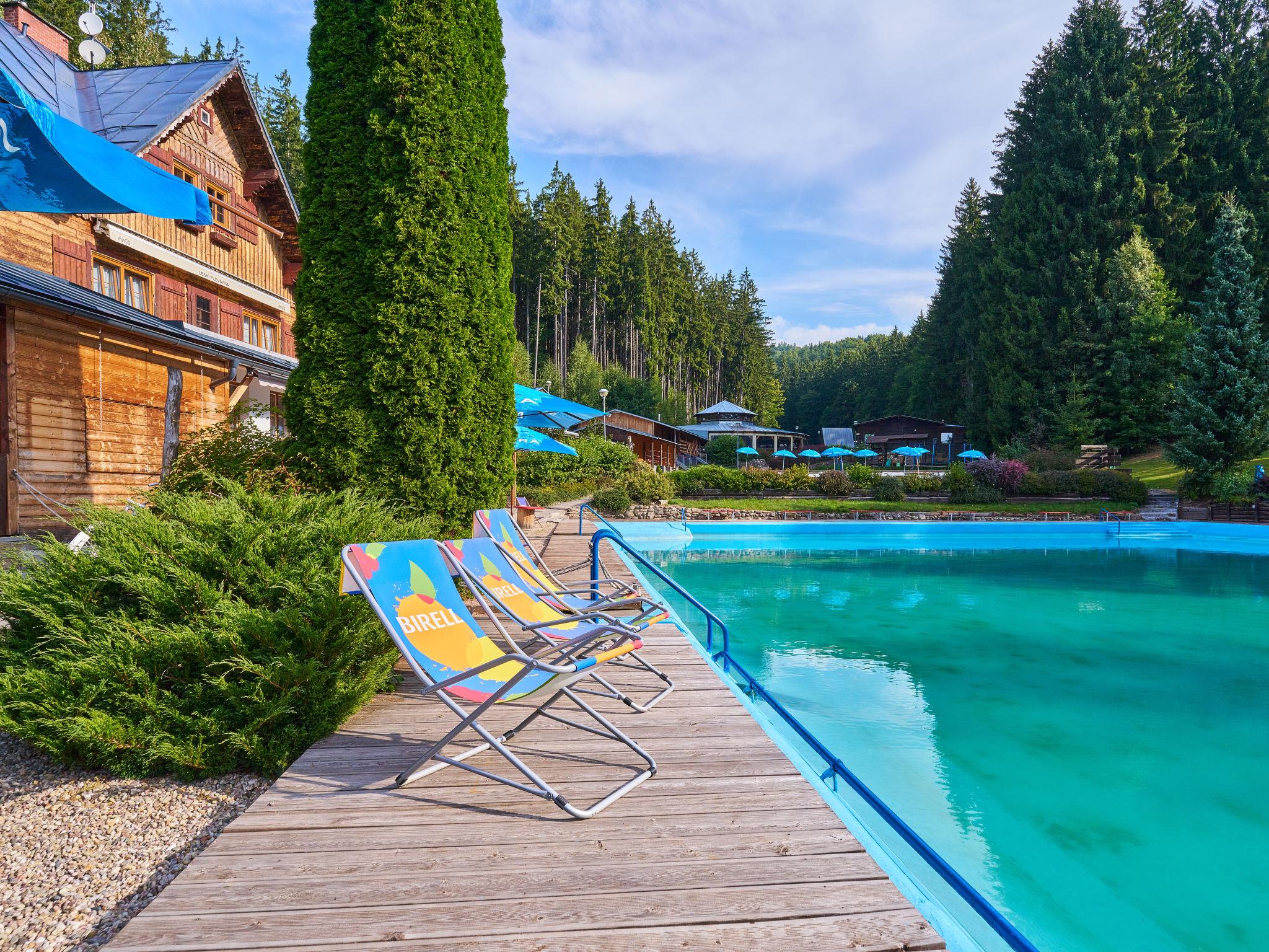 "Lesní plovárna", 1-room studio. Comfortable furnishings: living/sleeping room with 1 double bed, Scandinavian wood stove, dining table and TV (flat screen). Kitchenette (2 hot plates, toaster, kettle, microwave, electric coffee machine, Capsules for coffee machine (Tchibo)). Shower/WC. Electric heating, wood heating, air-conditioning. Terrace. Terrace furniture, barbecue (portable), deck chairs. Facilities: Internet (WiFi, free). Please note: suitable for families. Non-smoking house. 1 small pet/ dog allowed.