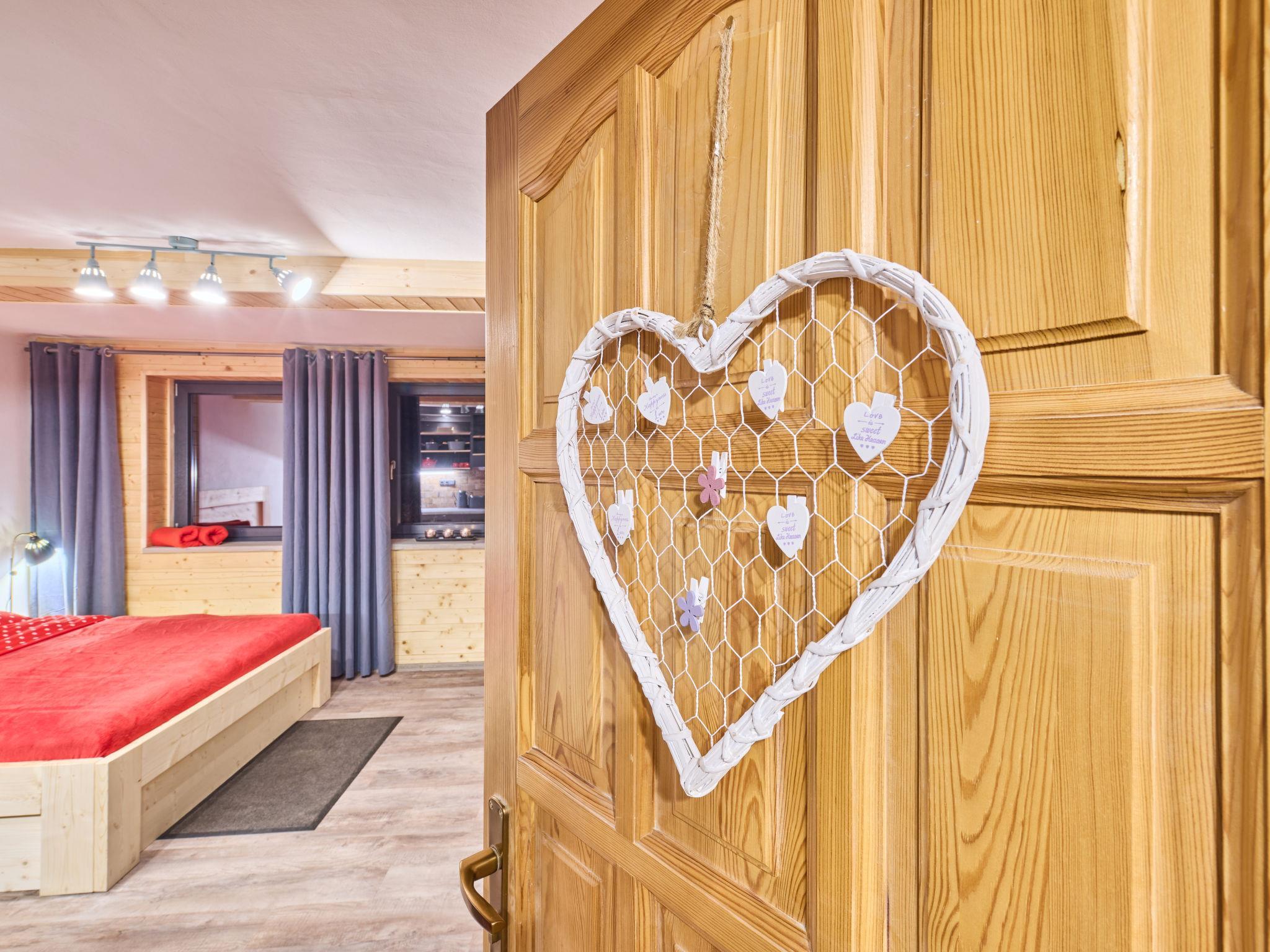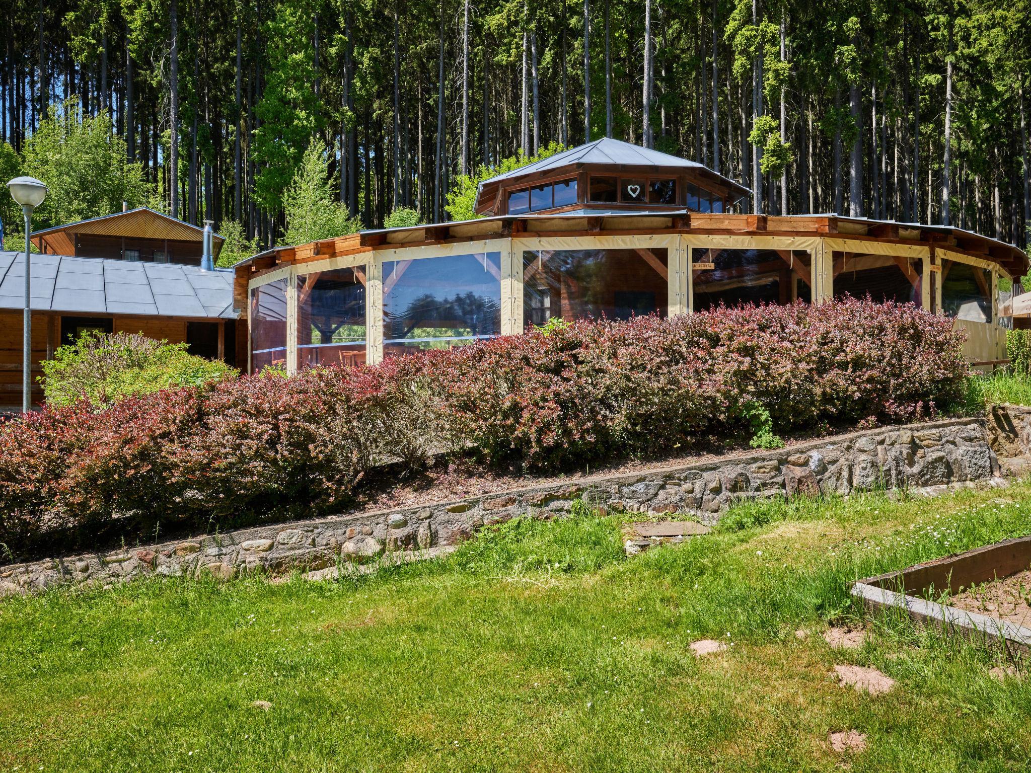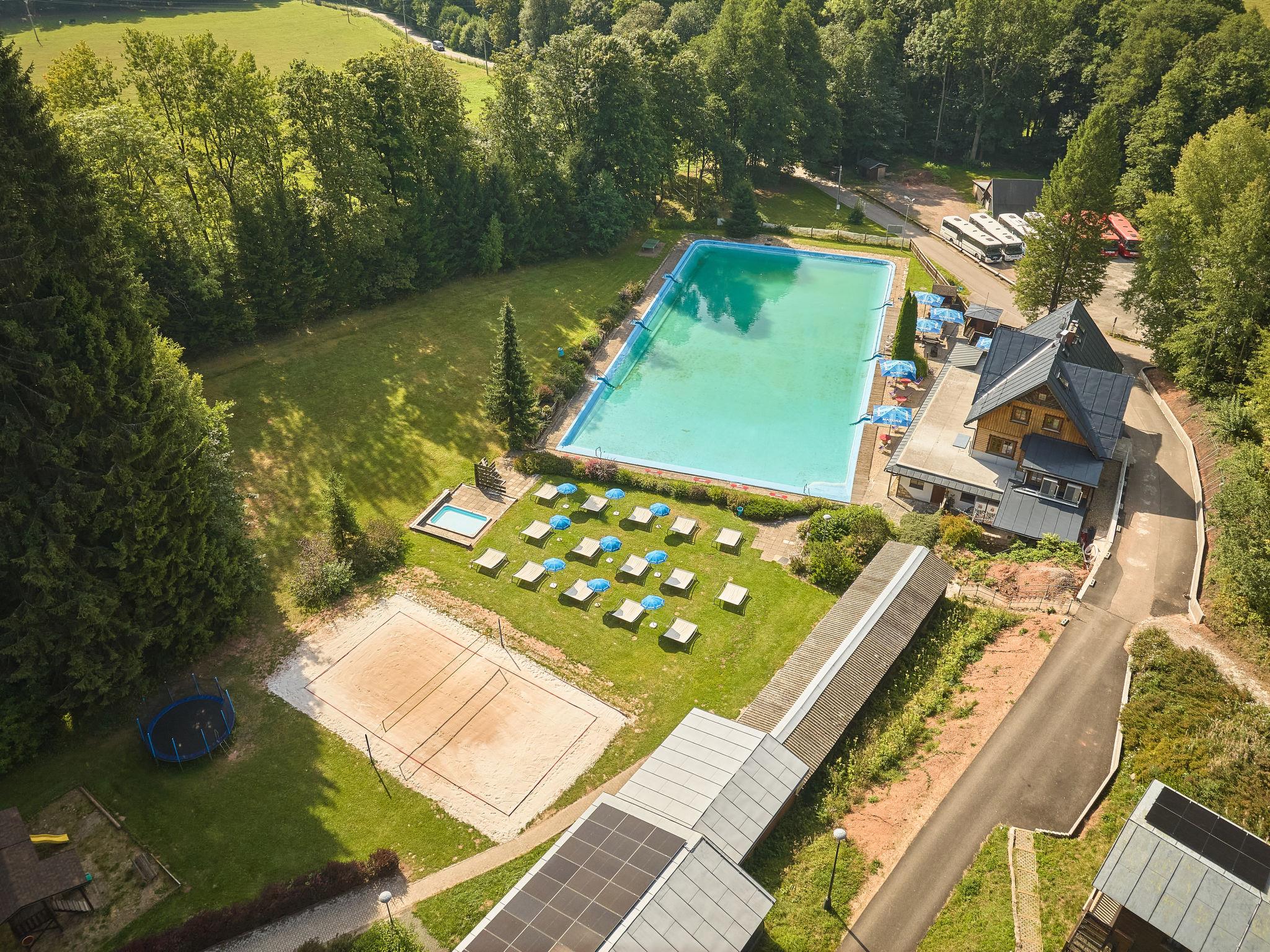 Comfortable house. 7 houses in the resort. Outside the resort, in a quiet, sunny position, 50 m from the edge of the forest, 2 km from the skiing area. For shared use: natural state property, lawn for sunbathing, swimming pool (seasonal availability: 26.Jun. - 03.Sep.). Shower/WC in the pool area, table tennis, boccia, badminton, beach volleyball, barbecue, fireplace. Private: patio. In the house: storage room for bicycles, sun terrace. Parking at the house. E-charging station. Grocery 1.5 km, shopping centre 6 km, restaurant 5.5 km, bus stop "Mladé Buky" 1.5 km, railway station "Mladé Buky" 1.5 km, indoor swimming pool 10 km. Golf course (18 hole) 4 km, riding stable 3.5 km, walking paths from the house, cycle lane 50 m, ski rental 2.5 km, ski bus stop 50 m, ski school 2.5 km, children's ski school 2.5 km, sled run 2 km, cross country ski track 500 m, children's playground 50 m. Nearby attractions: zábavní park Balduv svet, 2.5 km, Rozhledna Eliška, tvrz Stachelberg 9 km, Stezka Korunami stromu Janské Lázne 10 km, Lanovka na Snežku, Pec pod Snežkou 18 km, Zoo Dvur Králové, Adršpach 28 km, Vyhlídkové lety Vrchlabí, Kuks 30 km. Well-known ski regions can easily be reached: Mladé Buky 2 km, Janské Lázne 9 km, Cerný Dul, Pec-Cerná hora 15 km. Hiking paths: Krkonošský národní park.